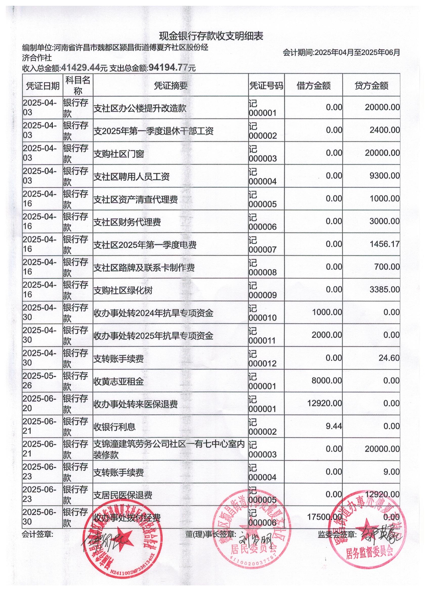 颍昌办事处傅夏齐社区2025年第二季度银行存款收支公开表