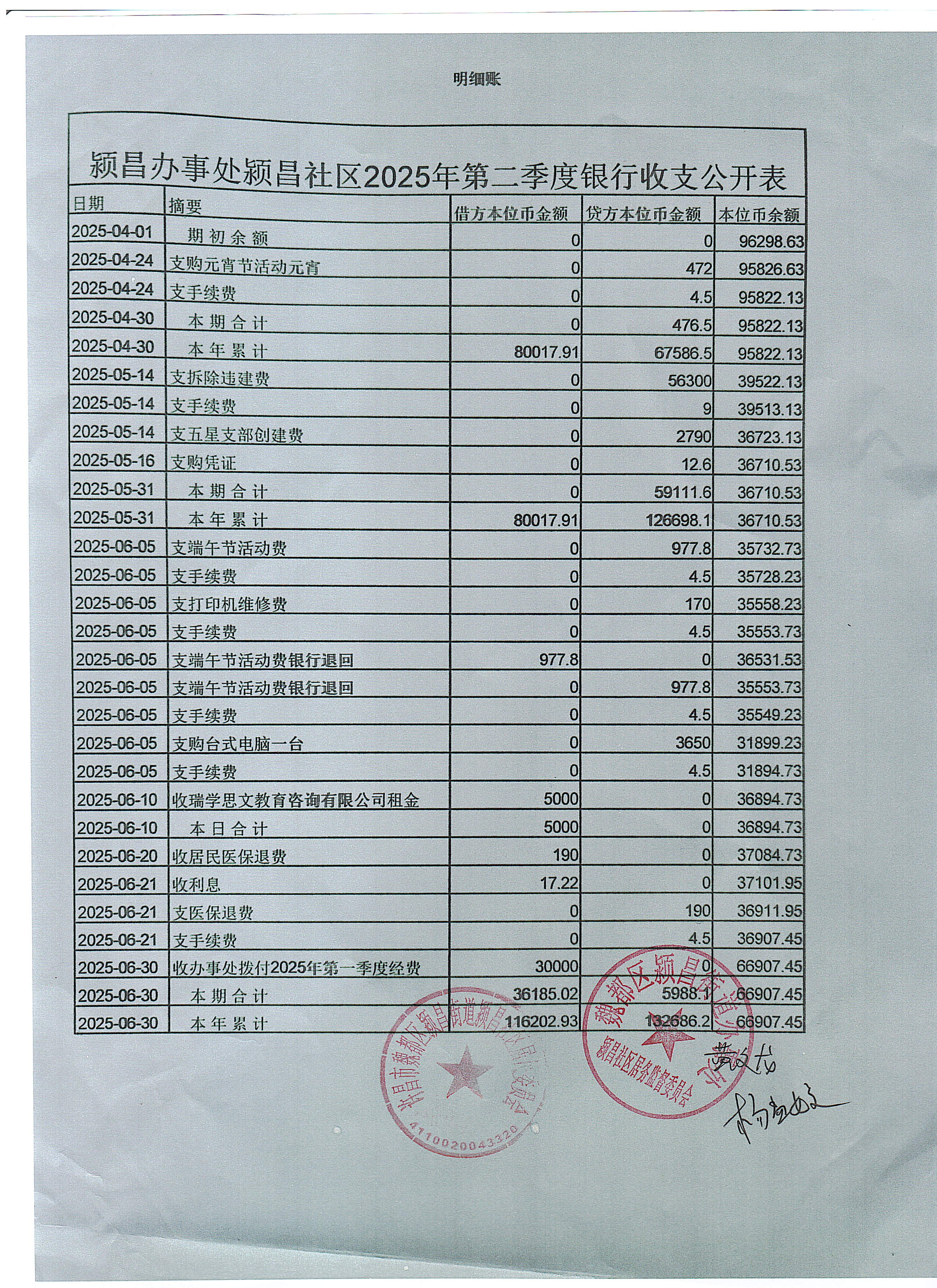 颍昌办事处颍昌社区2025年第二季度银行存款收支公开表