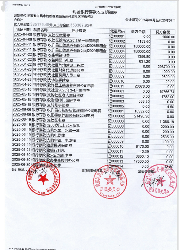 颍昌办事处孙庙社区2025年第二季度银行存款收支公开表