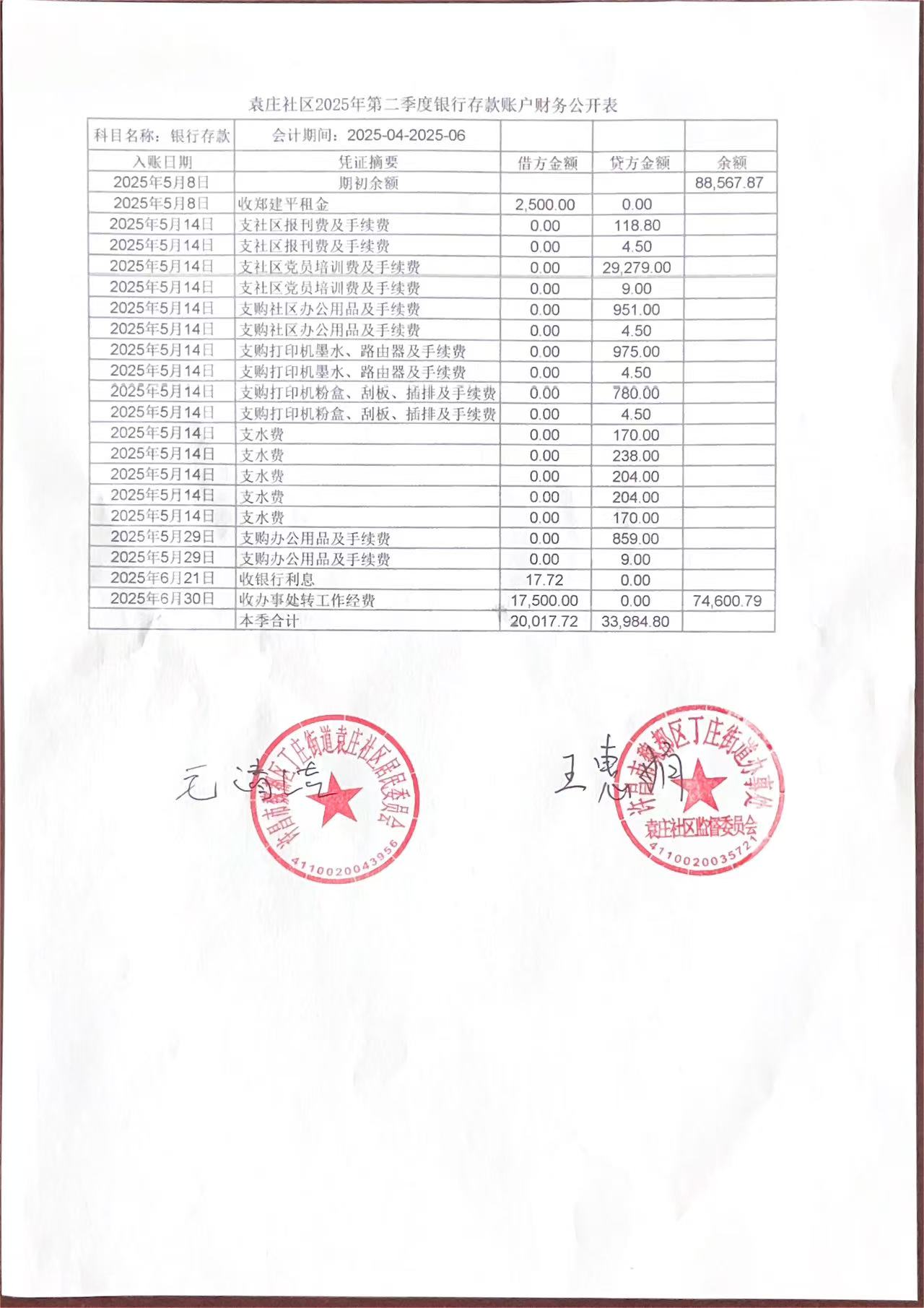 丁庄街道办事处袁庄社区2025年第二季度银行存款收支公开表