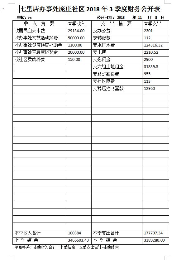 七里店办事处庞庄社区2018年第三季度财务公开表
