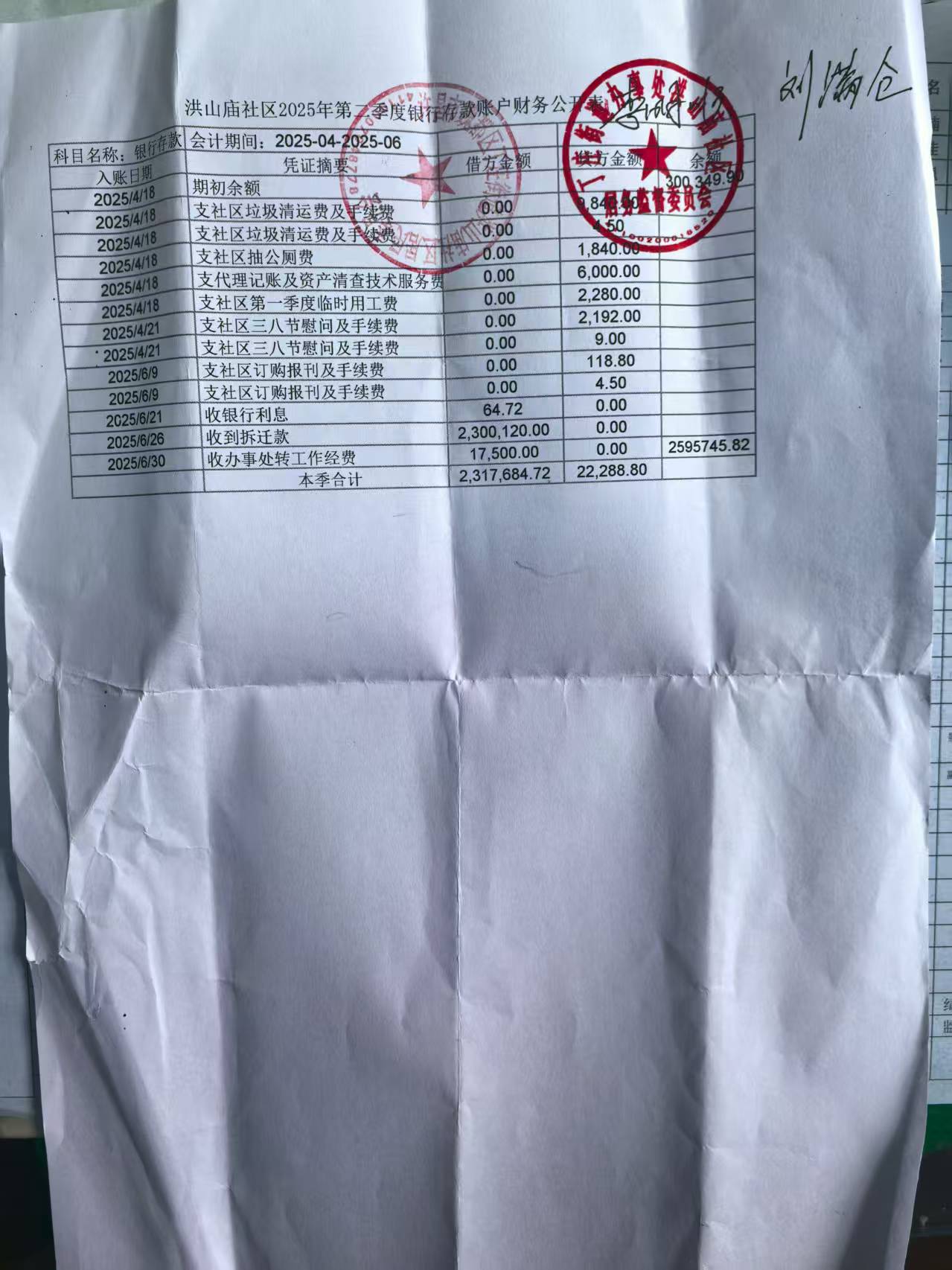 丁庄街道办事处洪山庙社区2025年第二季度银行存款收支公开表