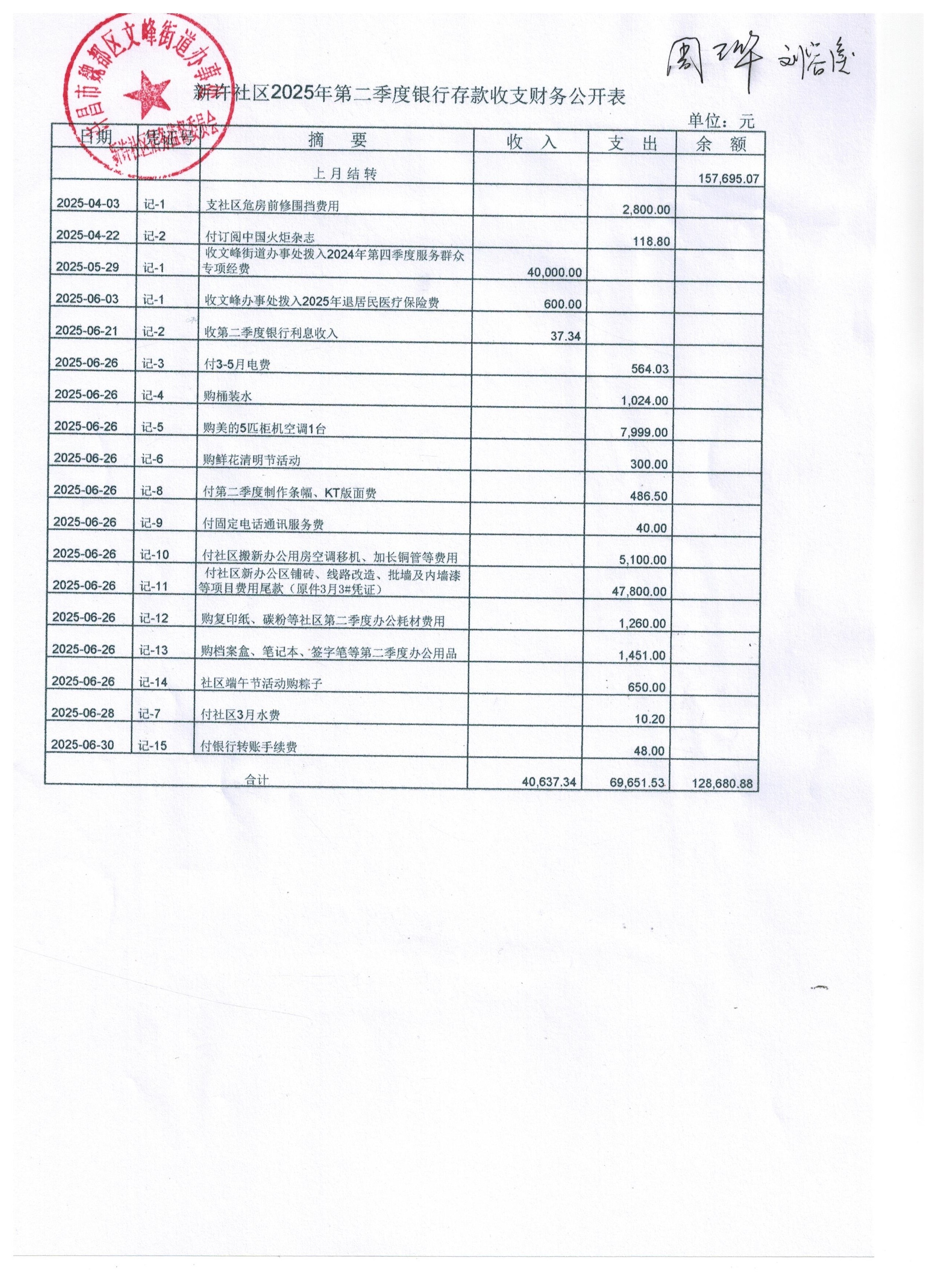 文峰办事处新许社区2025年第二季度银行存款收支公开表