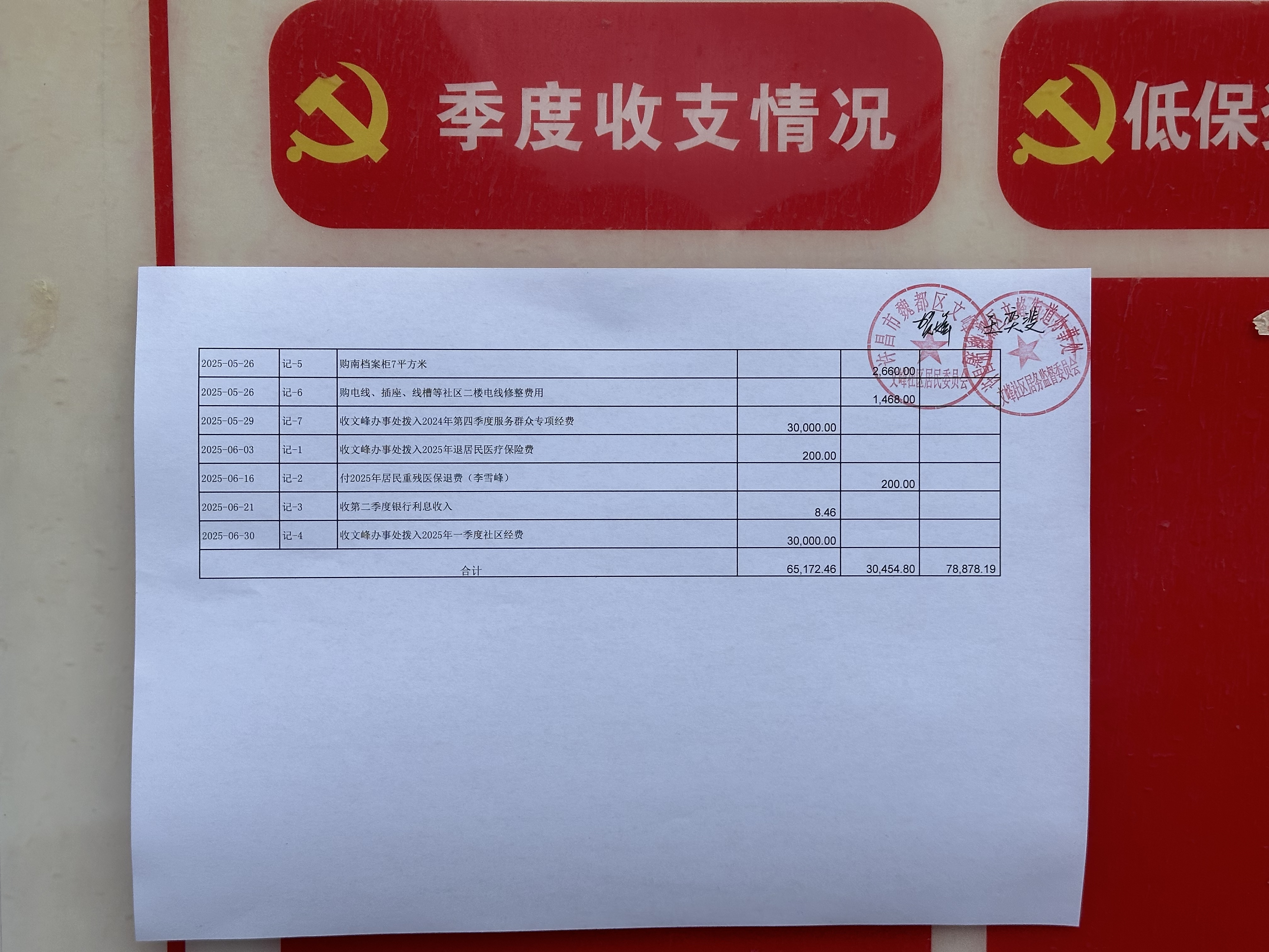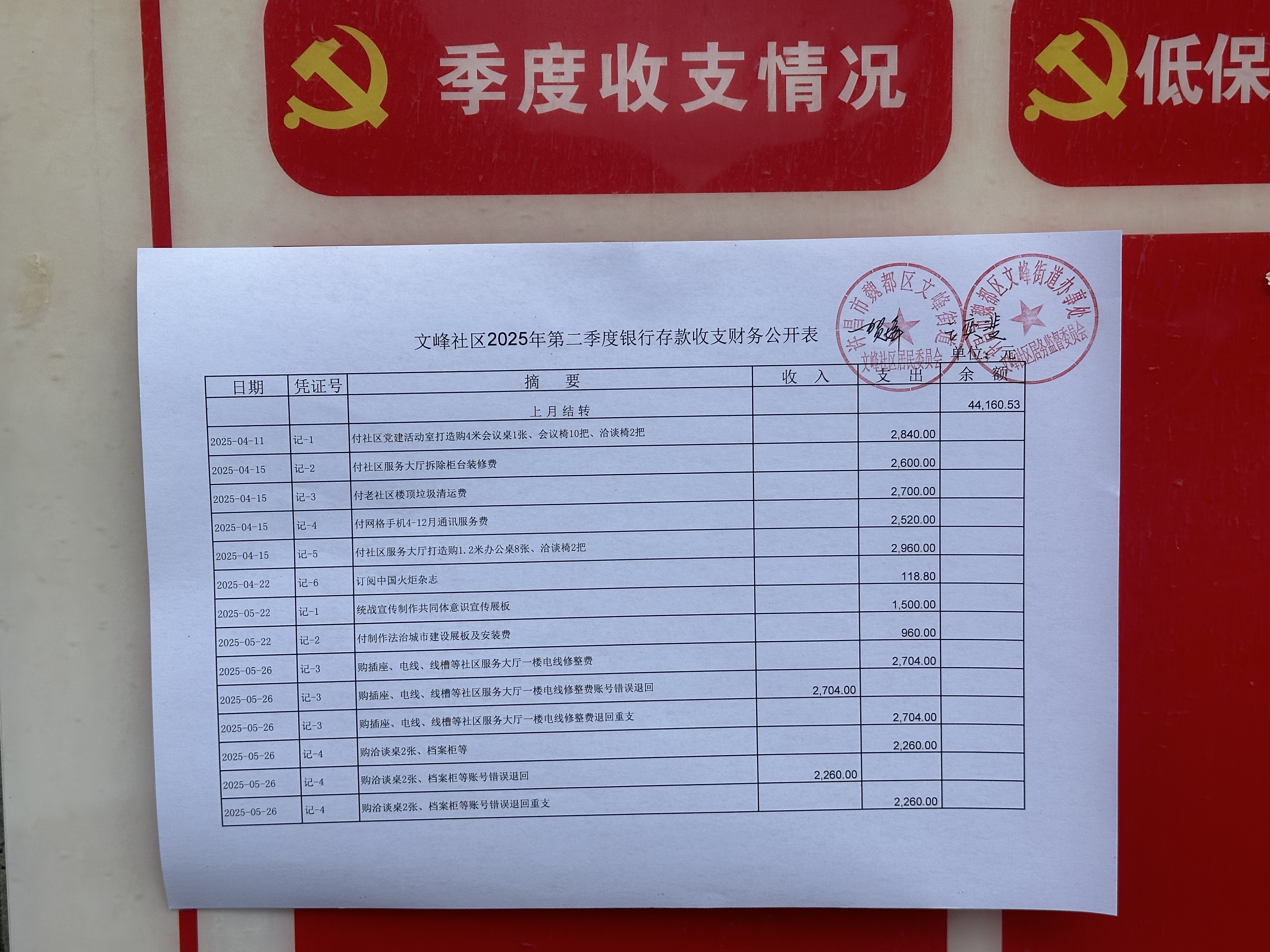 文峰街道办事处文峰社区2025年第二季度银行存款收支公开表