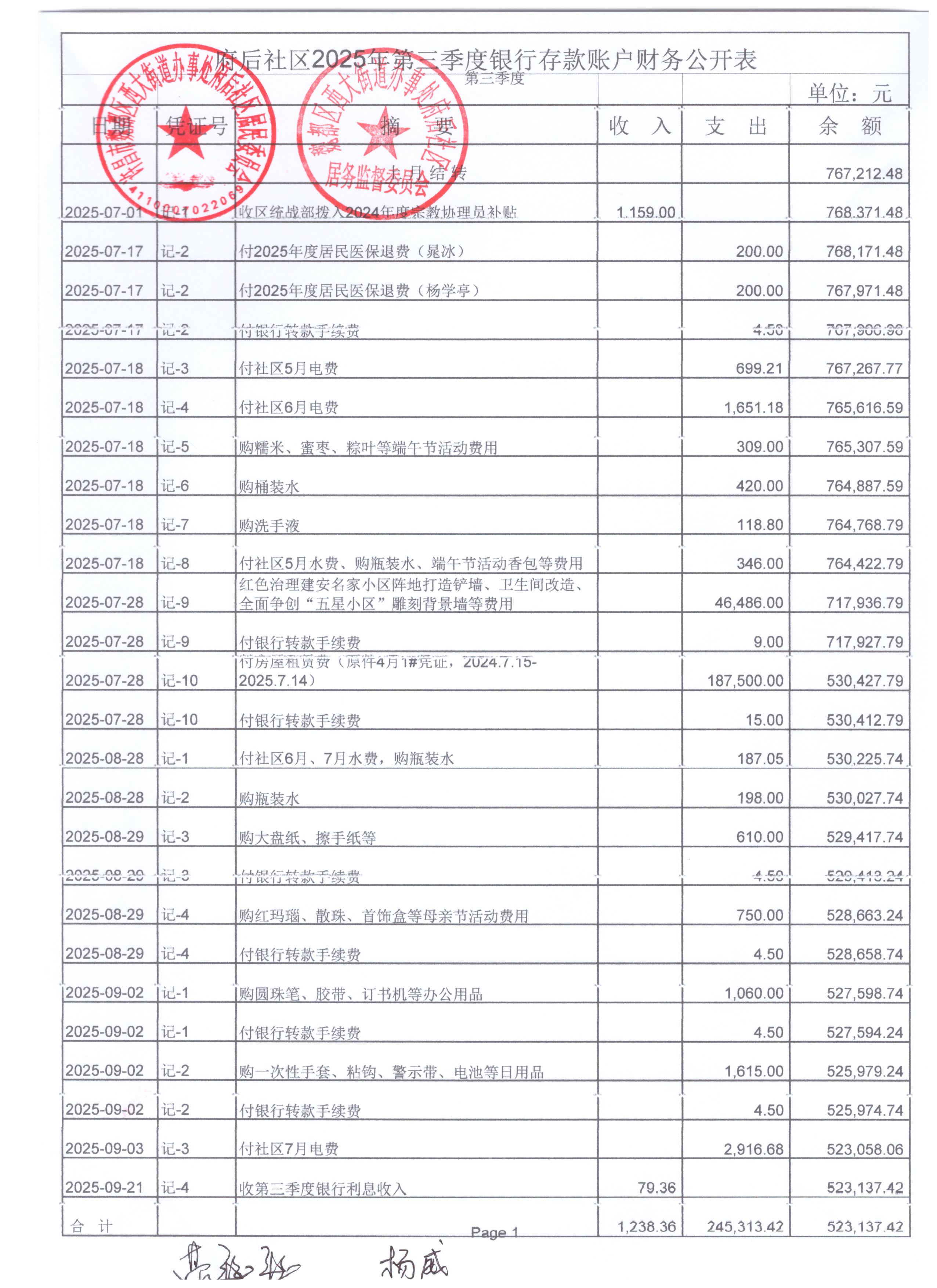 西大街道办事处府后社区2025年第三季度银行存款收支公开表