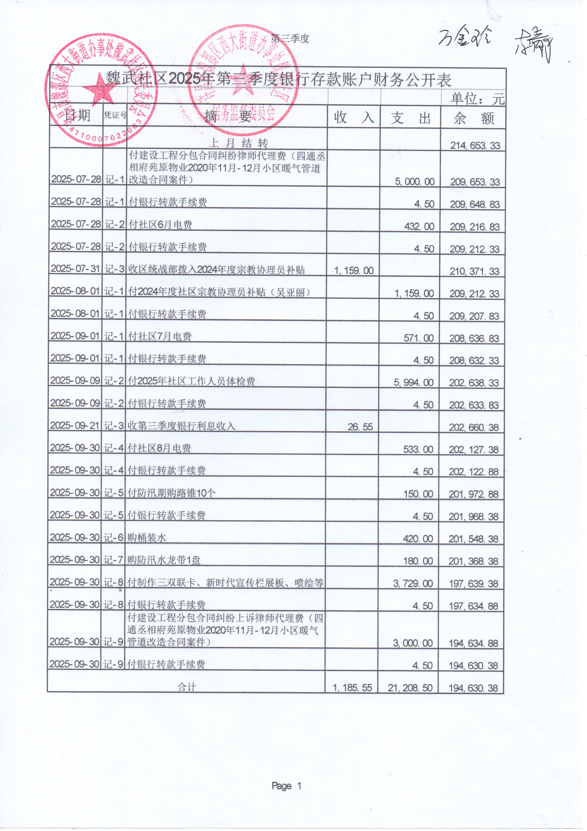 西大街道办事处魏武社区2025年第三季度银行存款收支公开表