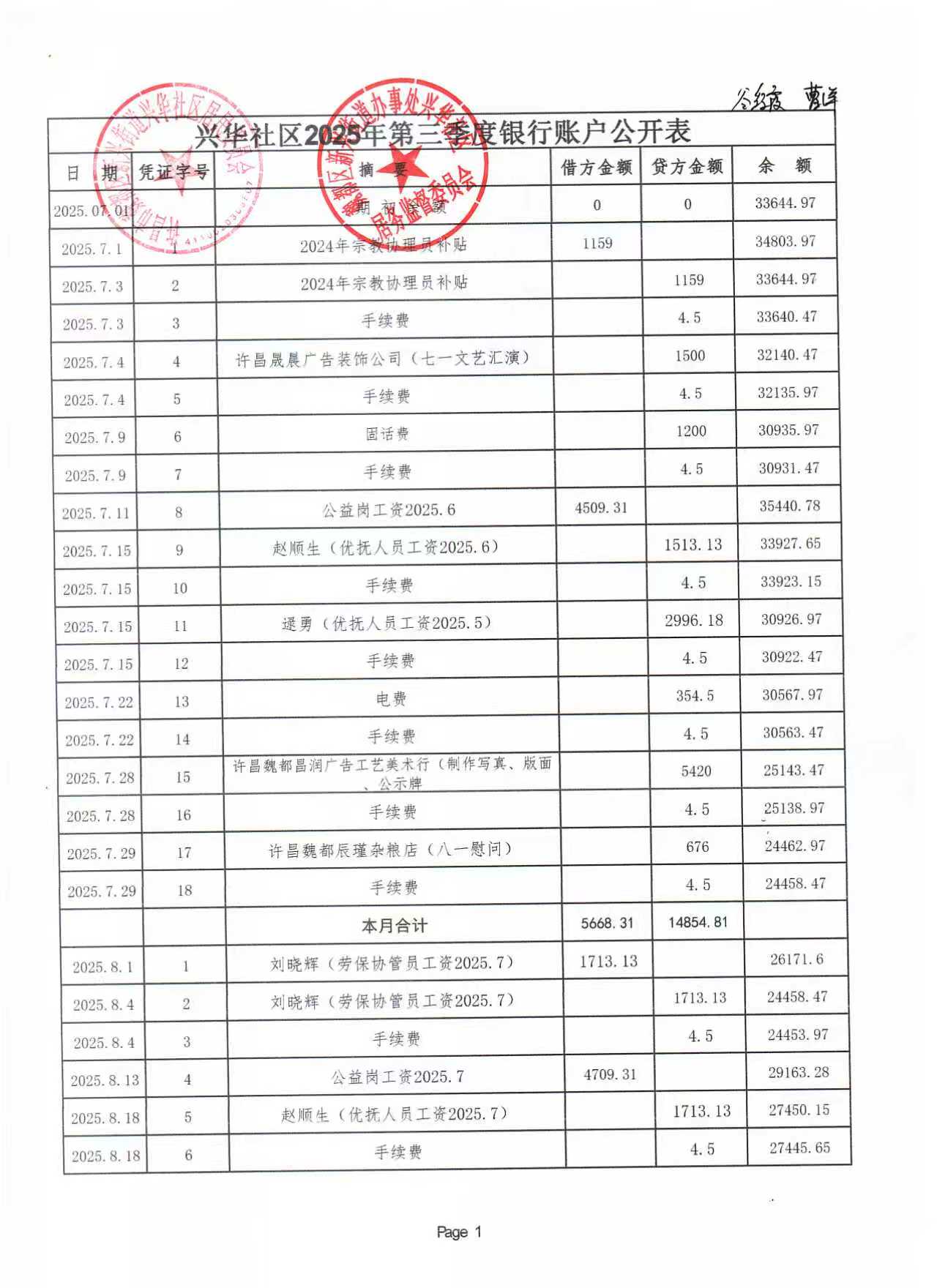 新兴街道办事处兴华社区2025年第三季度银行存款收支公开表