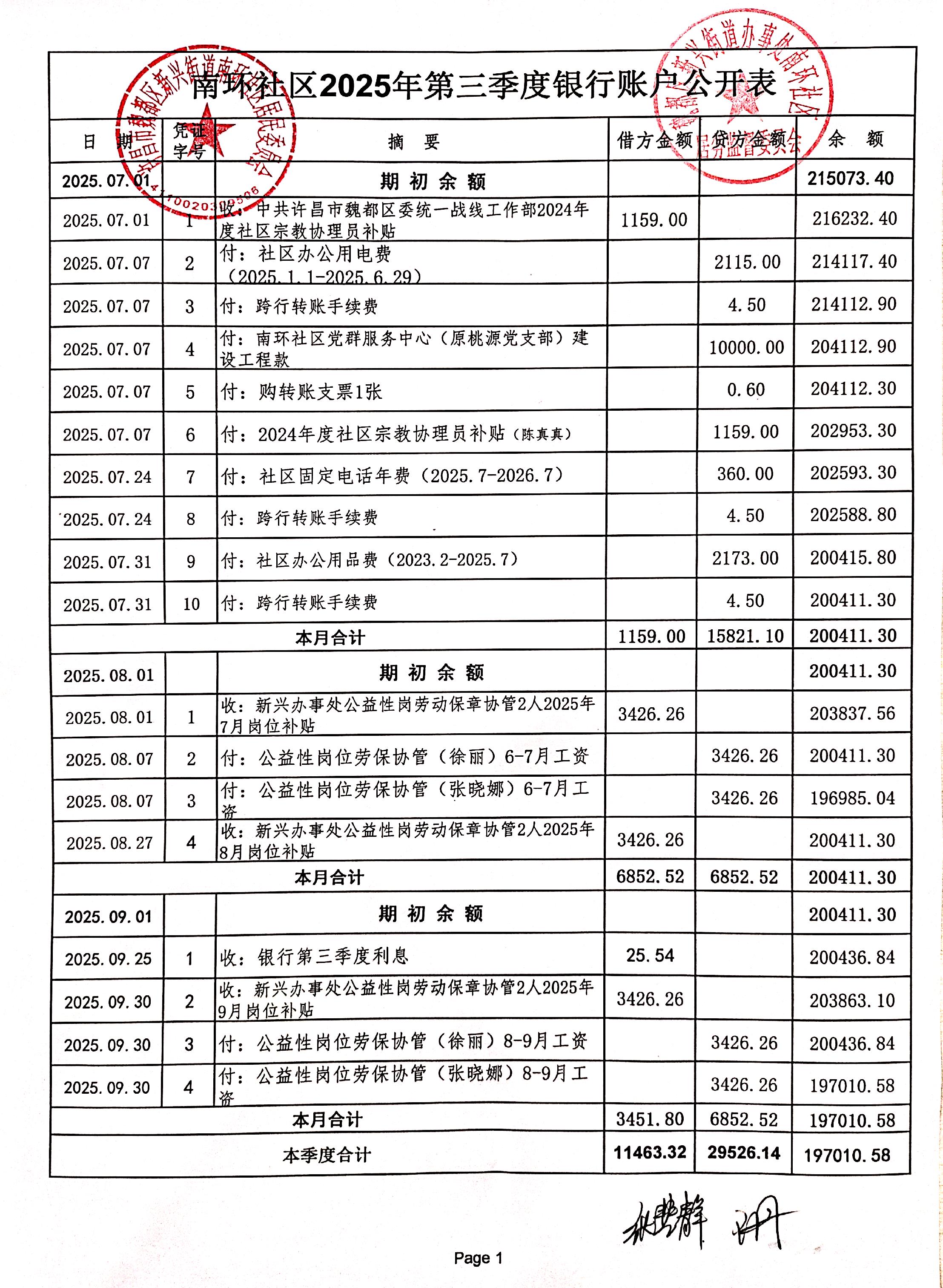 新兴街道办事处南环社区2025年第三季度银行存款收支公开表