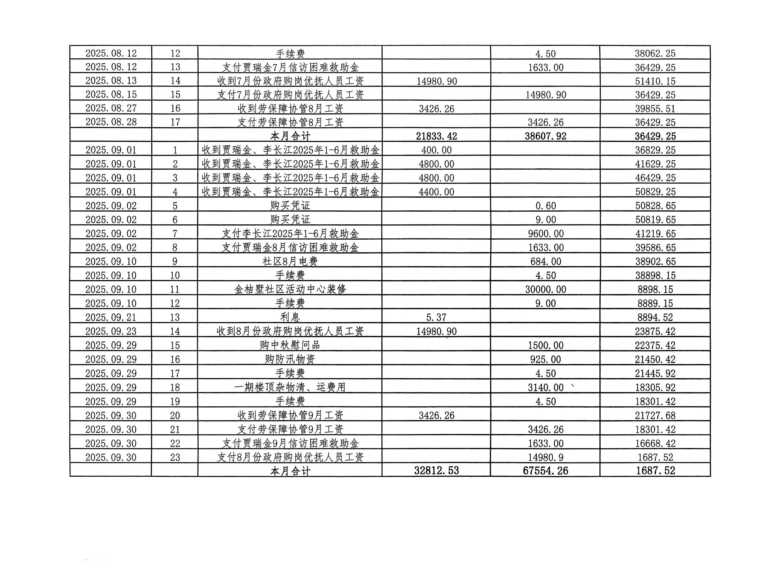 西关街道办事处三李社区2025年第三季度银行存款收支公开表