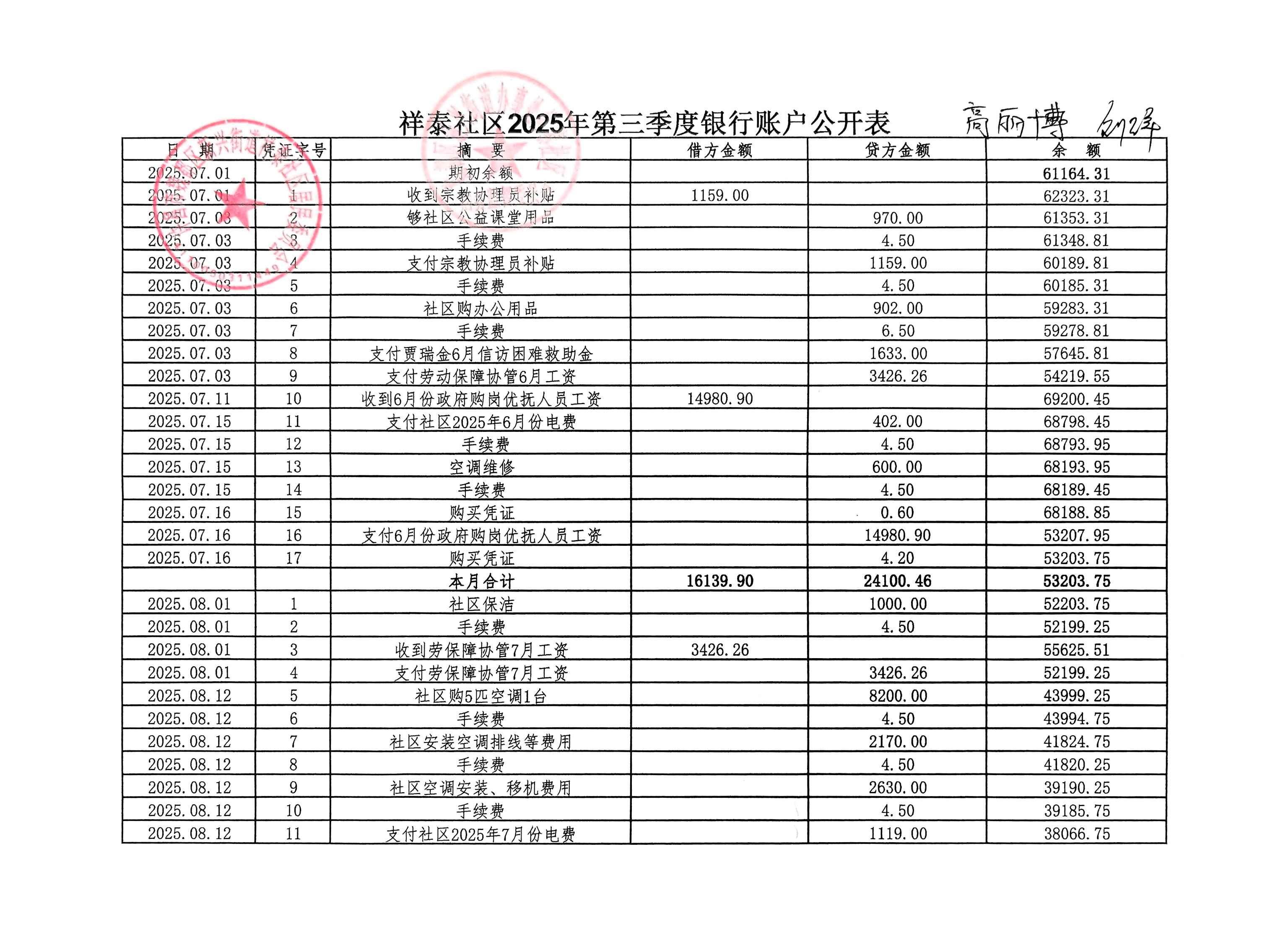 新兴街道办事处祥泰社区2025年第三季度银行存款收支公开表