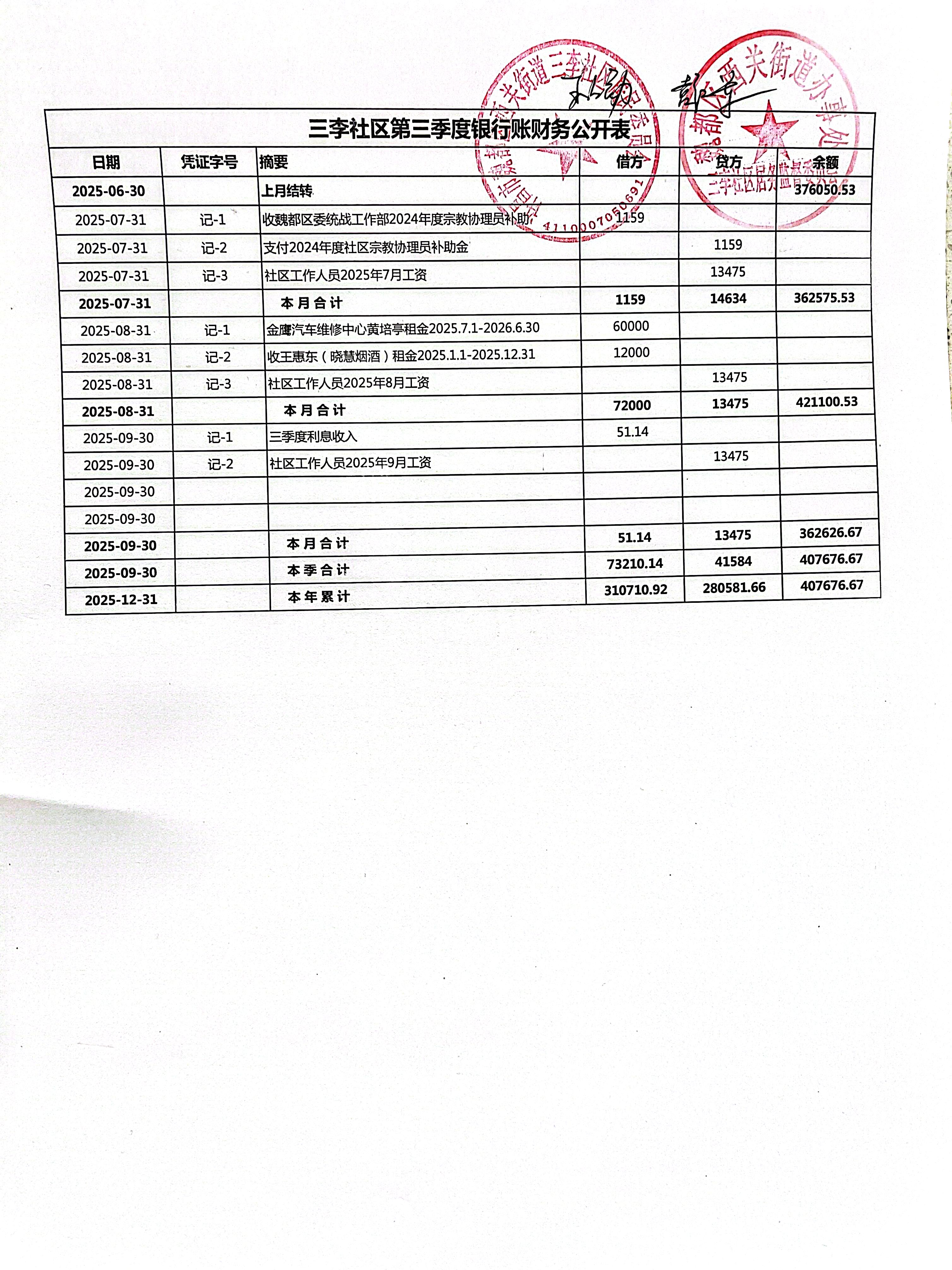 西关街道办事处三李社区2025年第三季度银行存款收支公开表