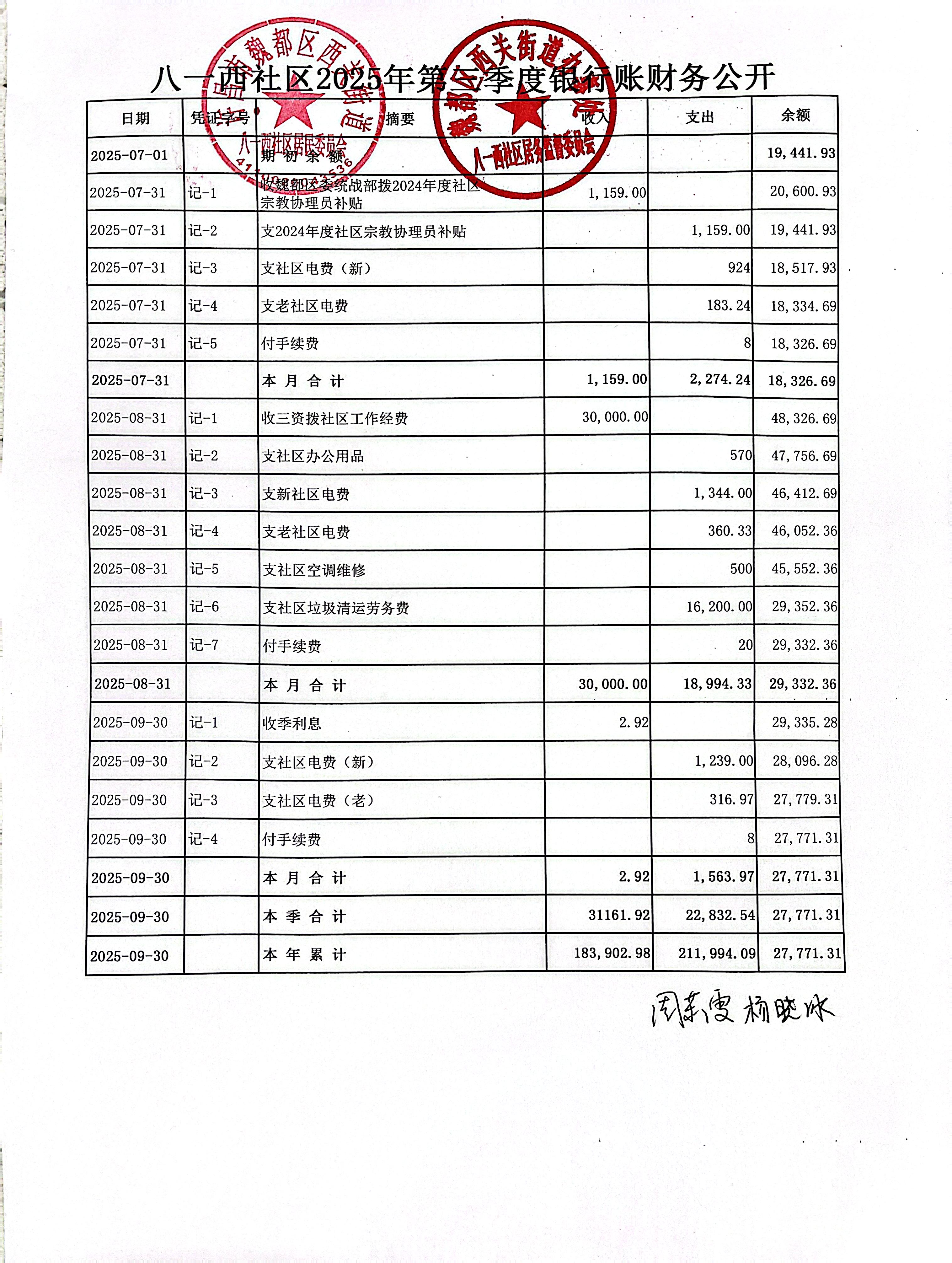 西关街道办事处八一西社区2025年第三季度银行存款收支公开表