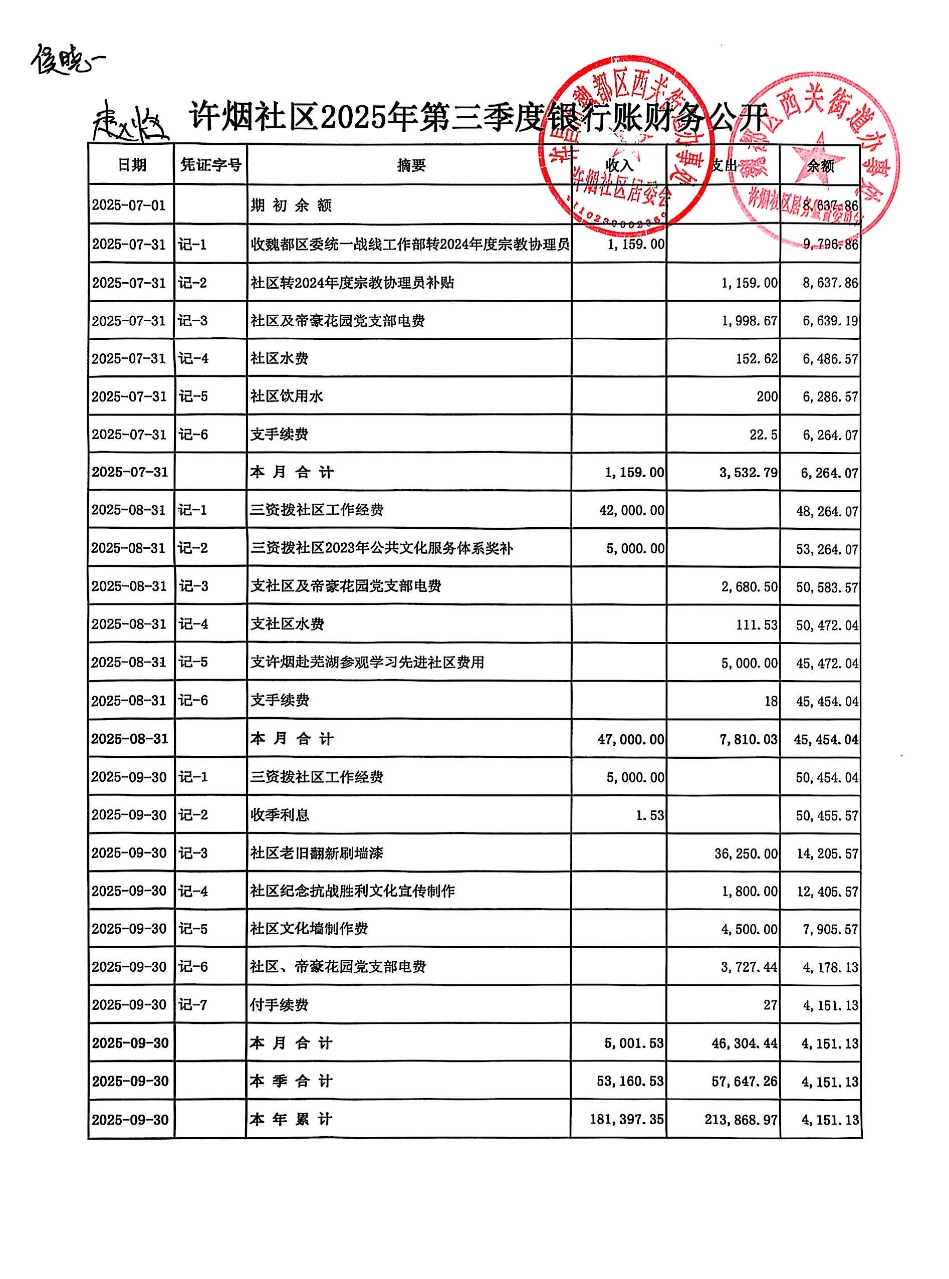 西关街道办事处许烟社区2025年第三季度银行存款收支公开表