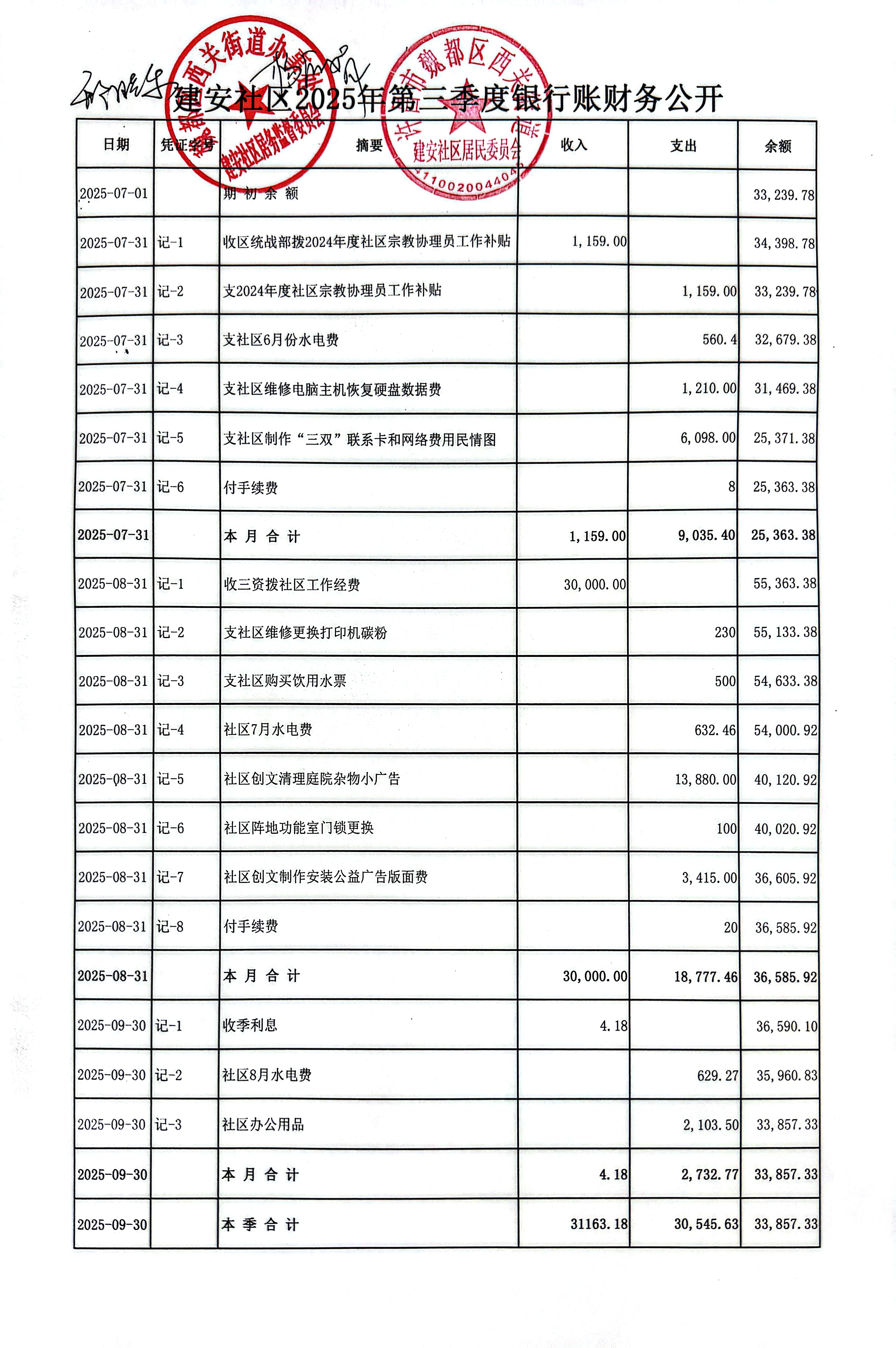 西关街道办事处建安社区2025年第三季度银行存款收支公开表