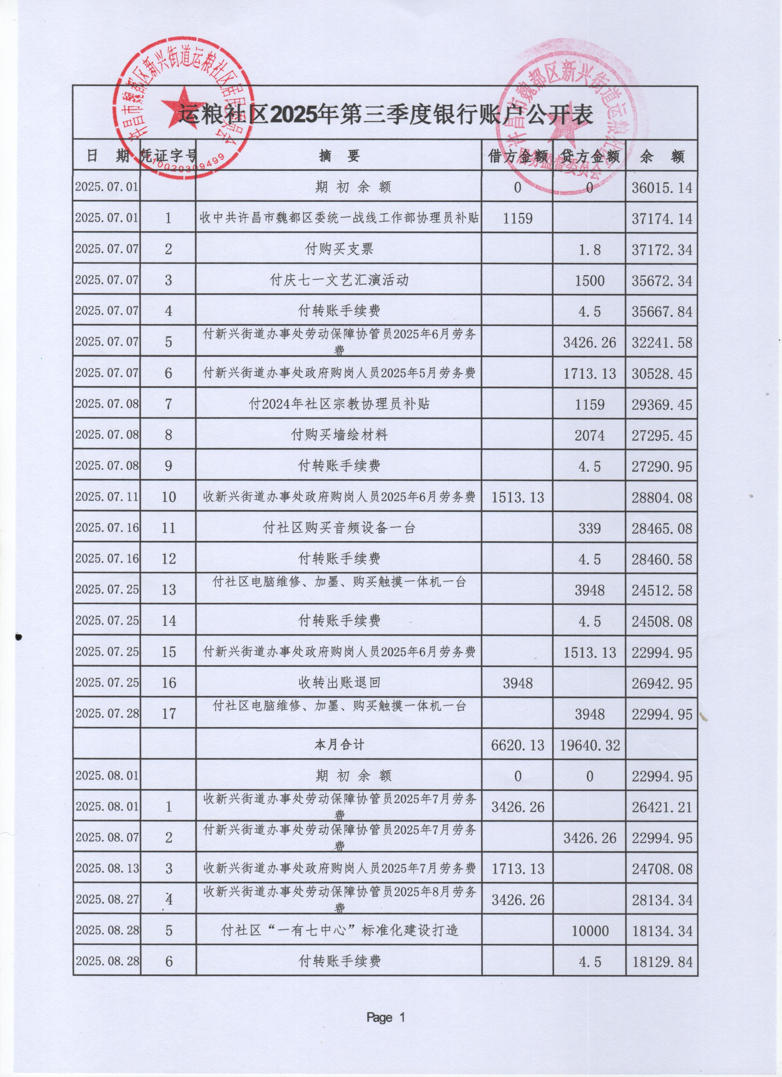 新兴街道办事处运粮社区2025年第三季度银行存款收支公开表