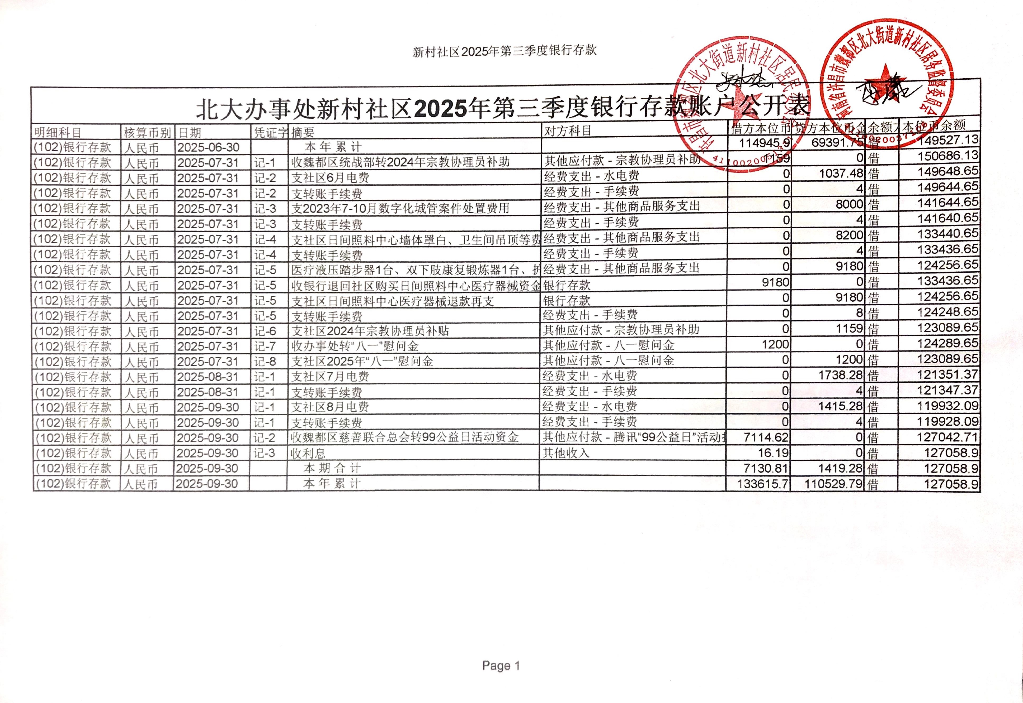 北大街道办事处新村社区2025年第三季度银行存款收支公开表
