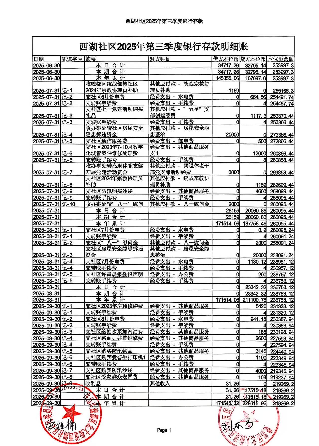 北大街道办事处西湖社区2025年第三季度银行存款收支公开表