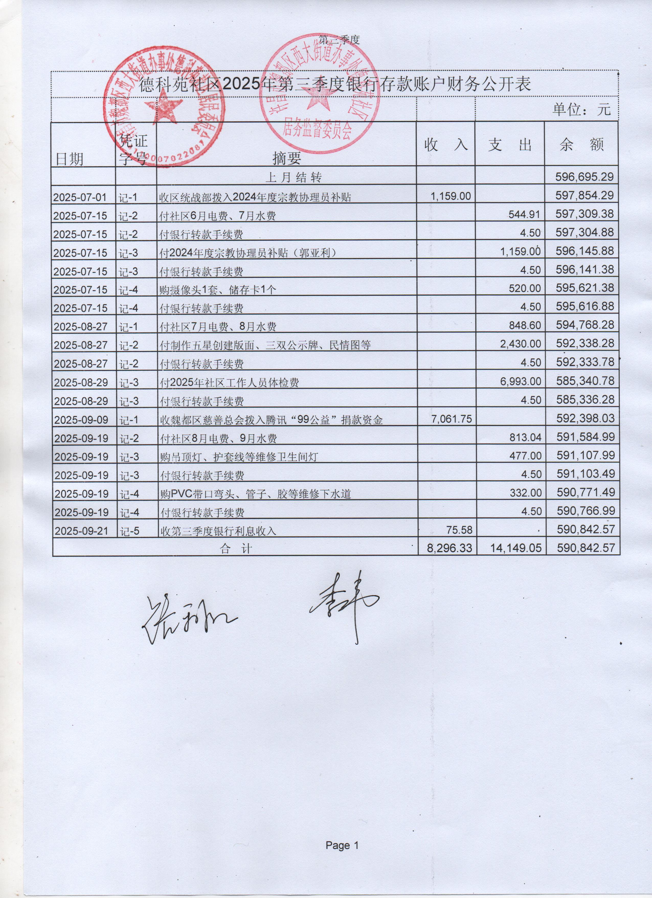 西大街道办事处德科苑社区2025年第三季度银行存款收支公开表