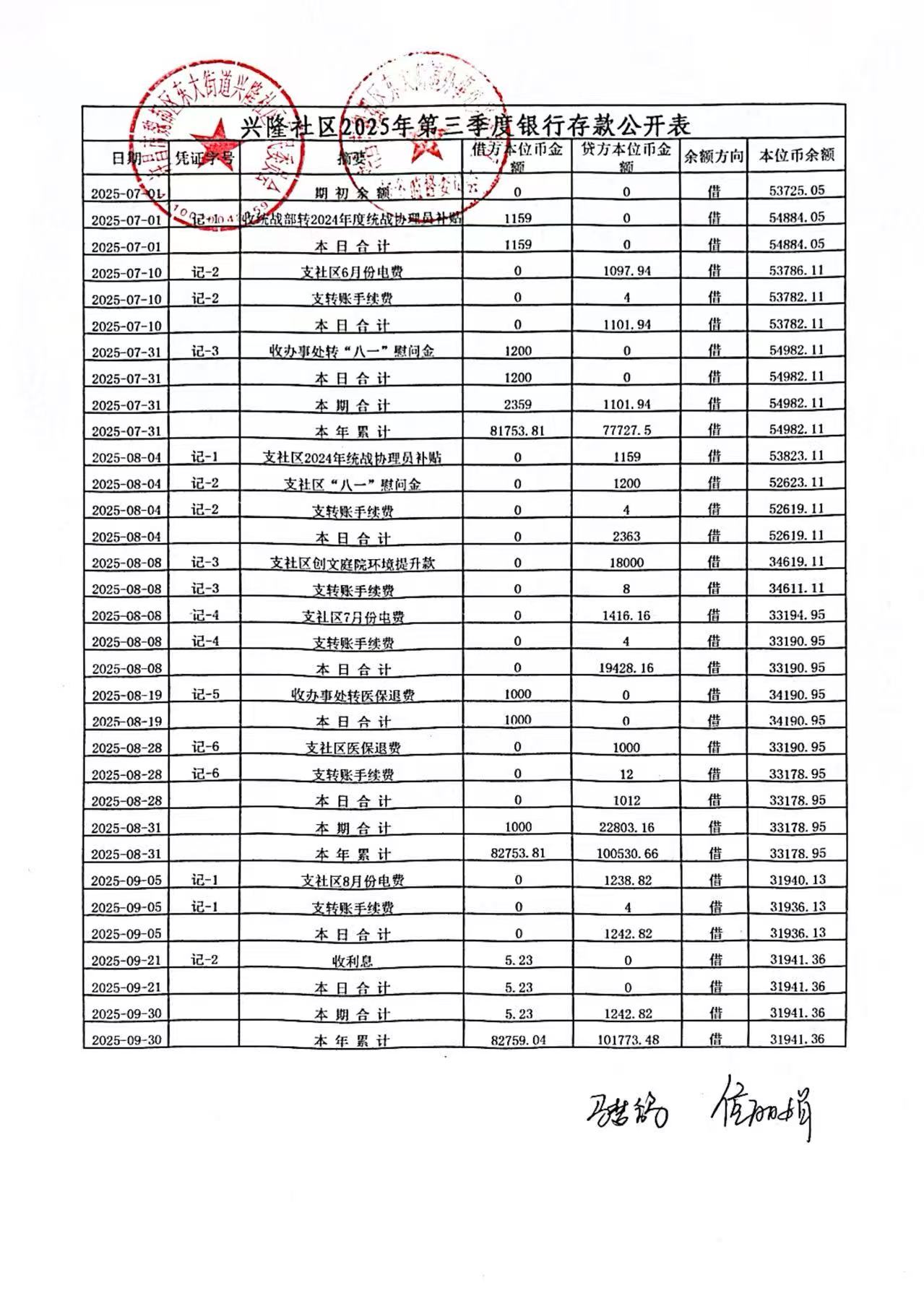 东大街道办事处兴隆社区2025年第三季度银行存款收支公开表