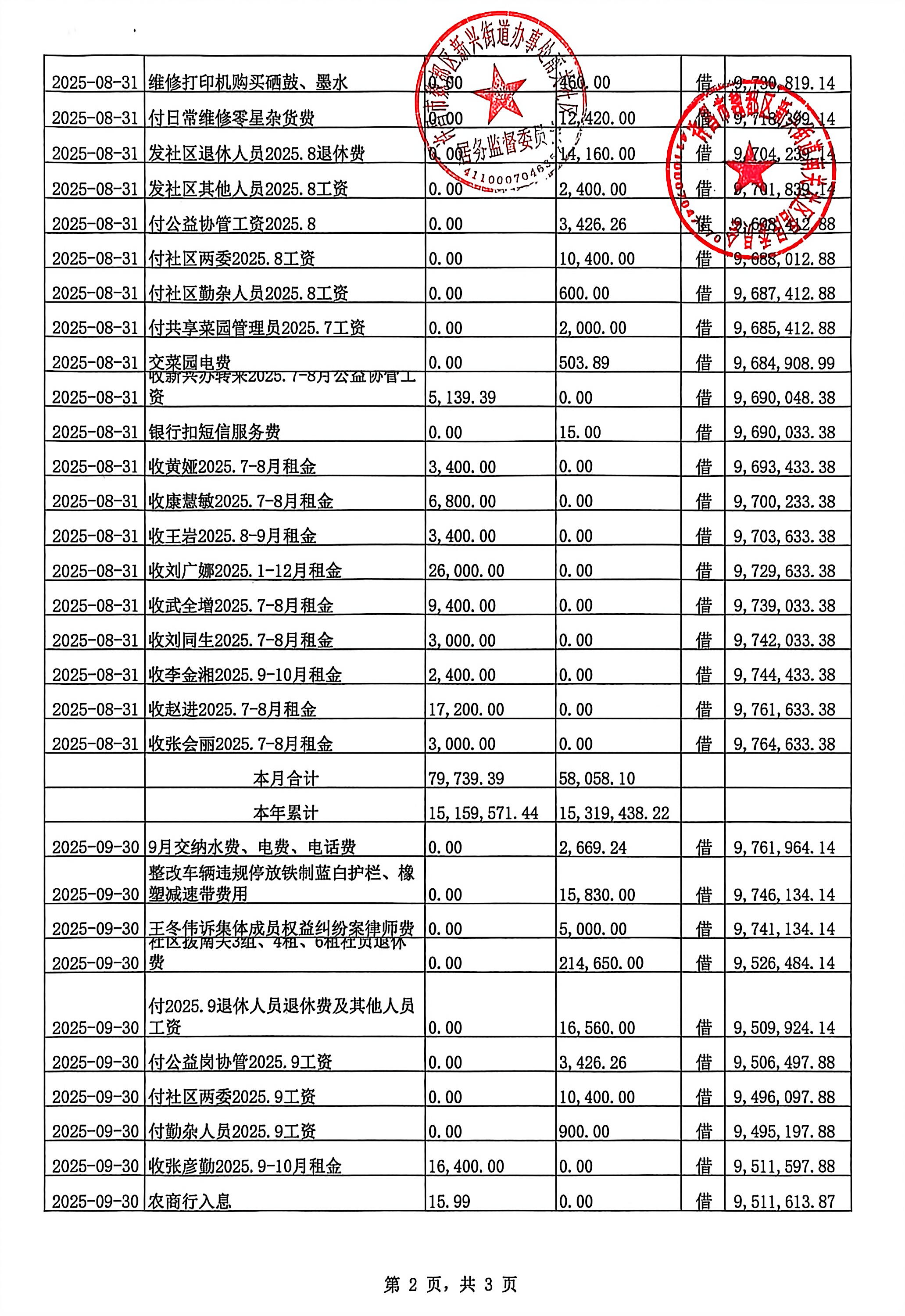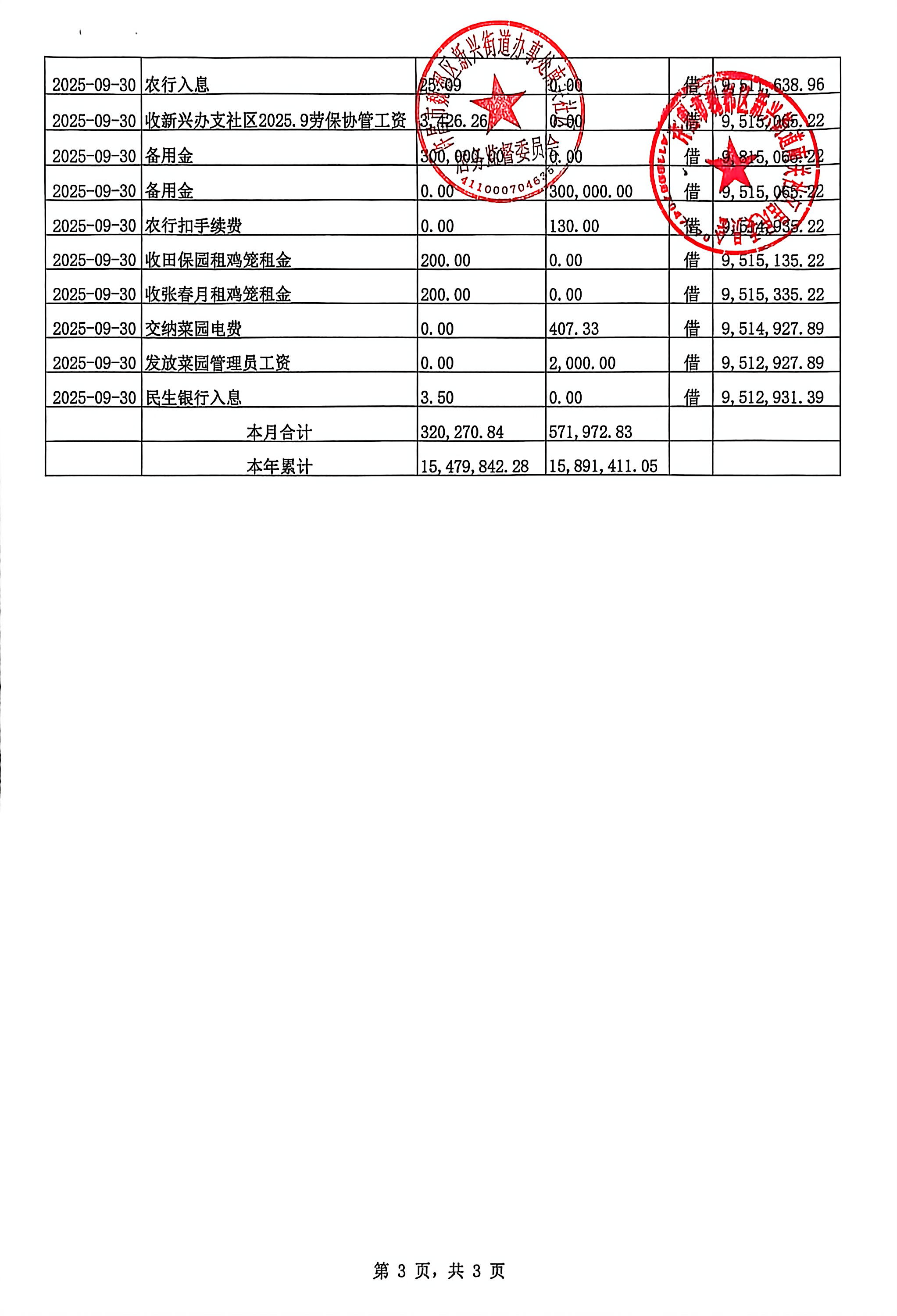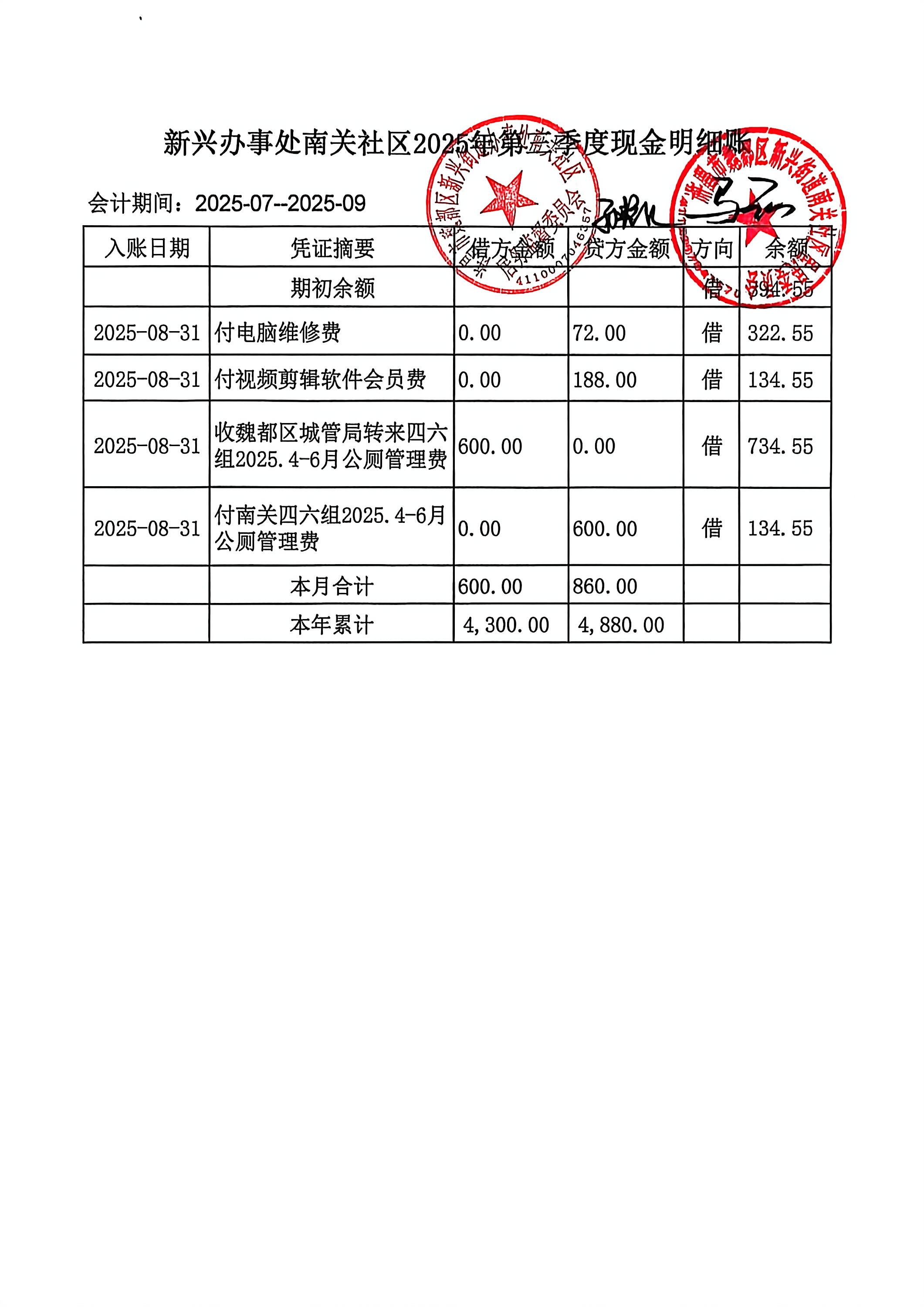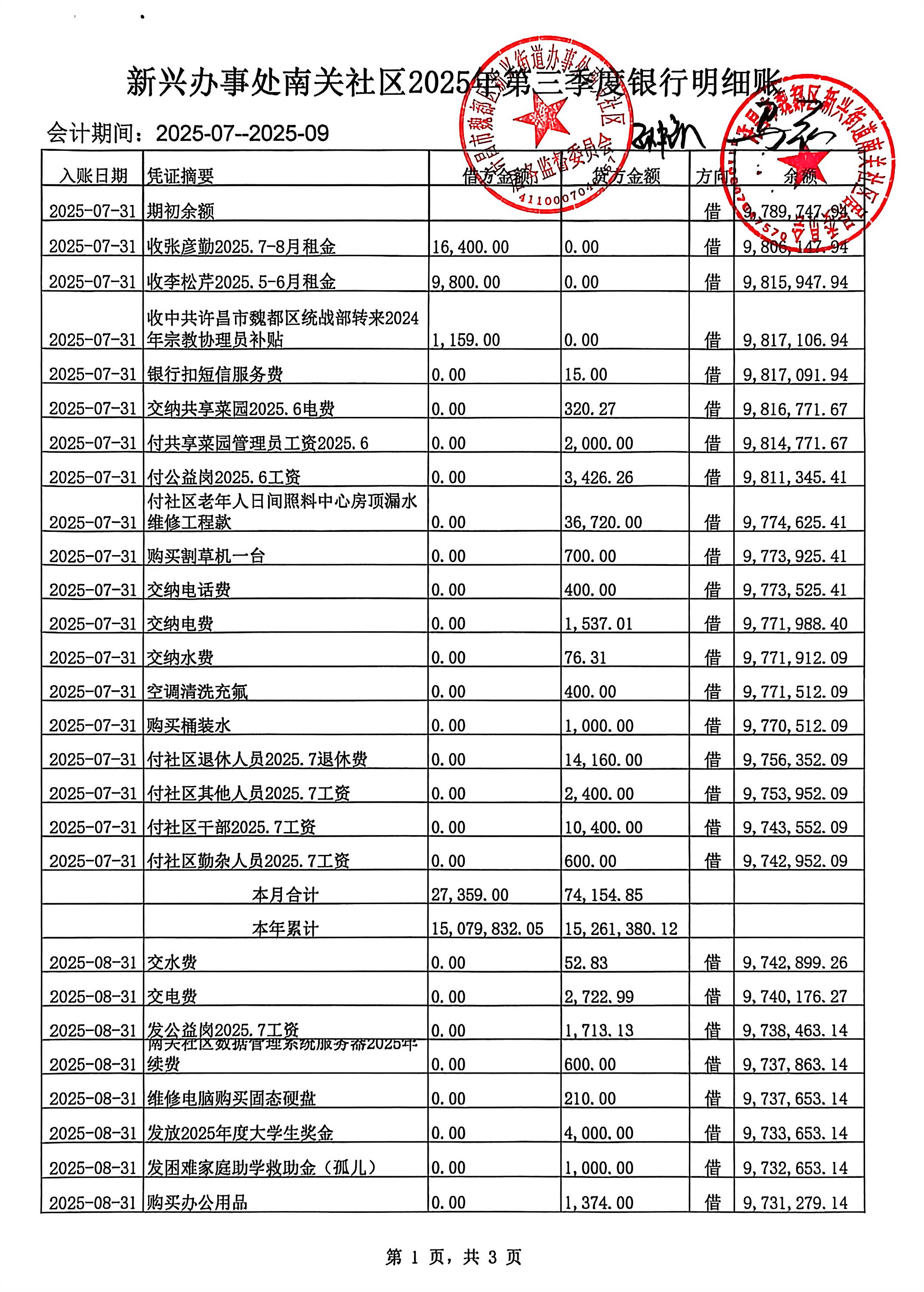 新兴街道办事处南关社区2025第三季度现金、银行存款收支公开表