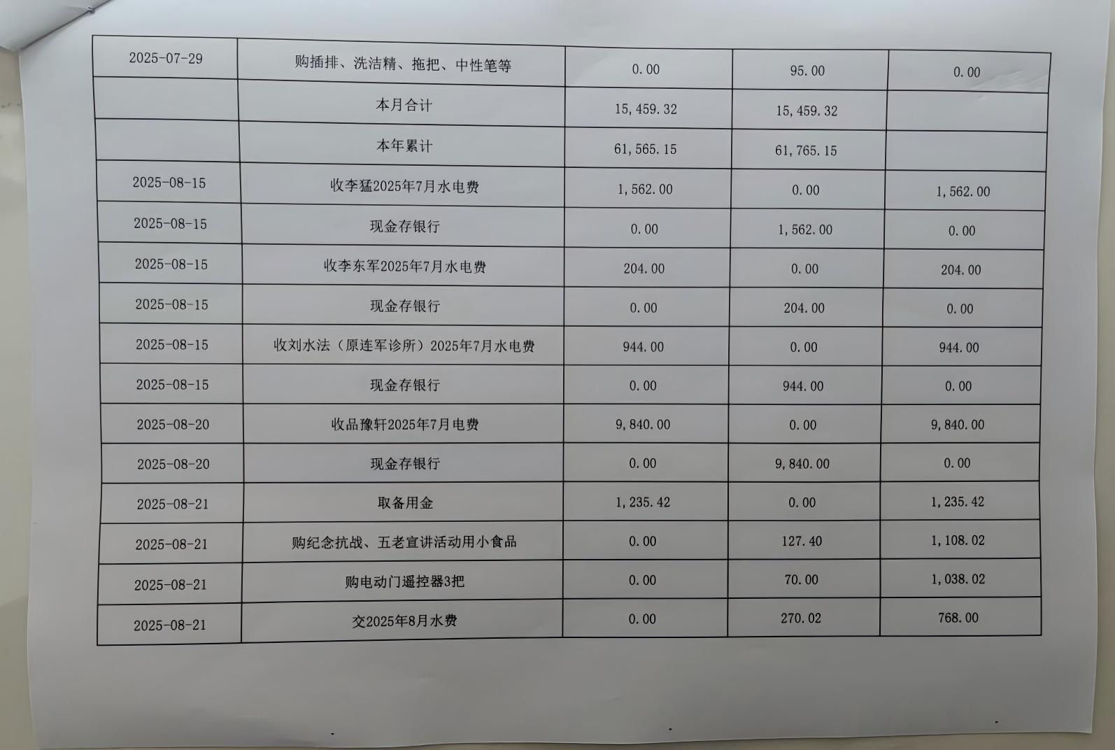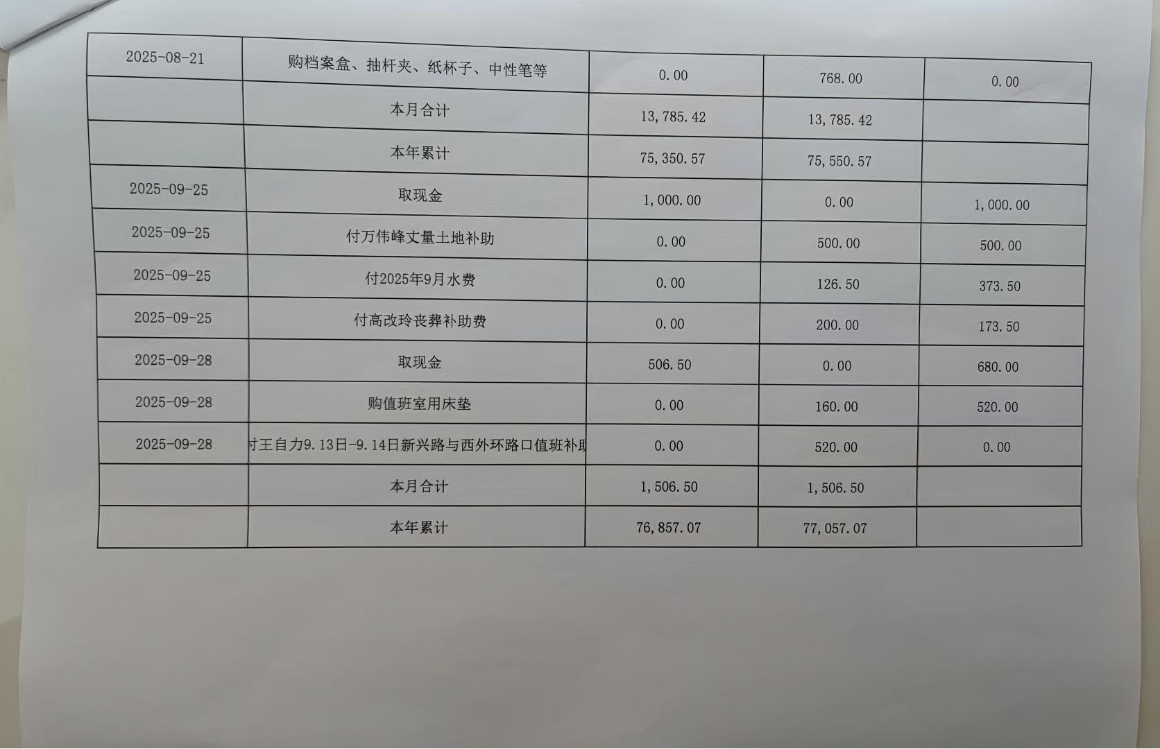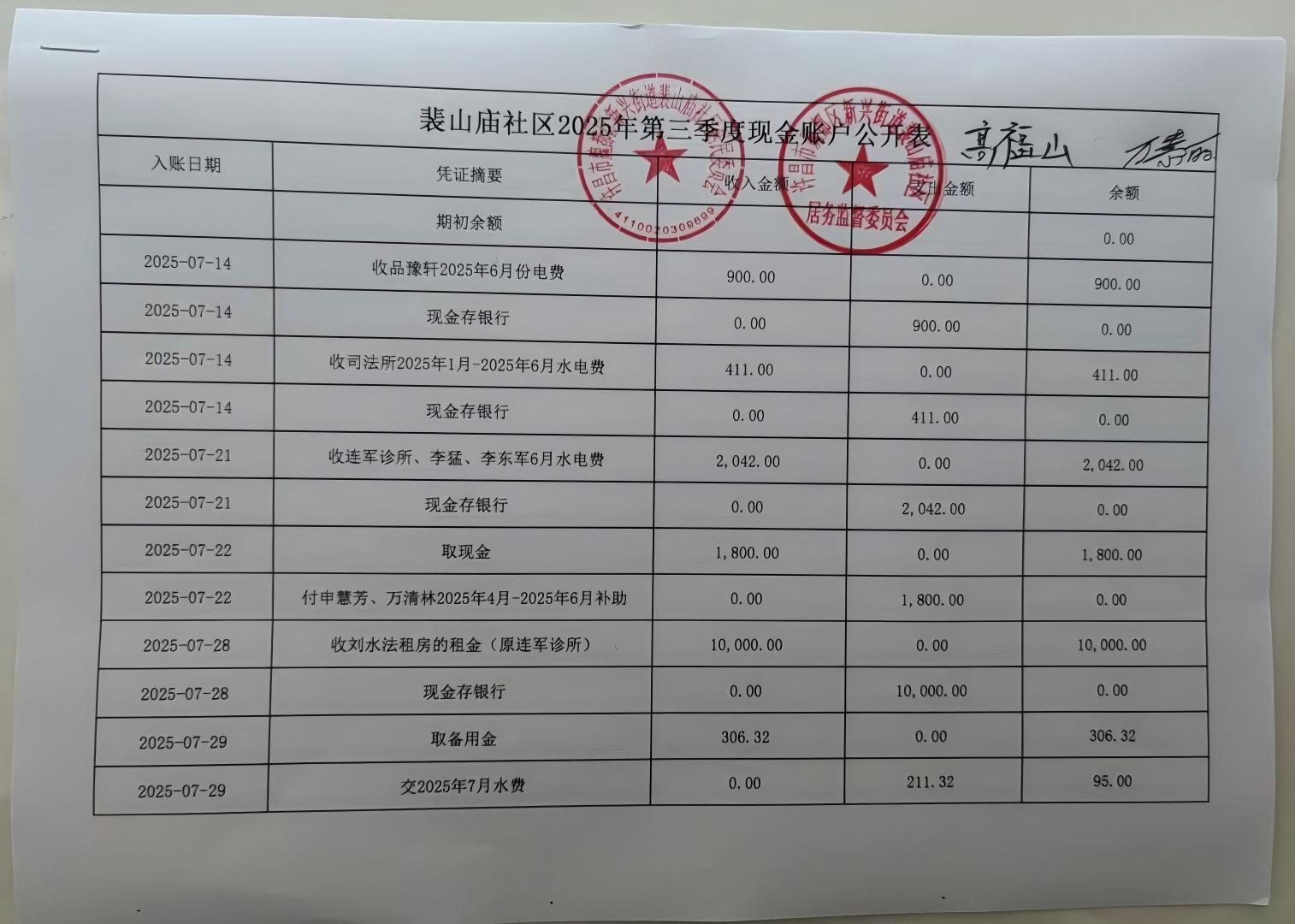 新兴街道办事处裴山庙社区2025年第三季度现金收支公开表