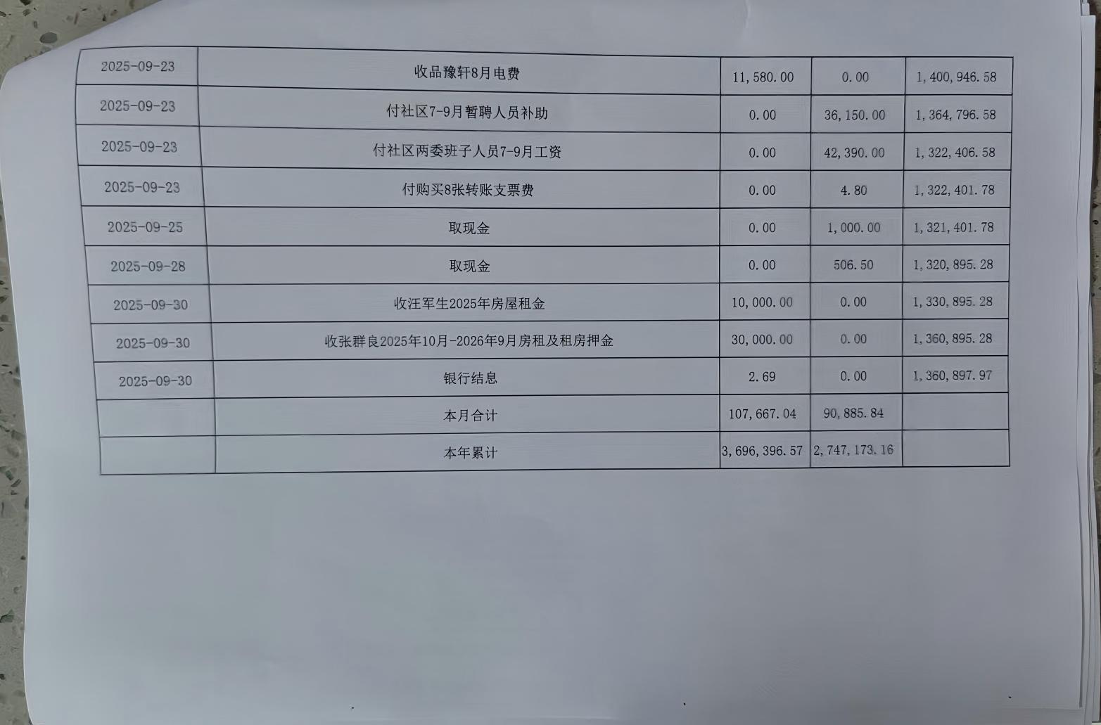 西关街道办事处烤厂社区2025年第三季度现金账、银行存款收支公开表