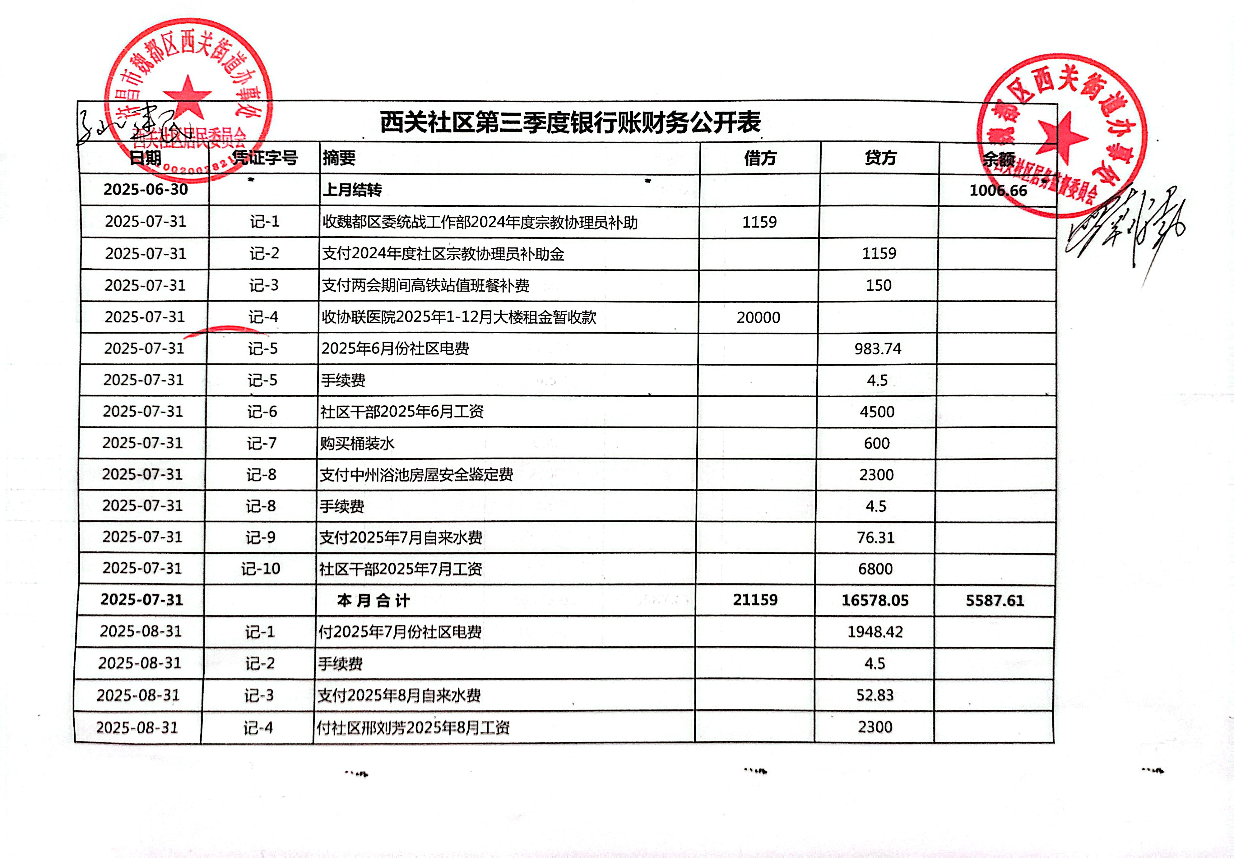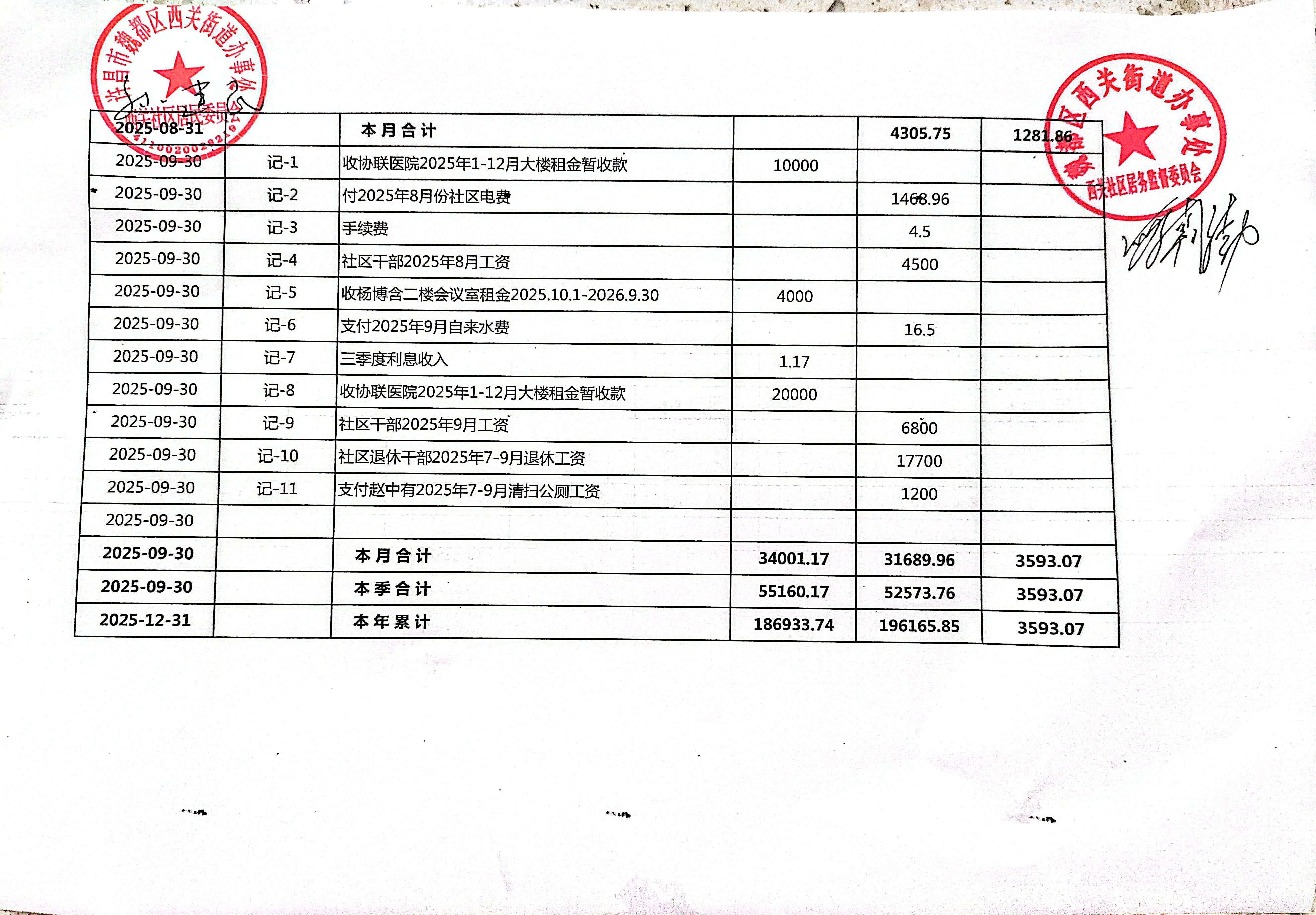 西关街道办事处西关社区2025年第三季度银行存款收支公开表