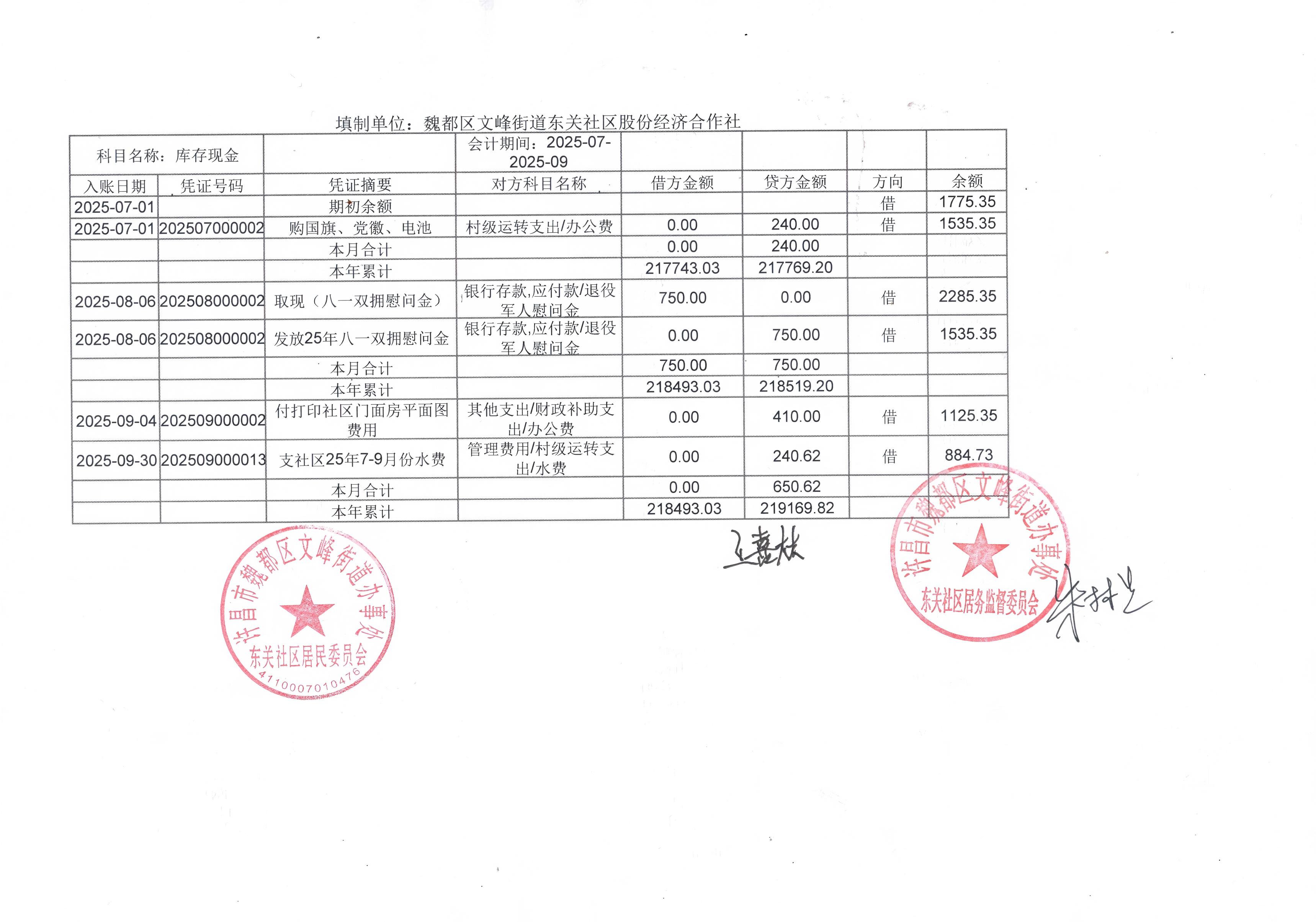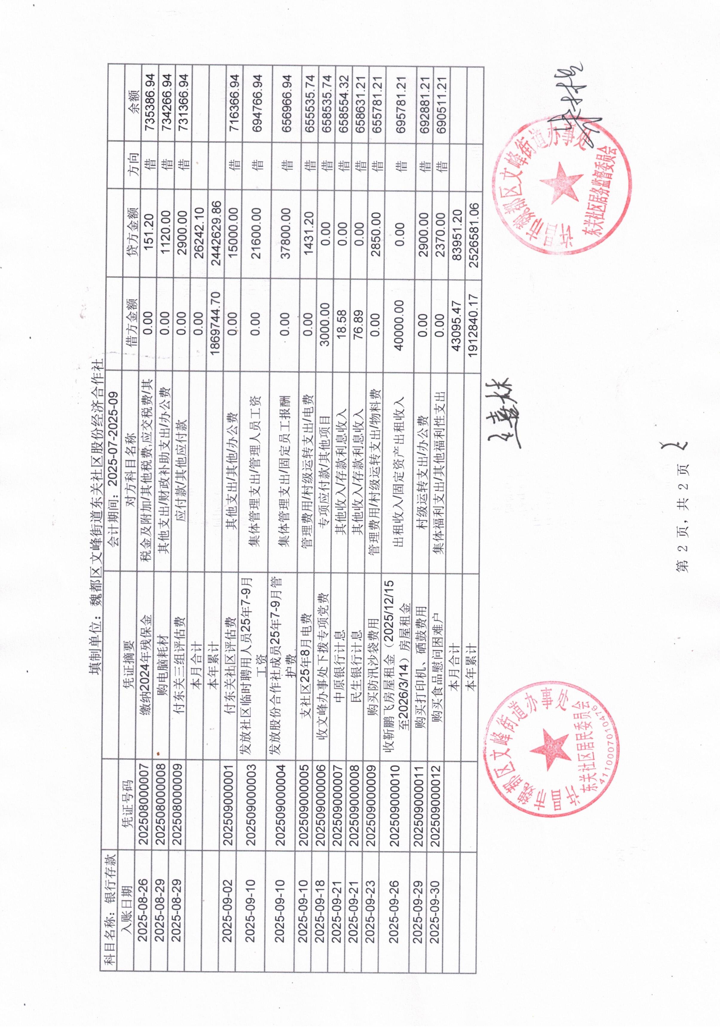 文峰办事处东关社区2025年第三季度现金、银行存款收支公开表