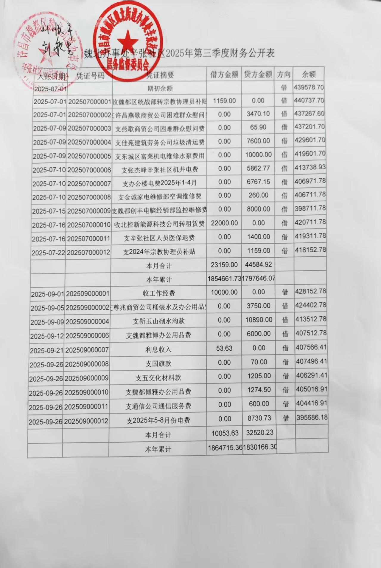 魏北街道办事处辛张社区2025年第三季度银行存款收支公开表
