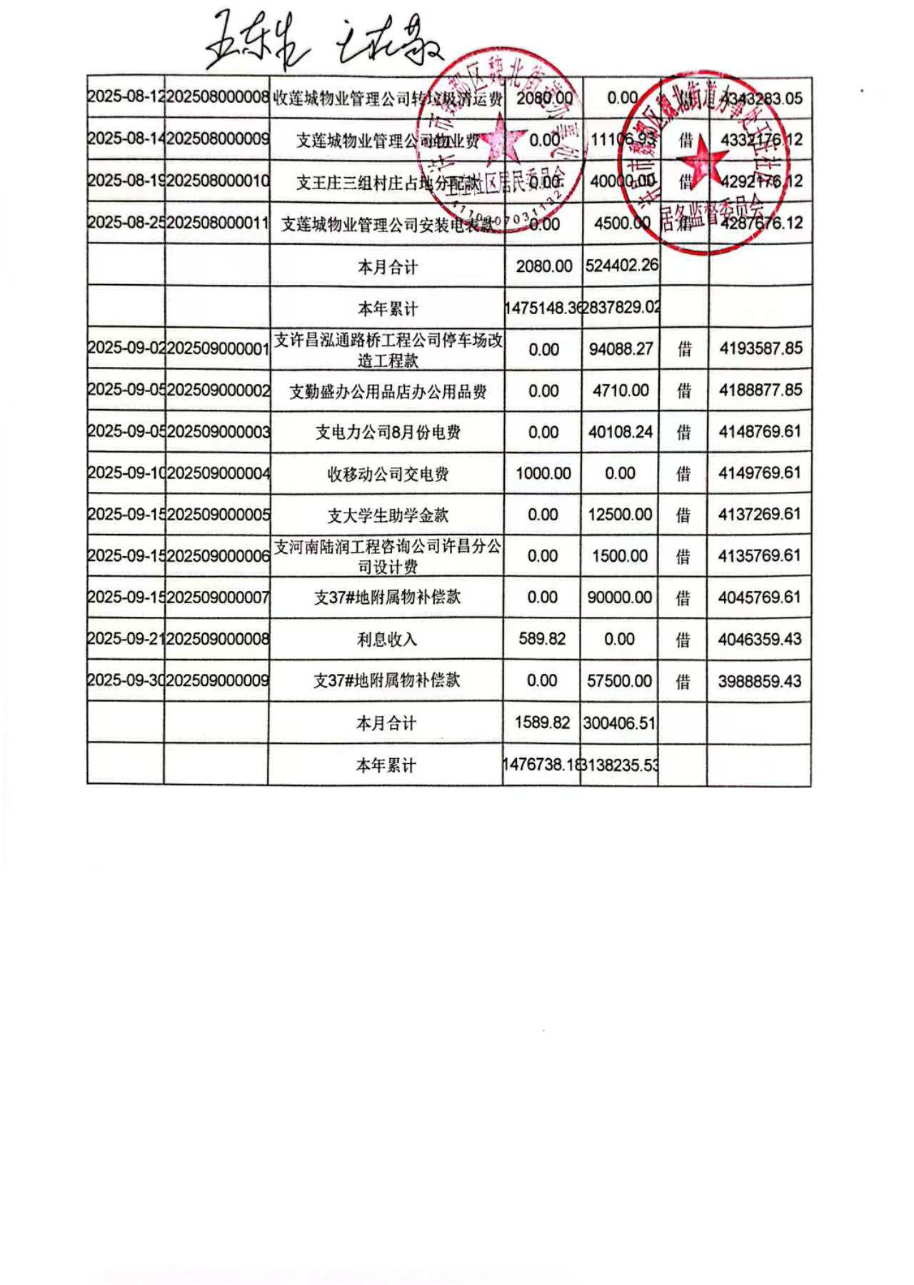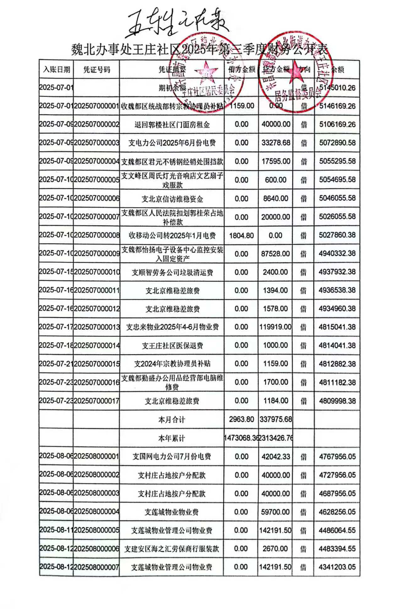 魏北街道办事处王庄社区2025年第三季度银行存款收支公开表