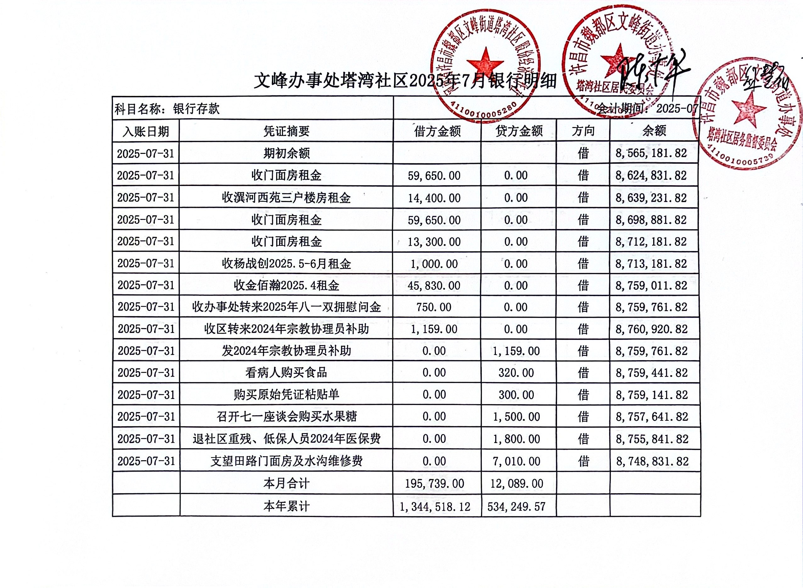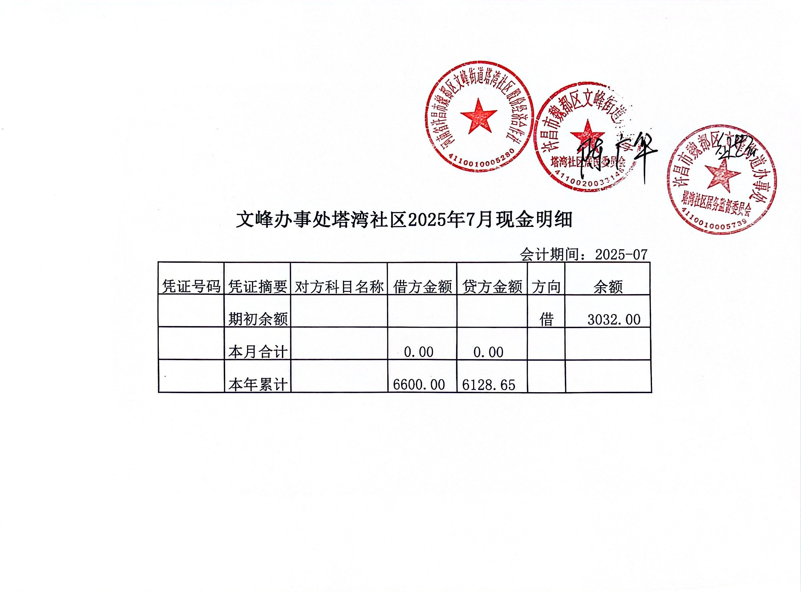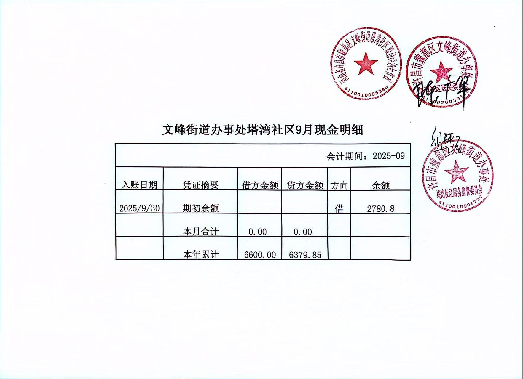 文峰办事处塔湾社区2025年第三季度现金、银行存款收支公开表