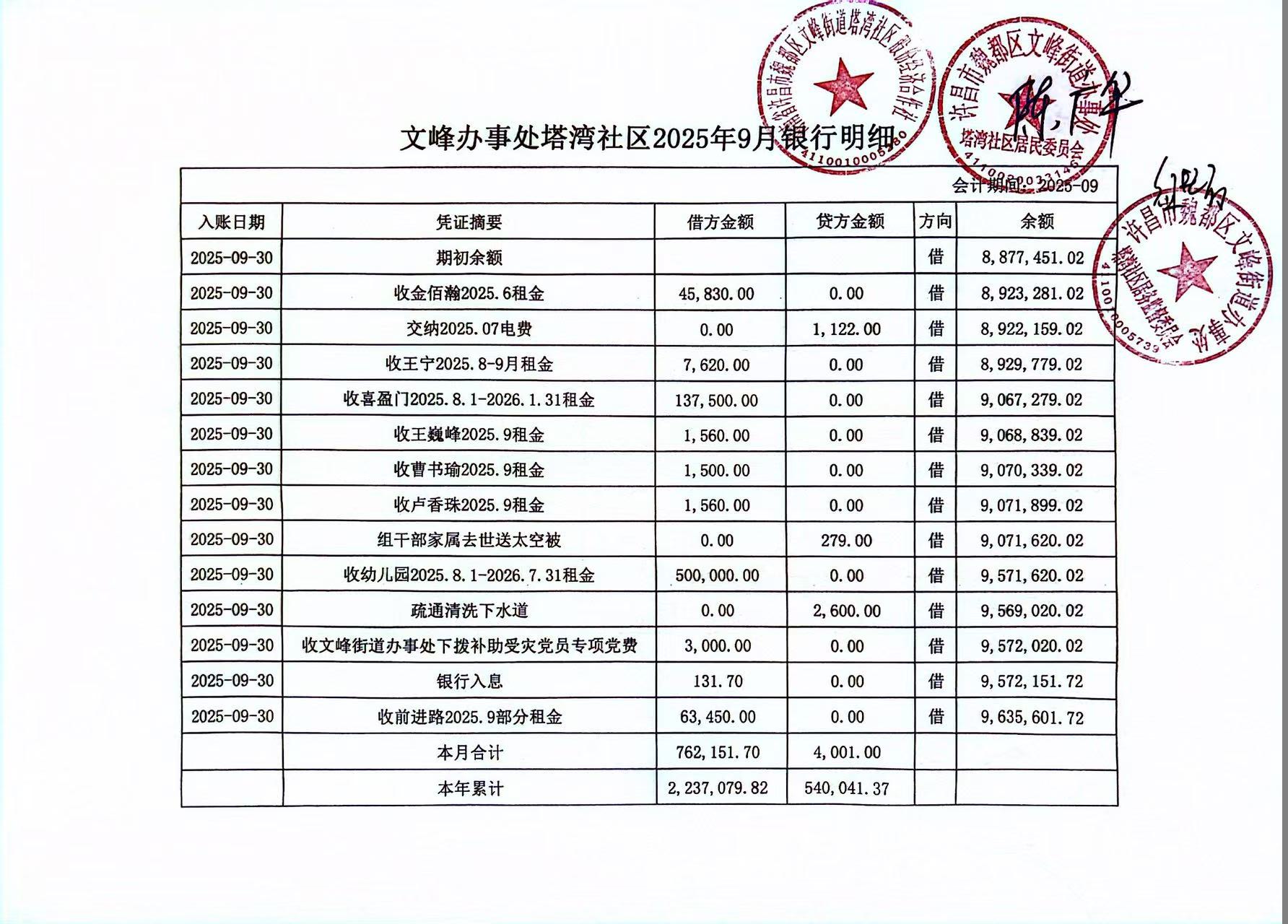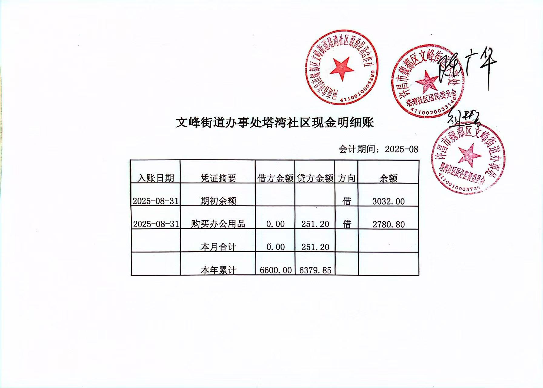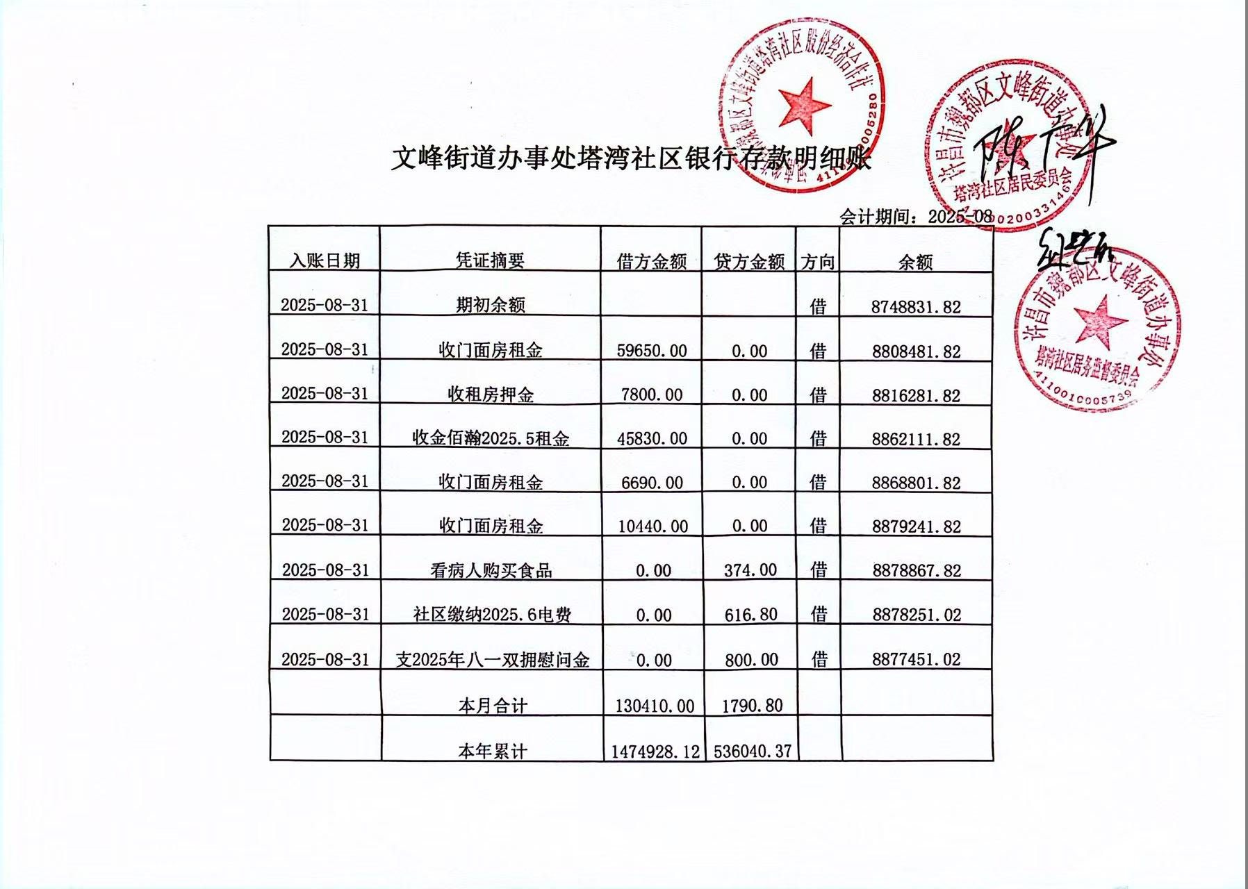 文峰办事处塔湾社区2025年第三季度现金、银行存款收支公开表