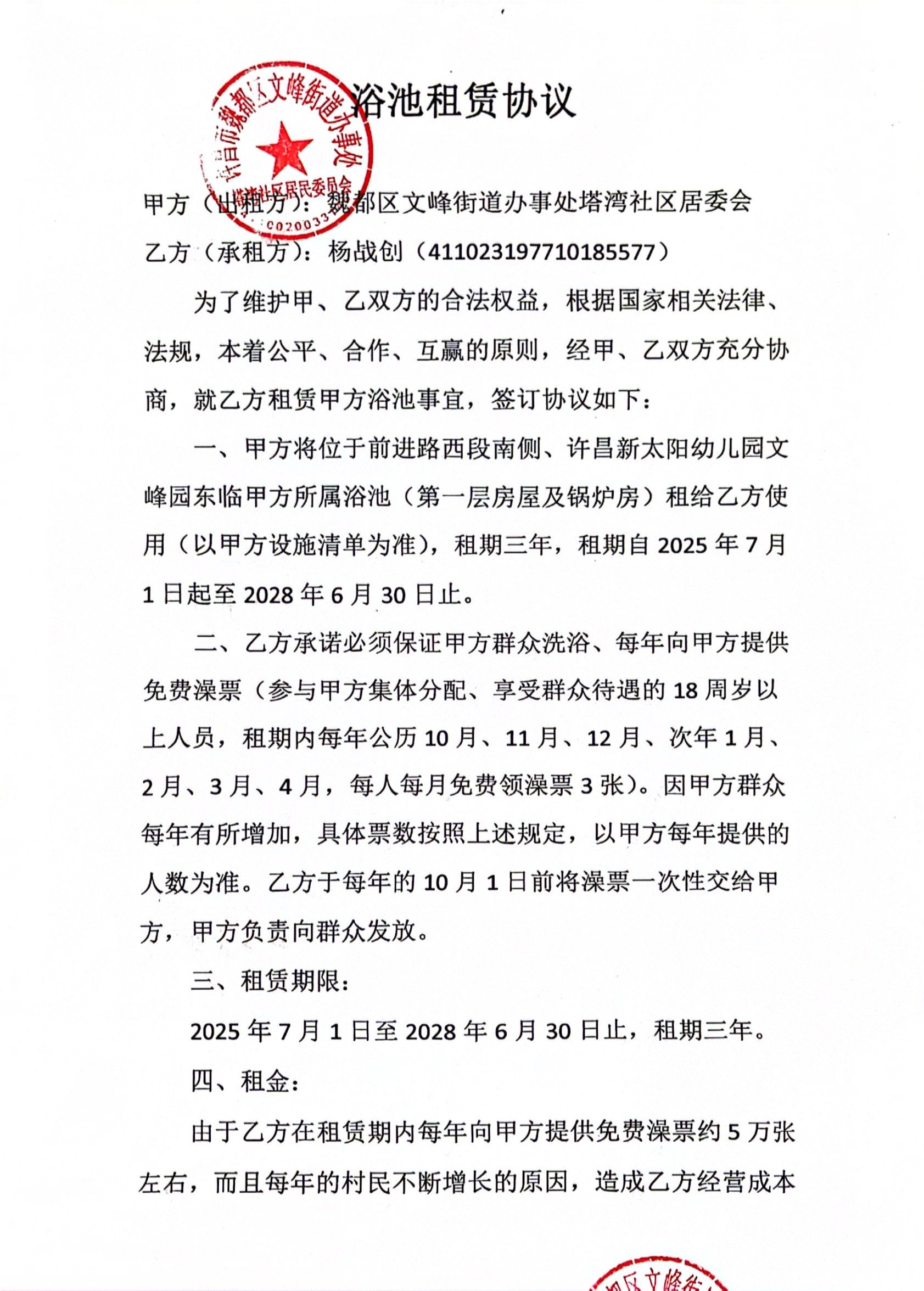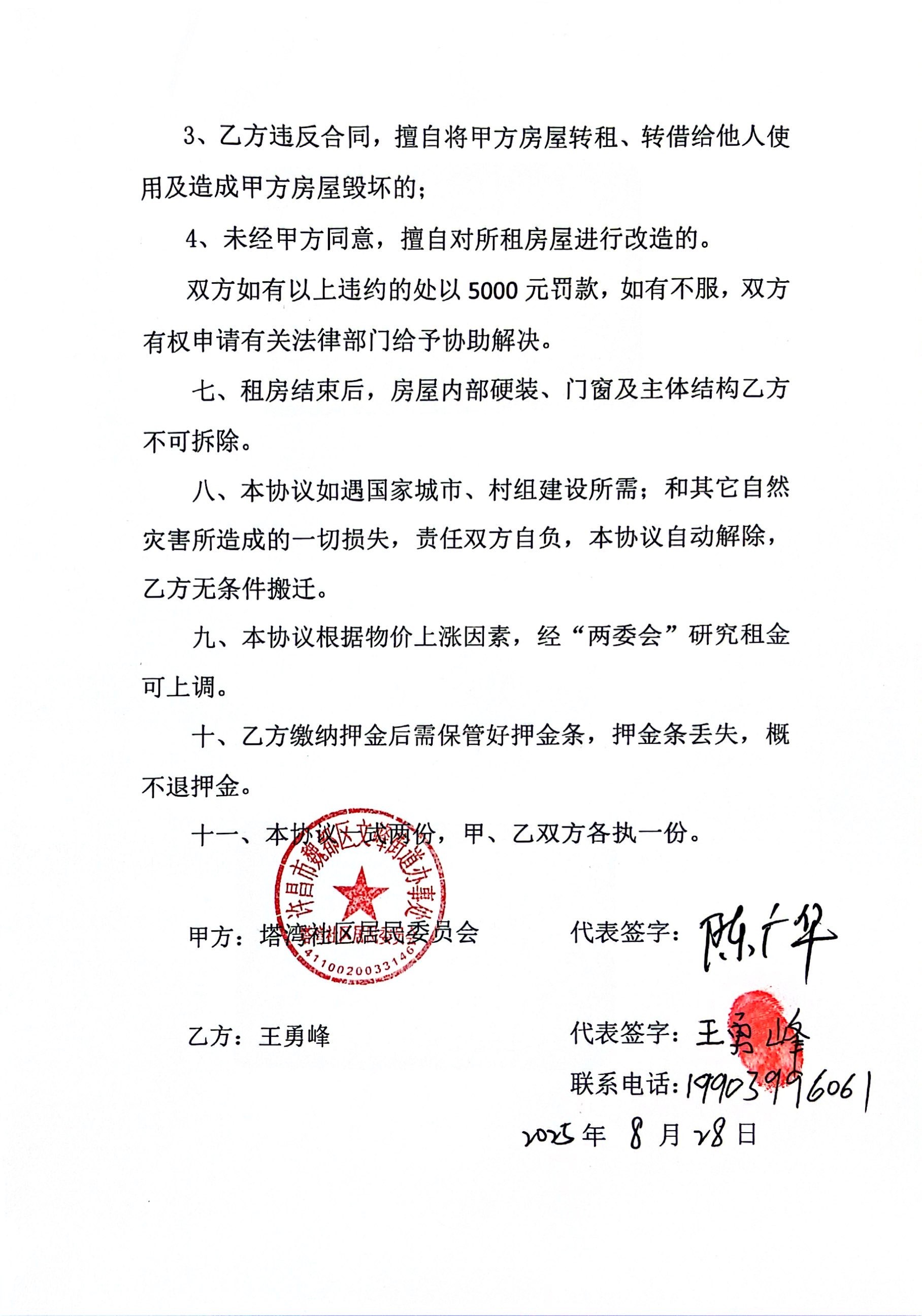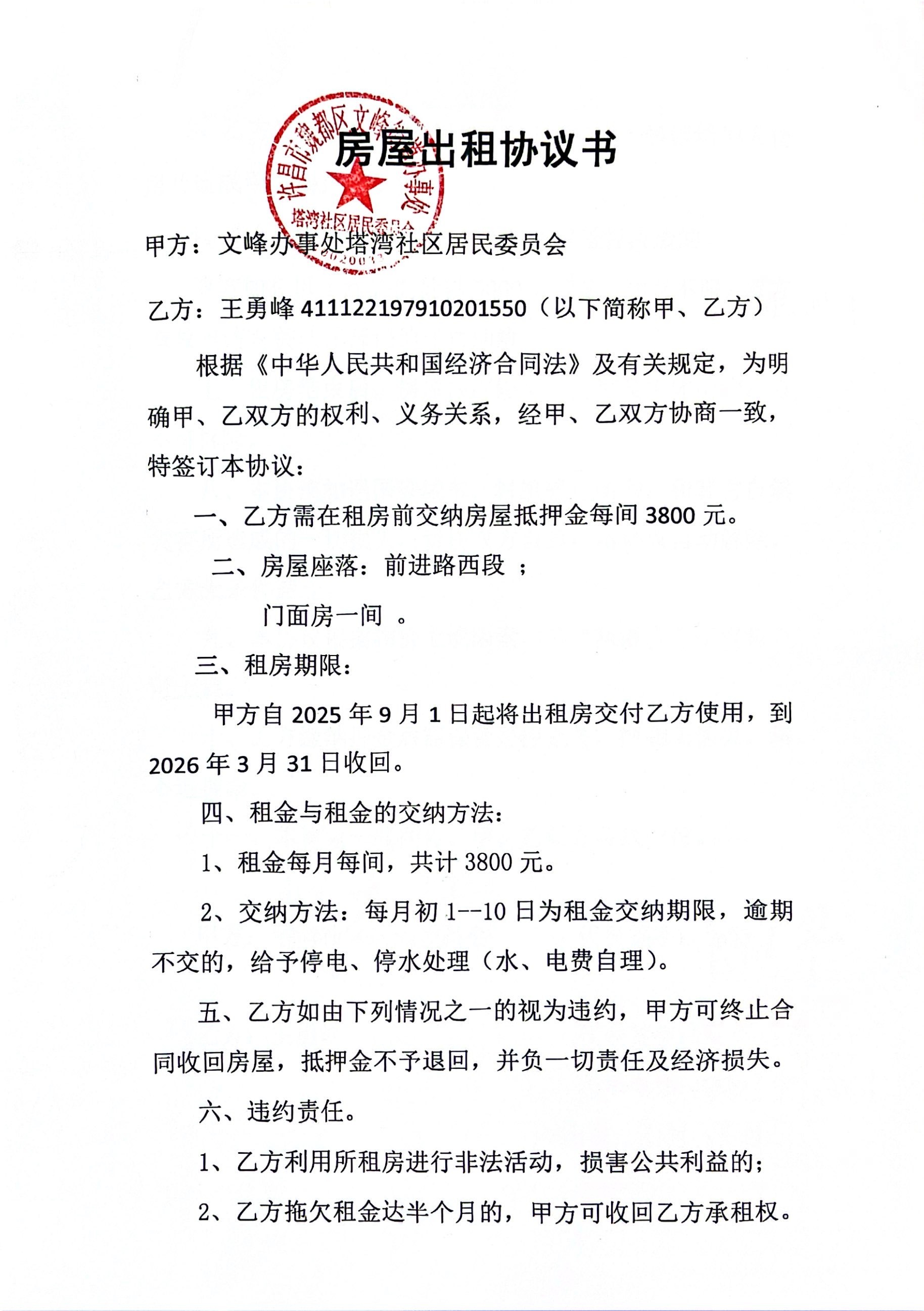 文峰办事处塔湾社区2025年第三季度门面房租赁协议公开
