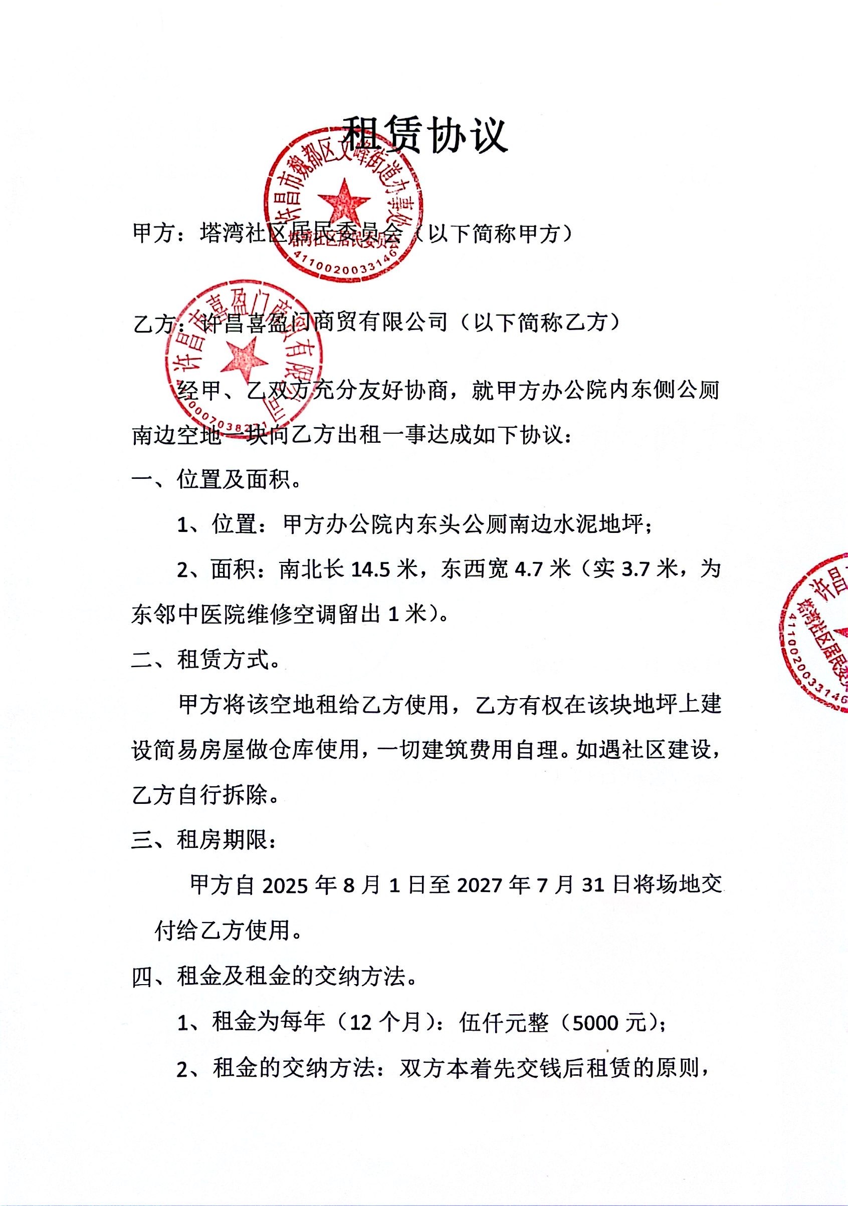 文峰办事处塔湾社区第一居民小组门面房及场院租赁协议