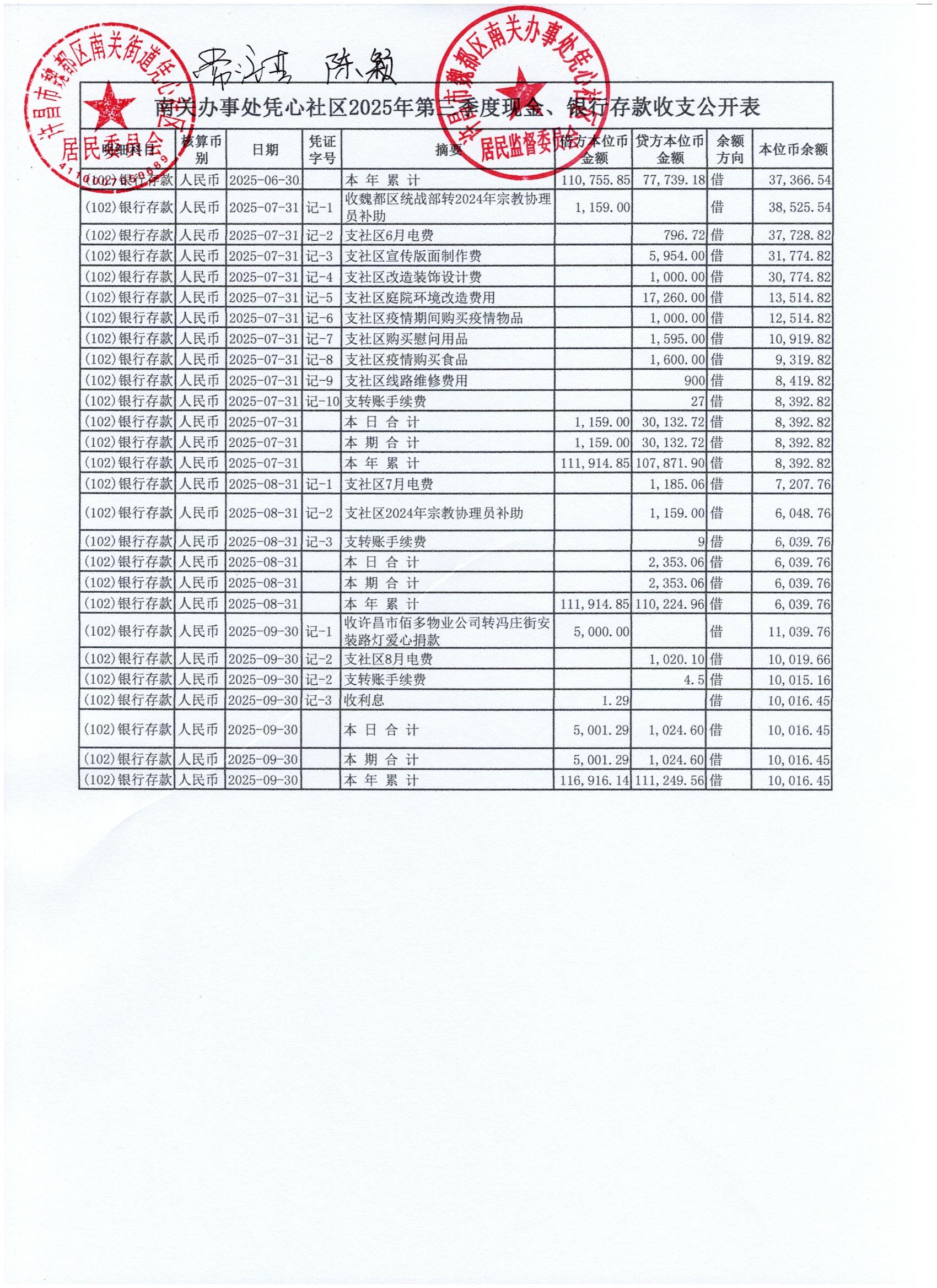 南关街道办事处凭心社区2025年第三季度银行存款收支公开表