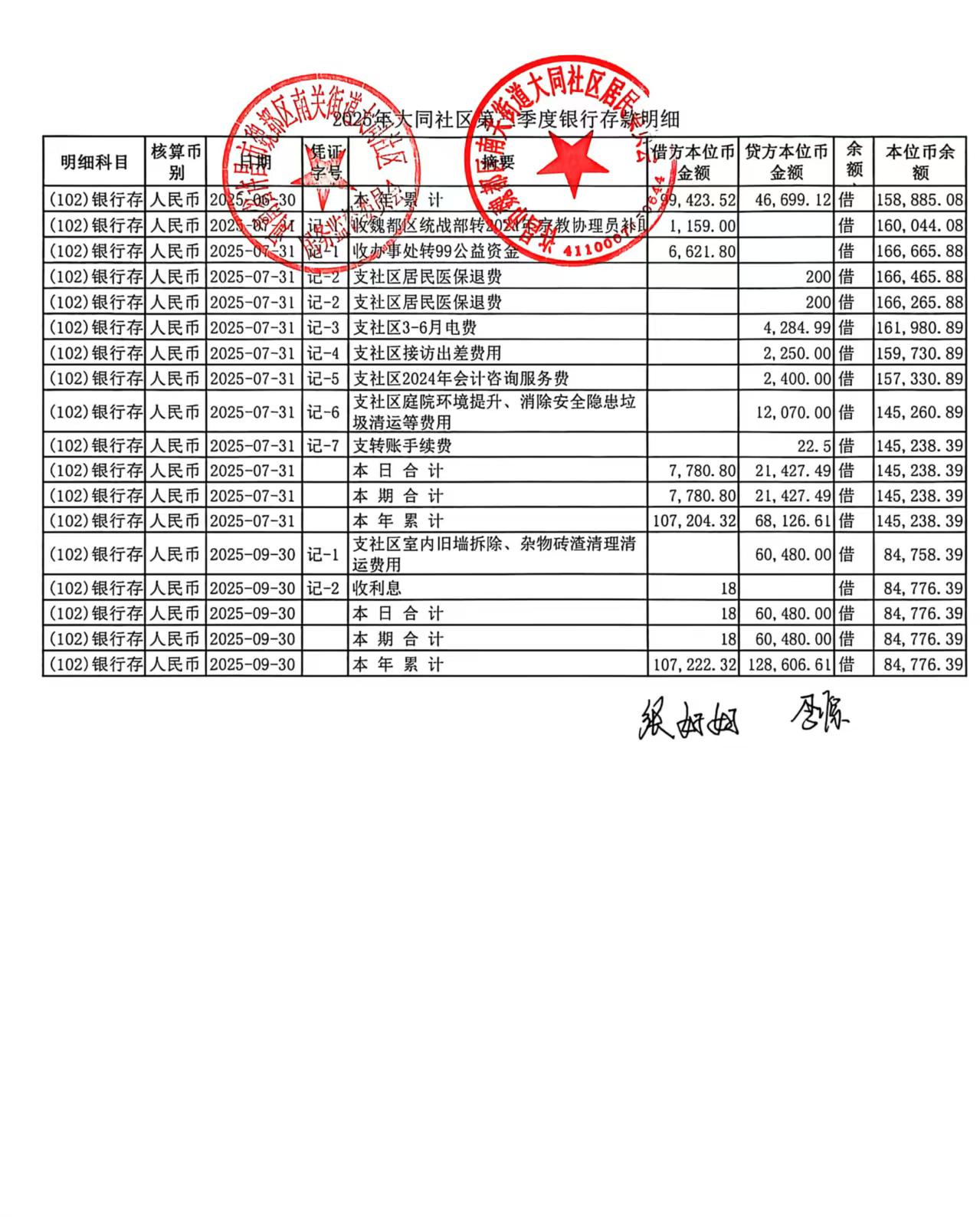 南关街道办事处大同社区2025年第三季度银行存款收支公开表