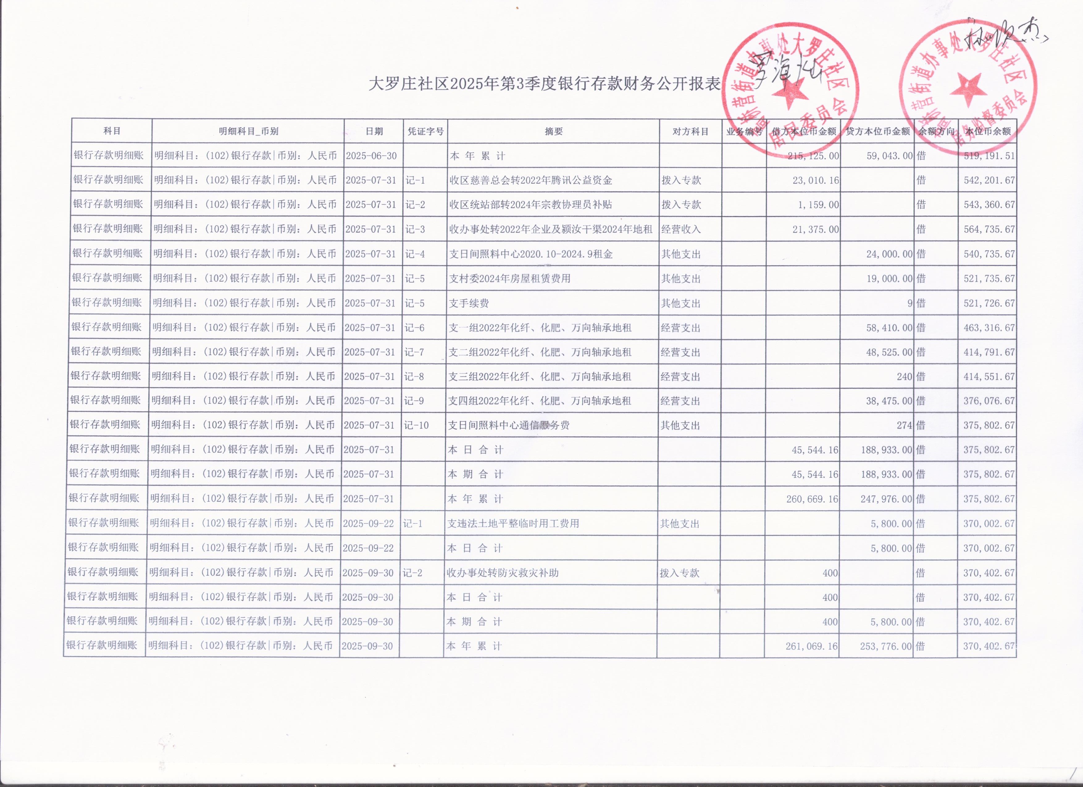 高桥营街道办事处大罗庄社区2025年第三季度银行存款收支公开表