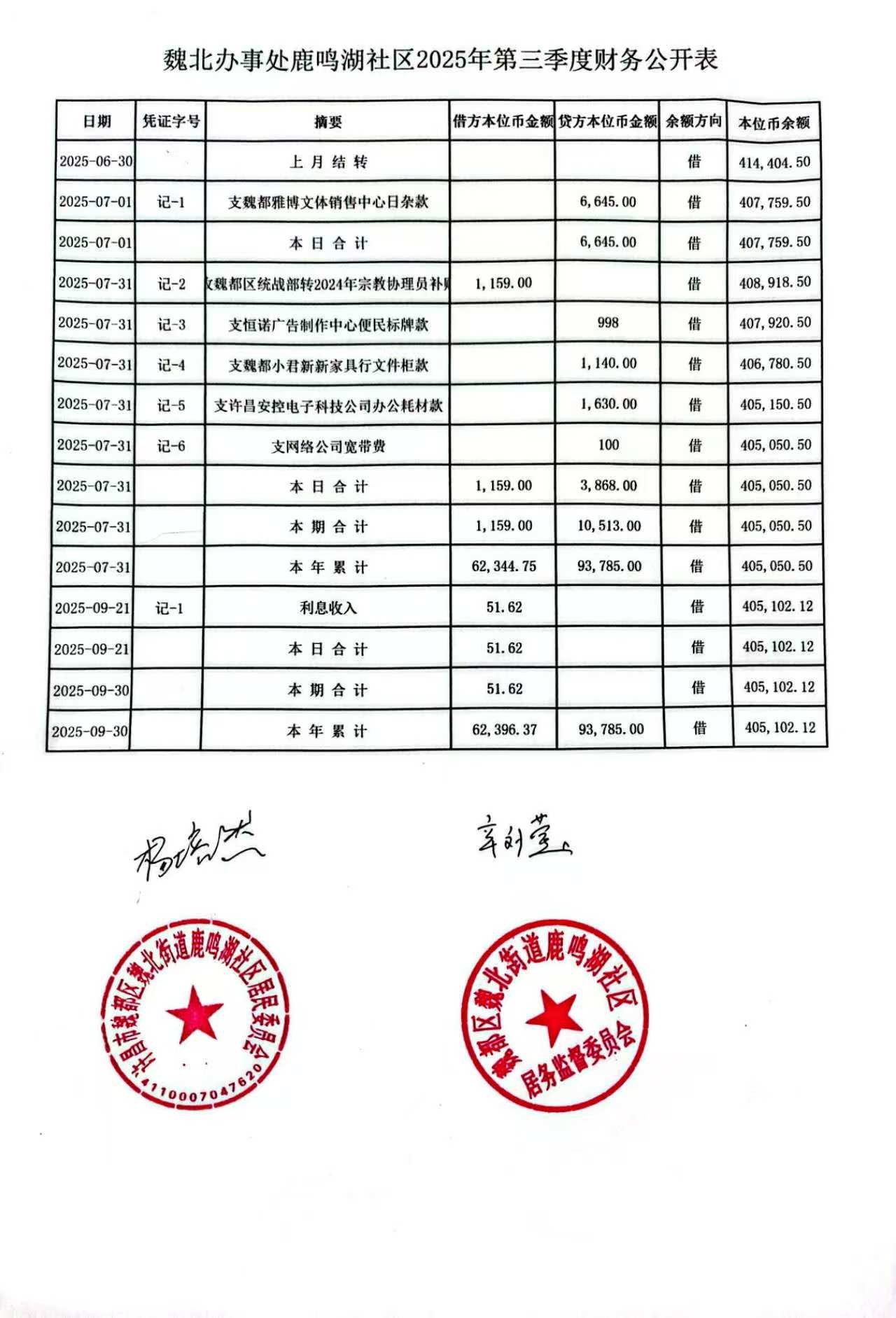 魏北街道办事处鹿鸣湖社区2025年第三季度银行存款收支公开表