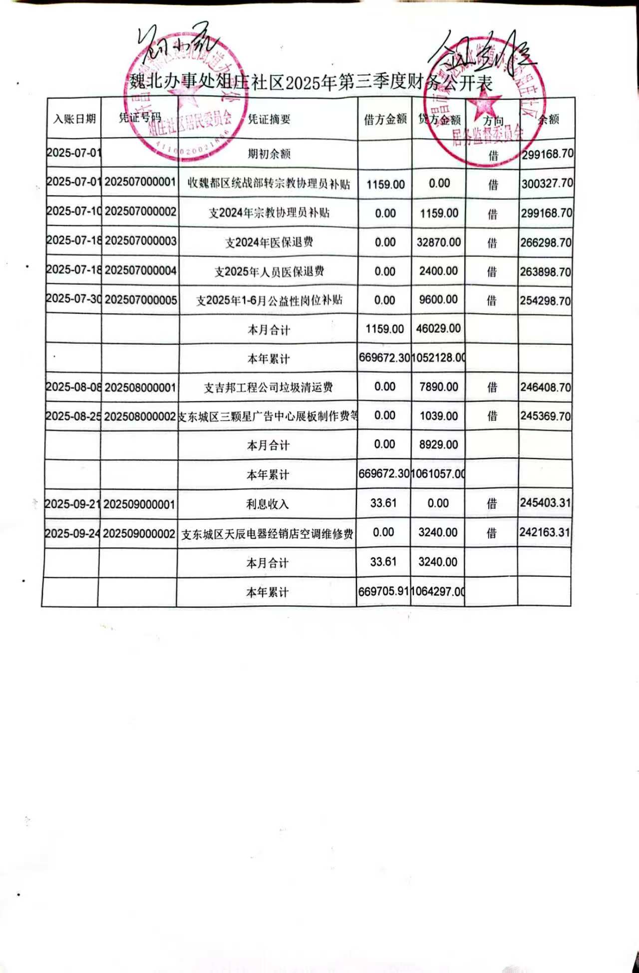 魏北街道办事处俎庄社区2025年第三季度银行存款收支公开表