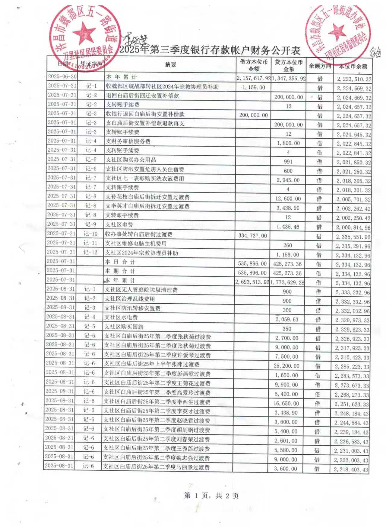 五一路街道办事处万里社区2025年第三季度银行存款收支公开表