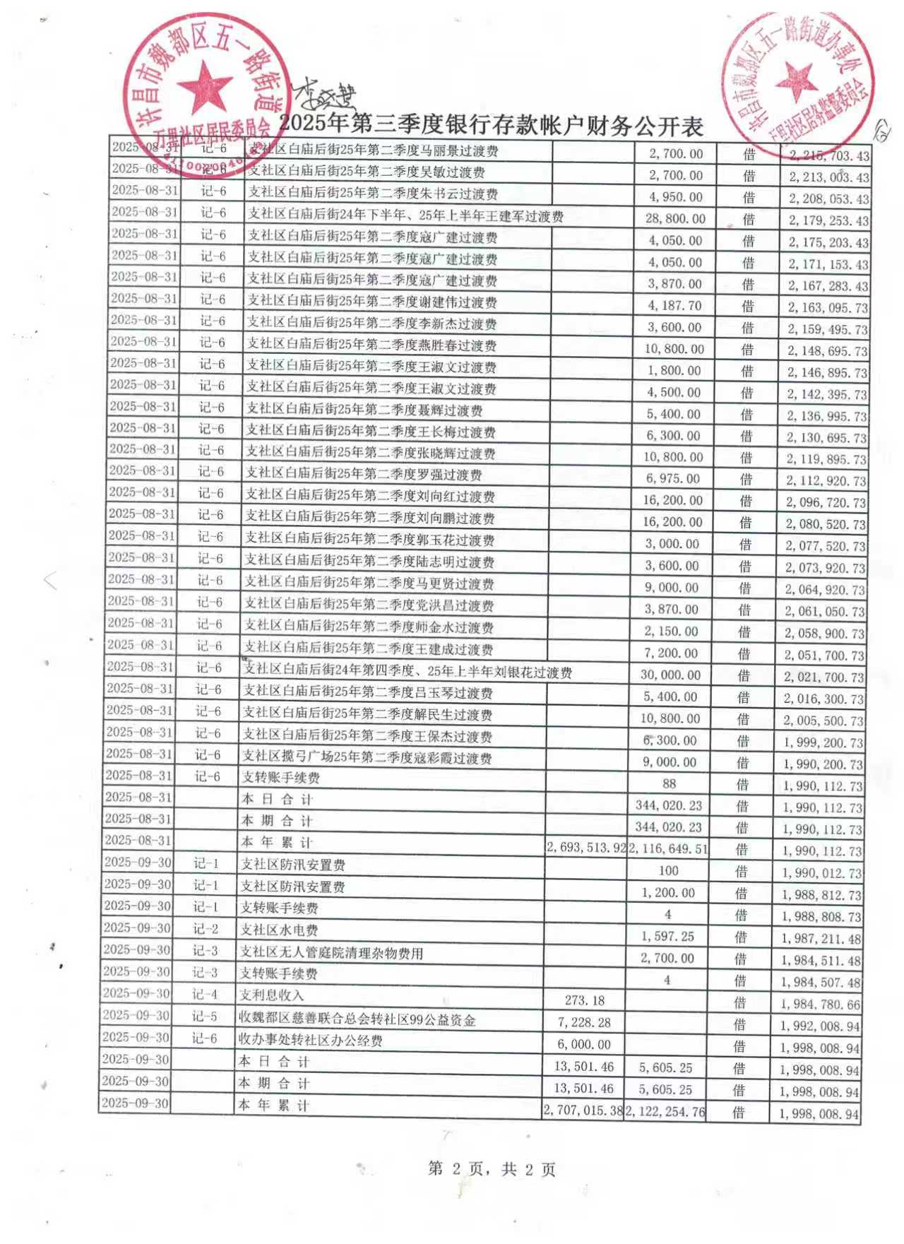 颍昌街道办事处颍昌社区2025年第三季度银行存款收支公开表
