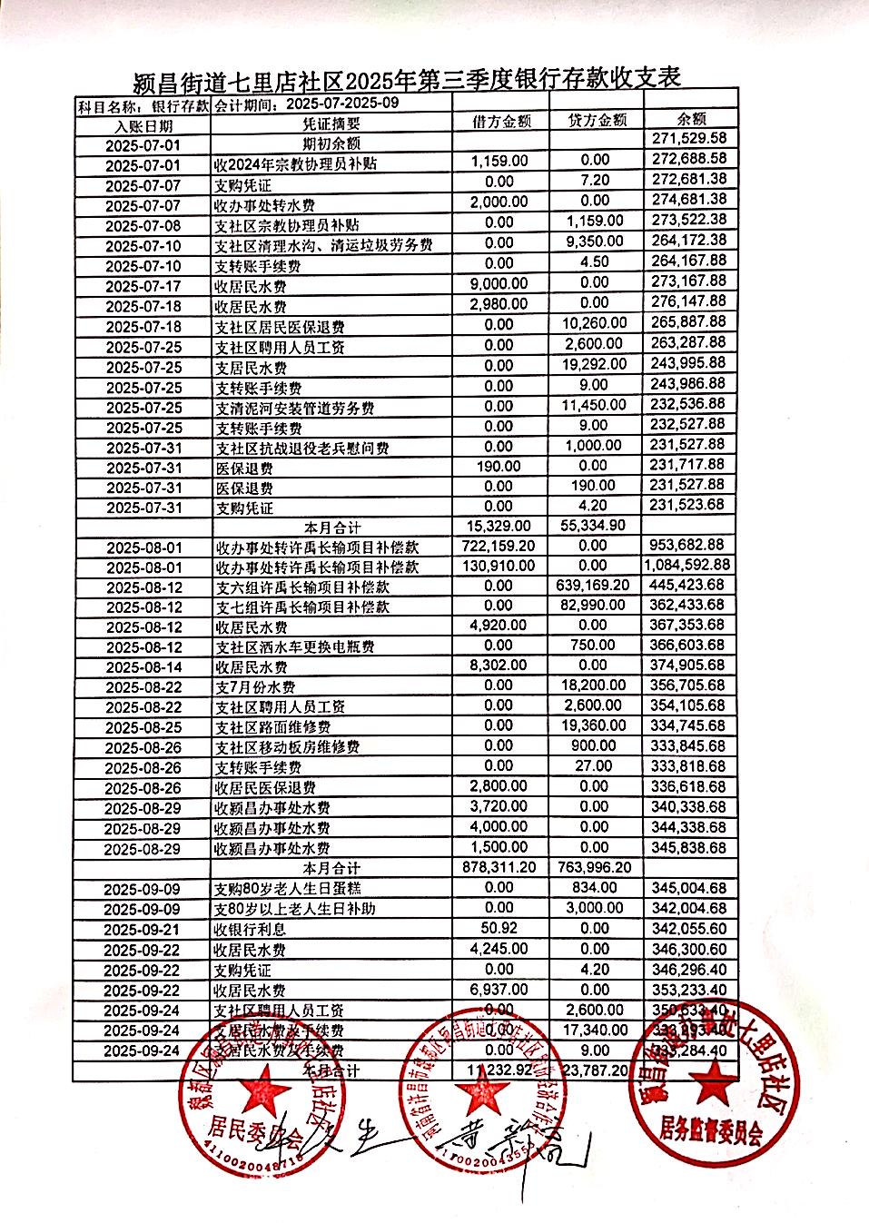 颍昌街道办事处七里店社区2025年第三季度银行存款收支公开表