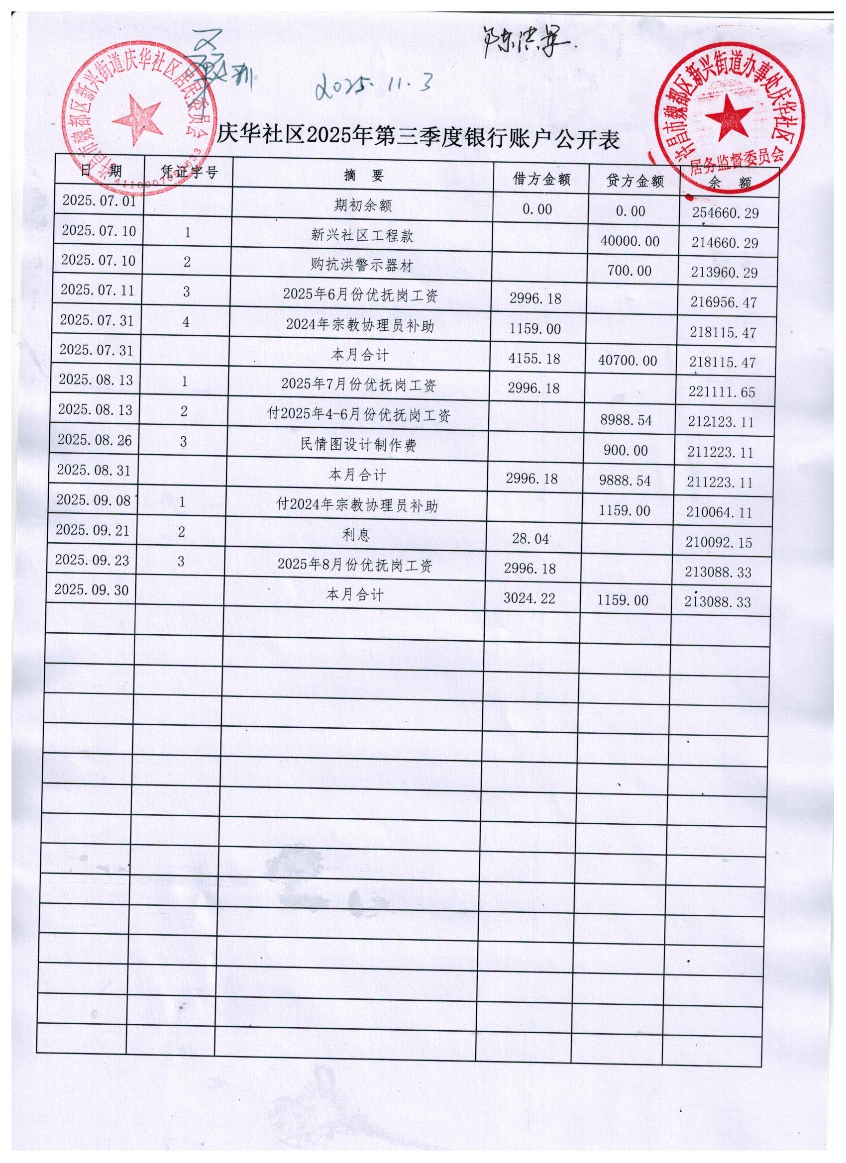 新兴街道办事处庆华社区2025年第三季度银行存款收支公开表