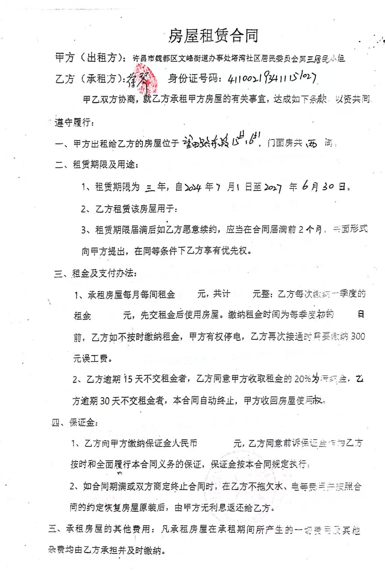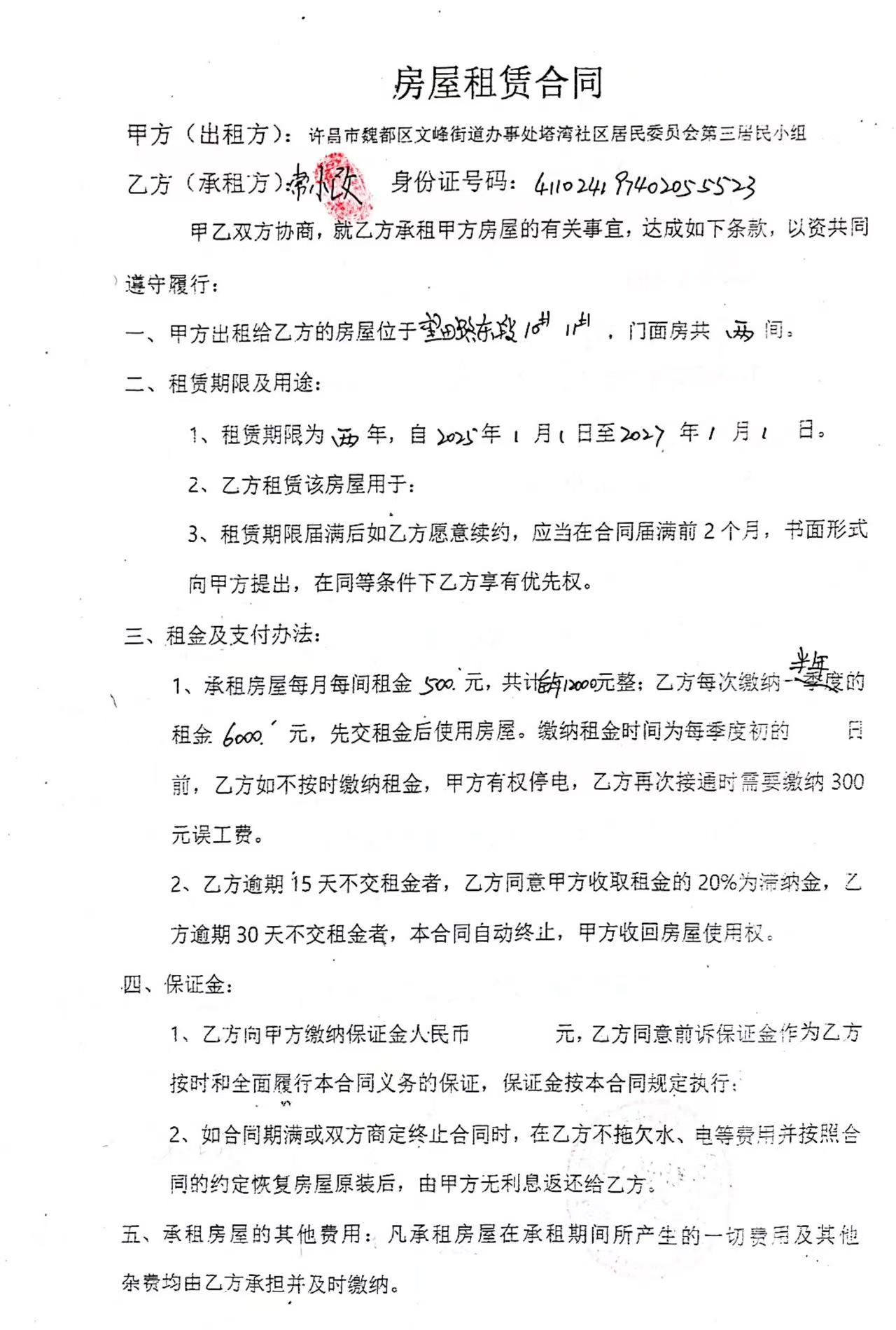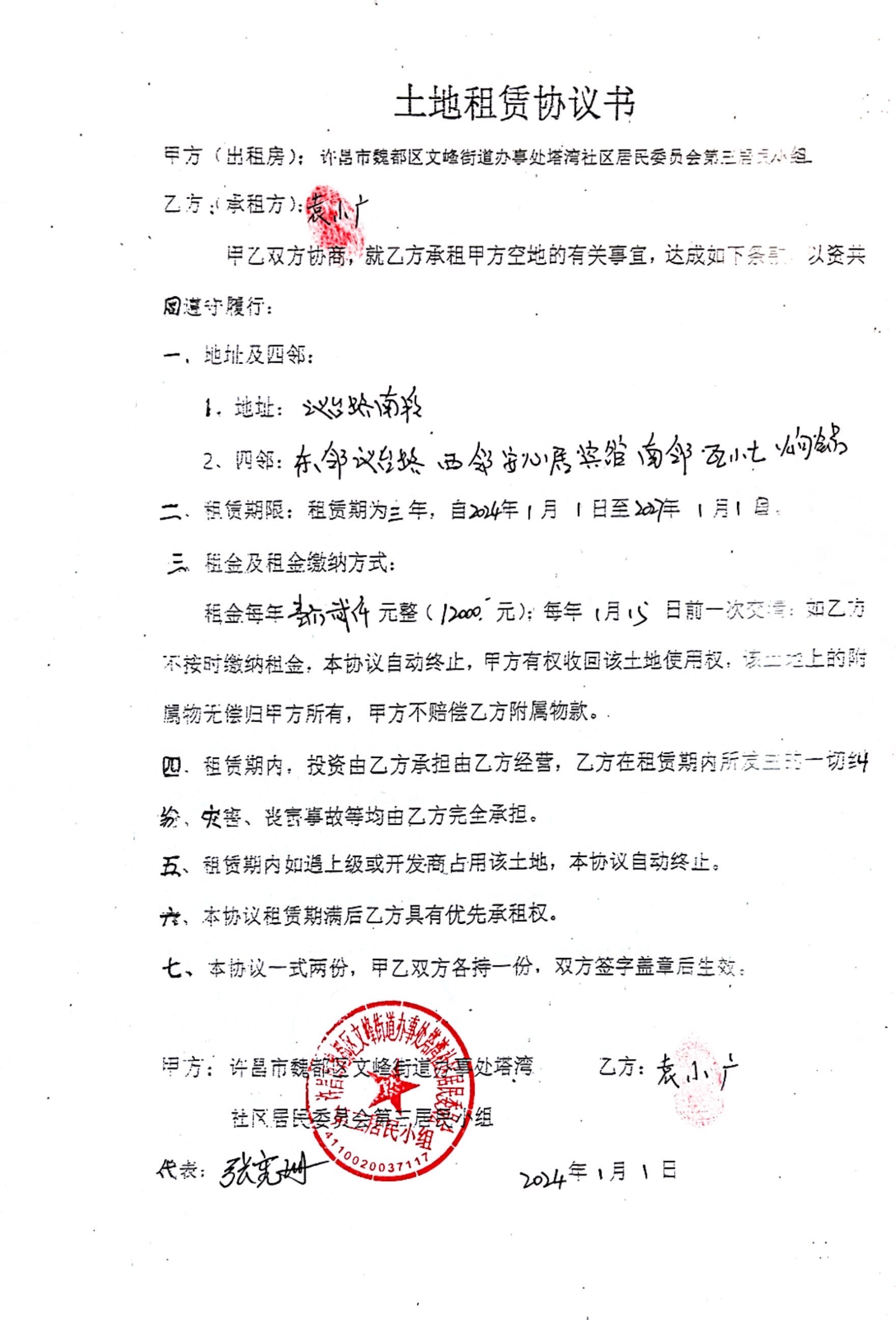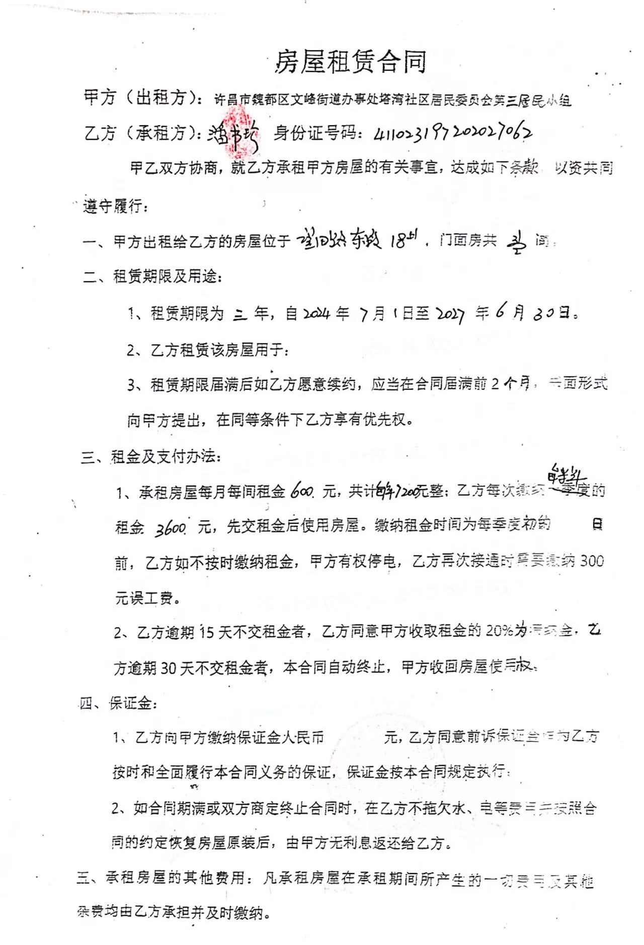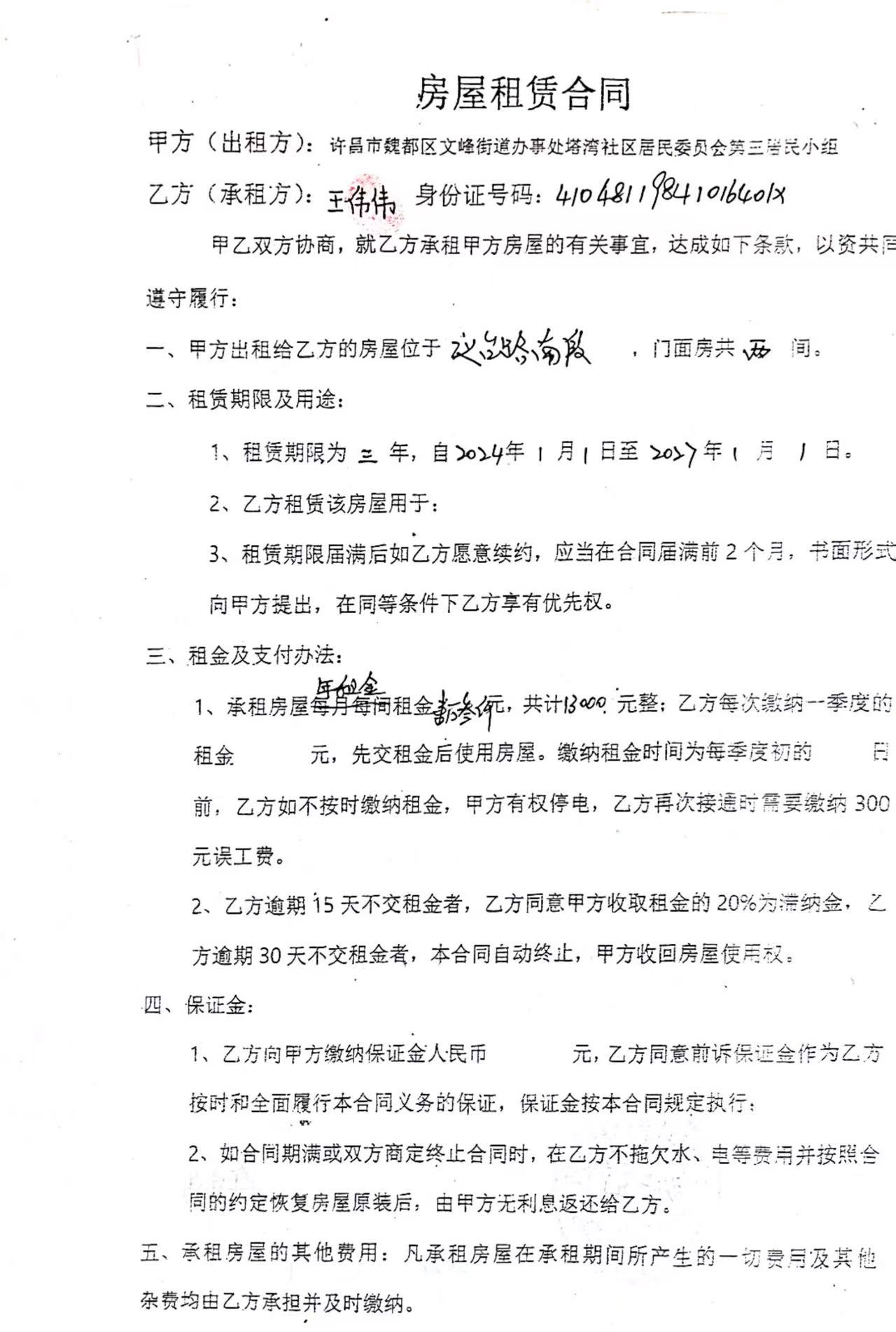 文峰办事处塔湾社区第四居民小组门面房及场院租赁协议