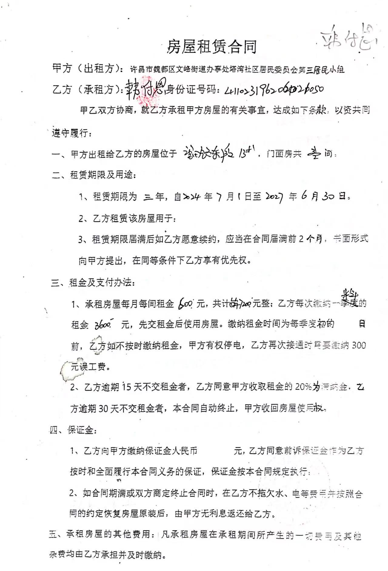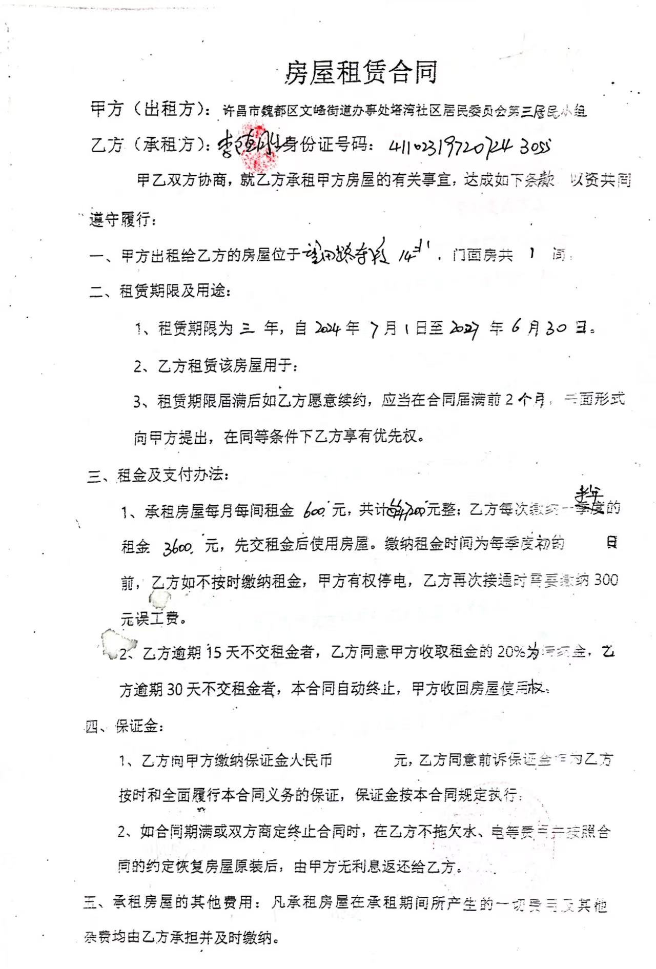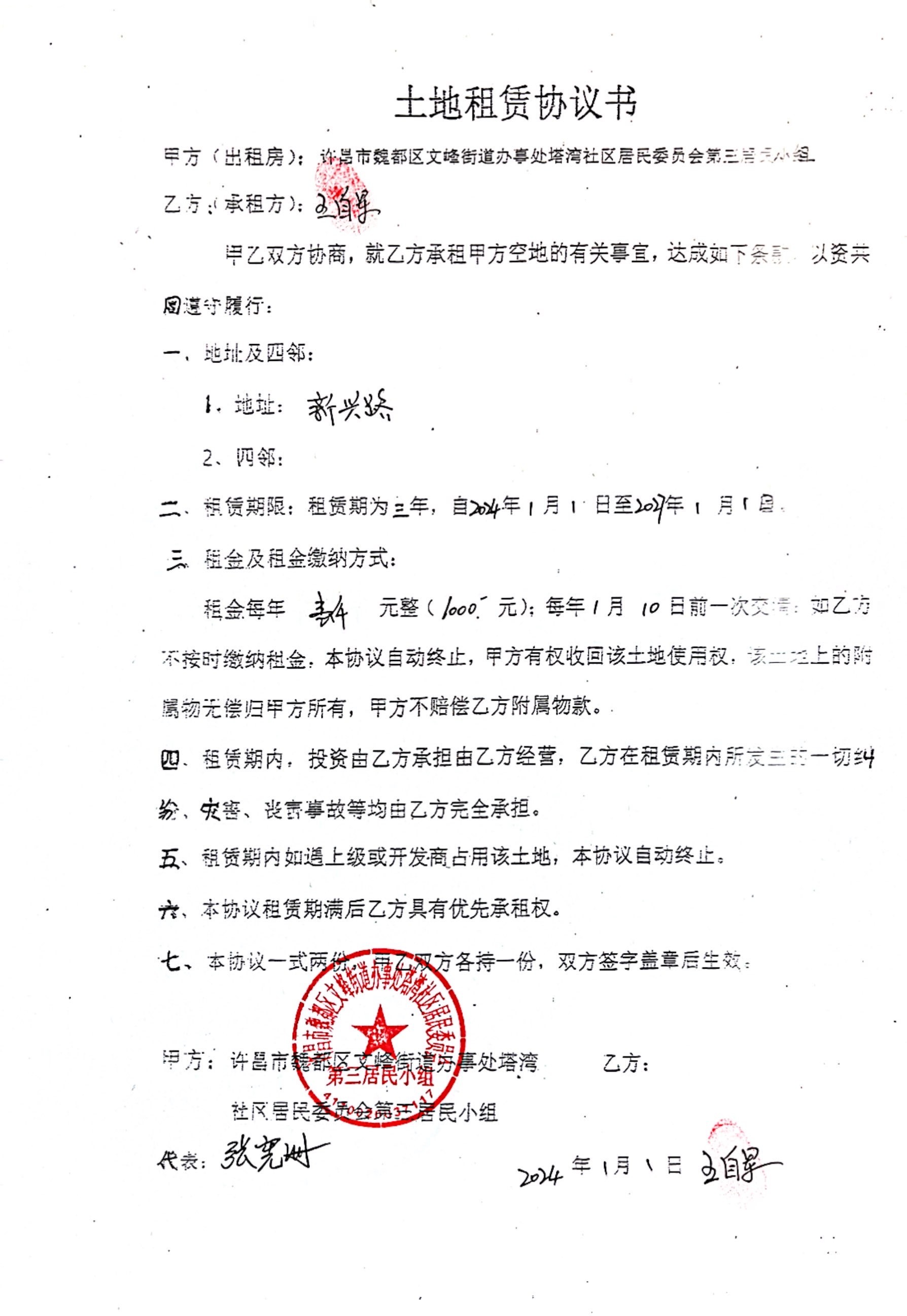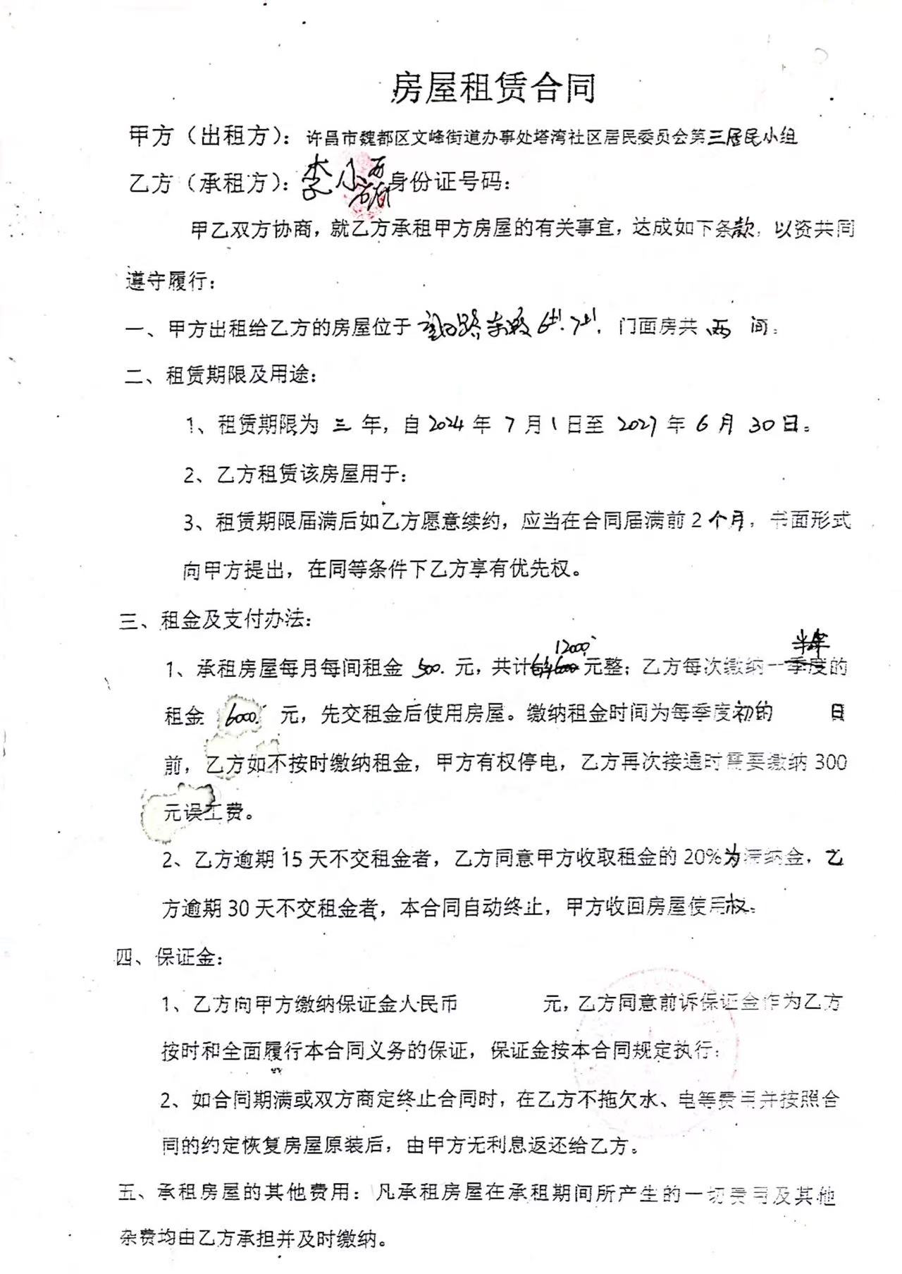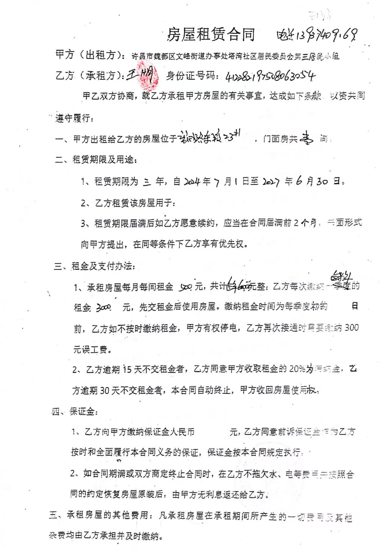 文峰办事处塔湾社区第四居民小组门面房及场院租赁协议