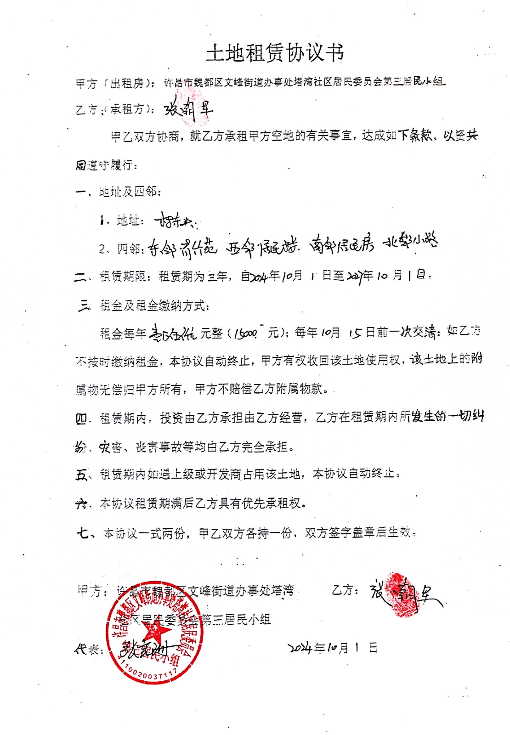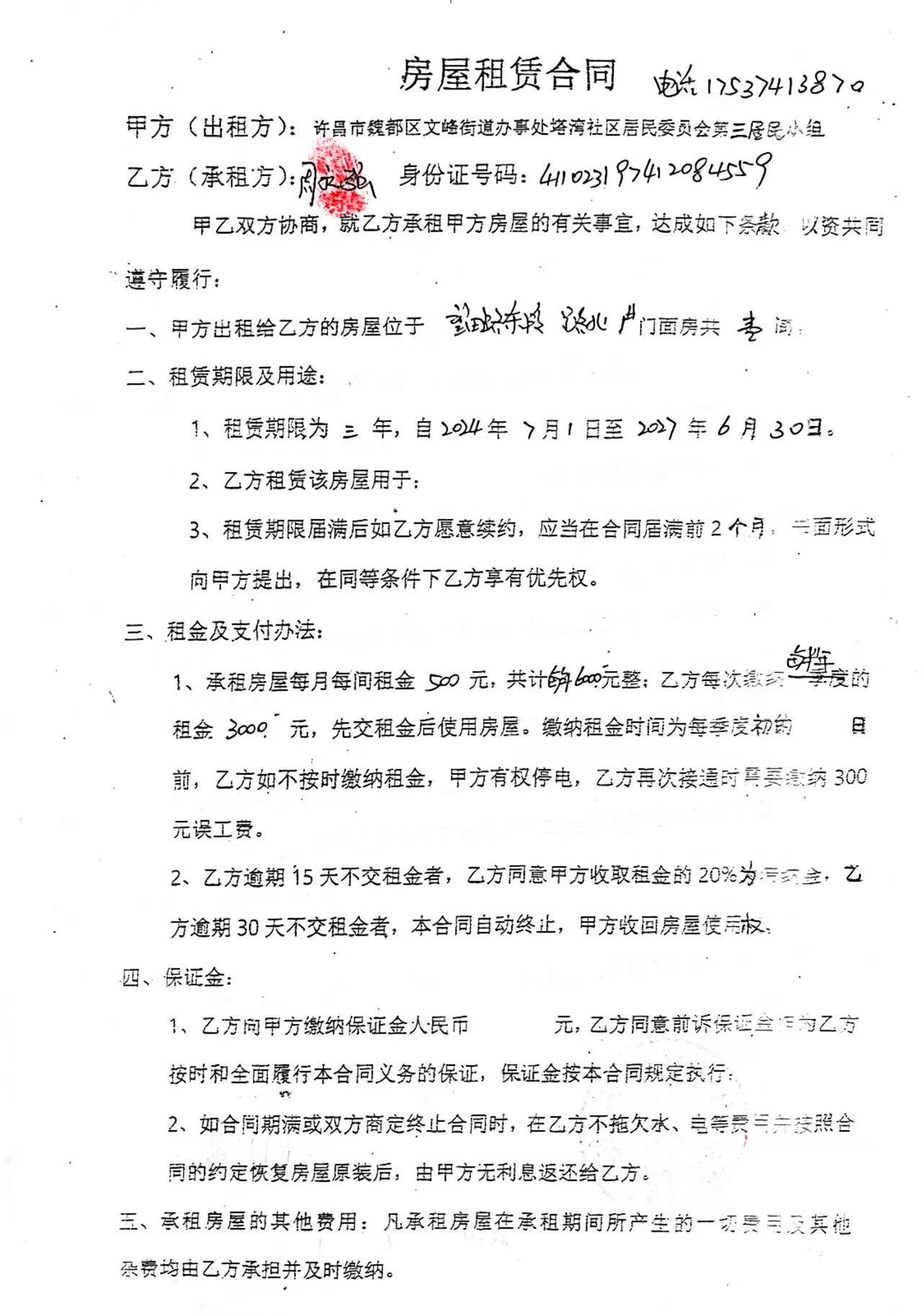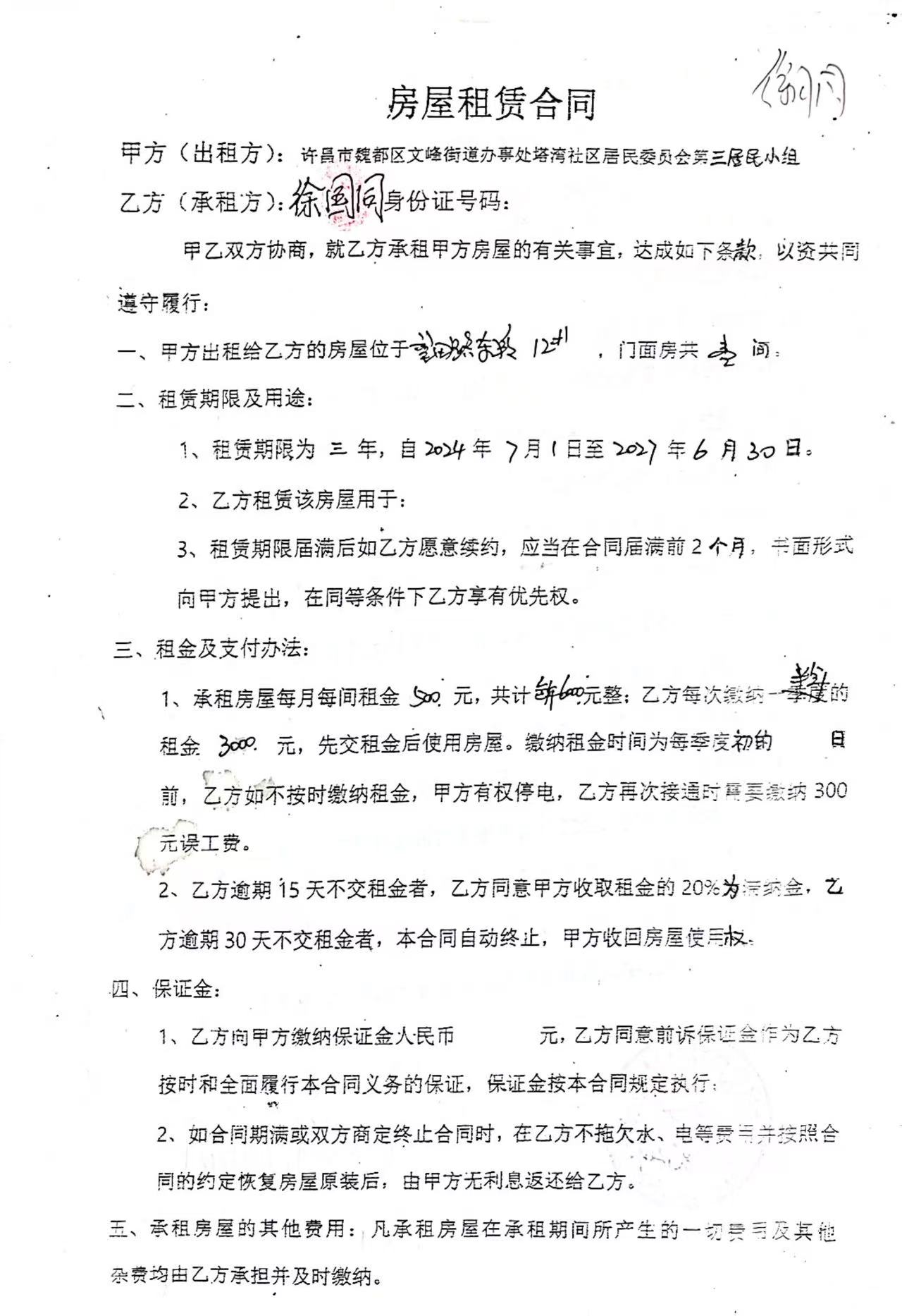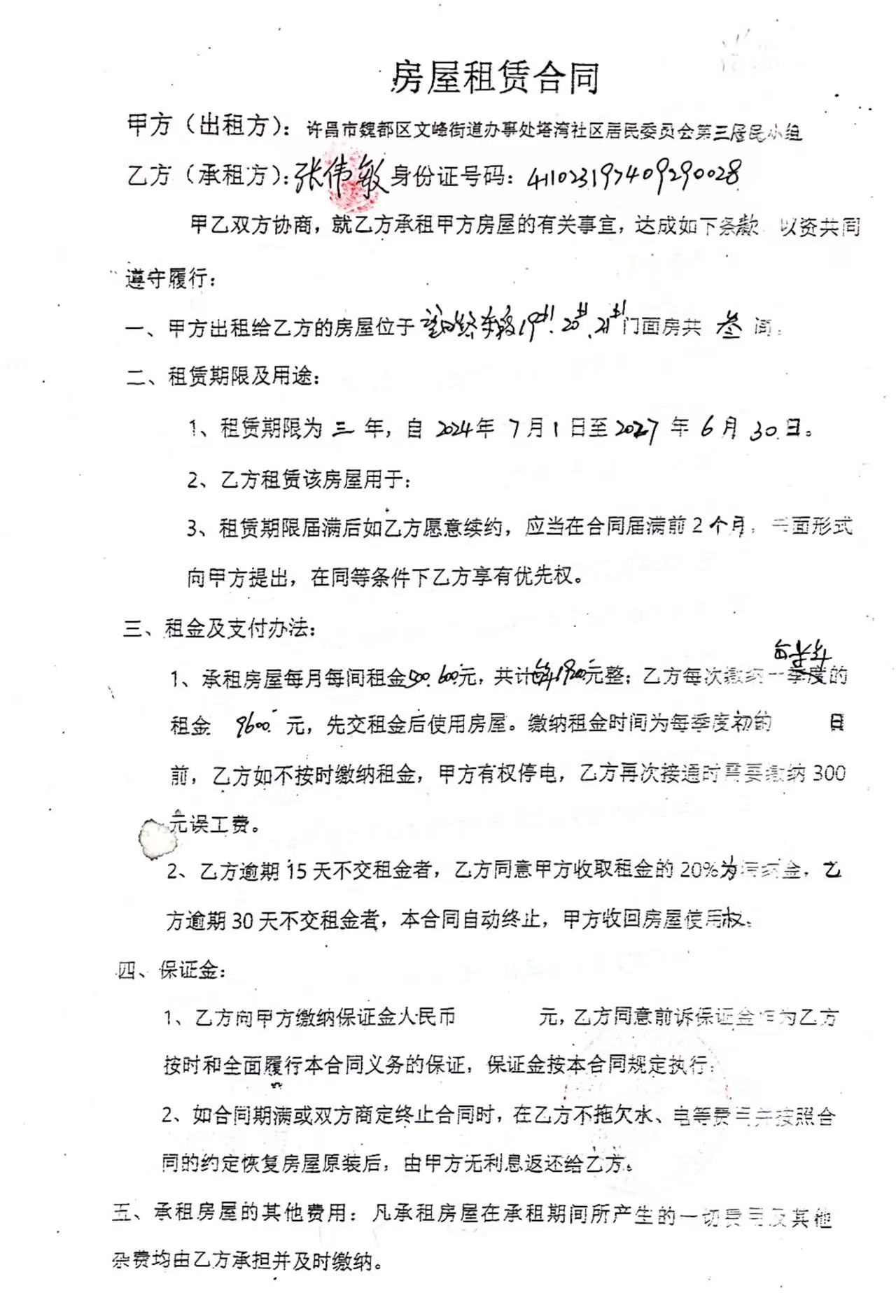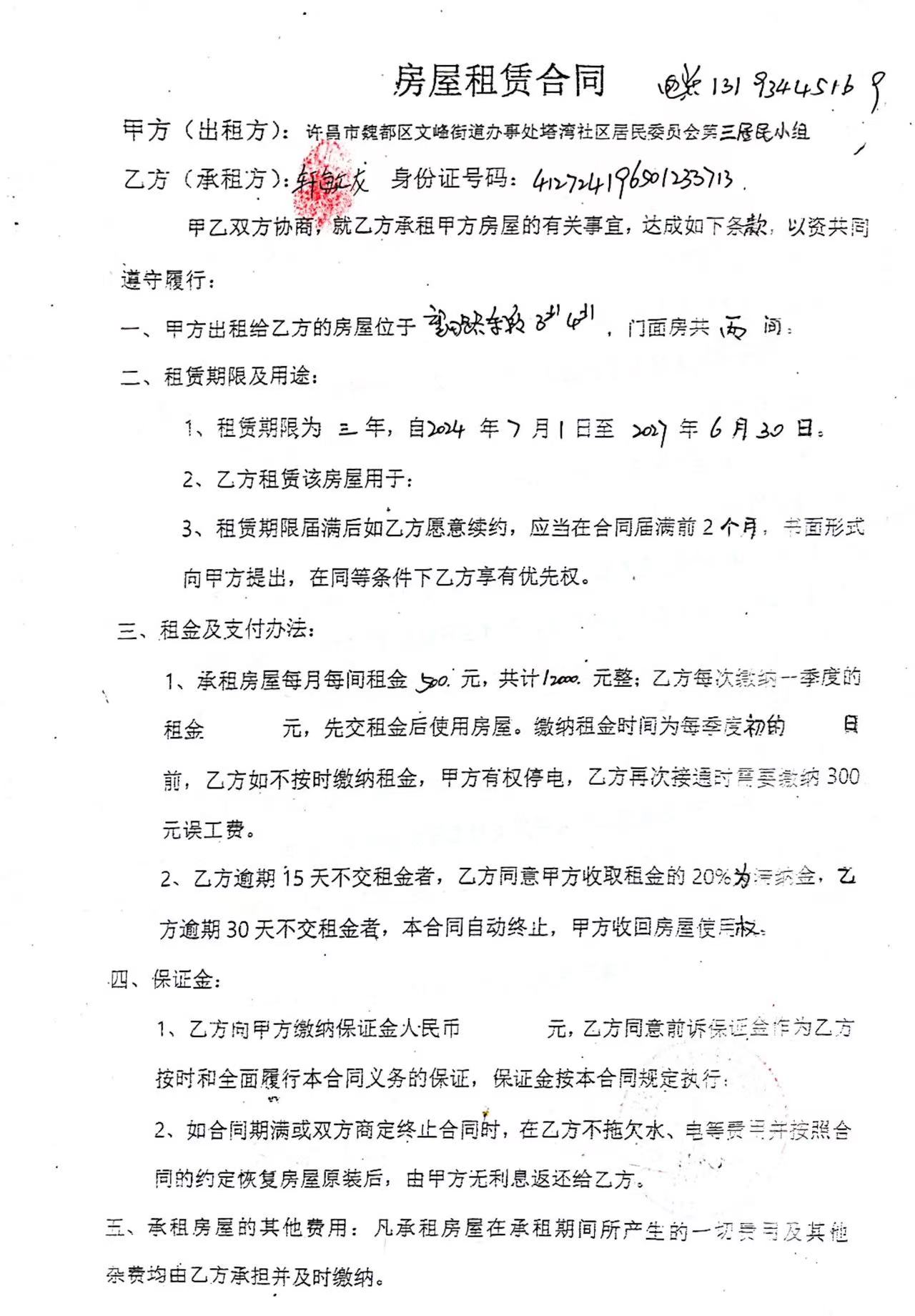 文峰办事处塔湾社区第四居民小组门面房及场院租赁协议
