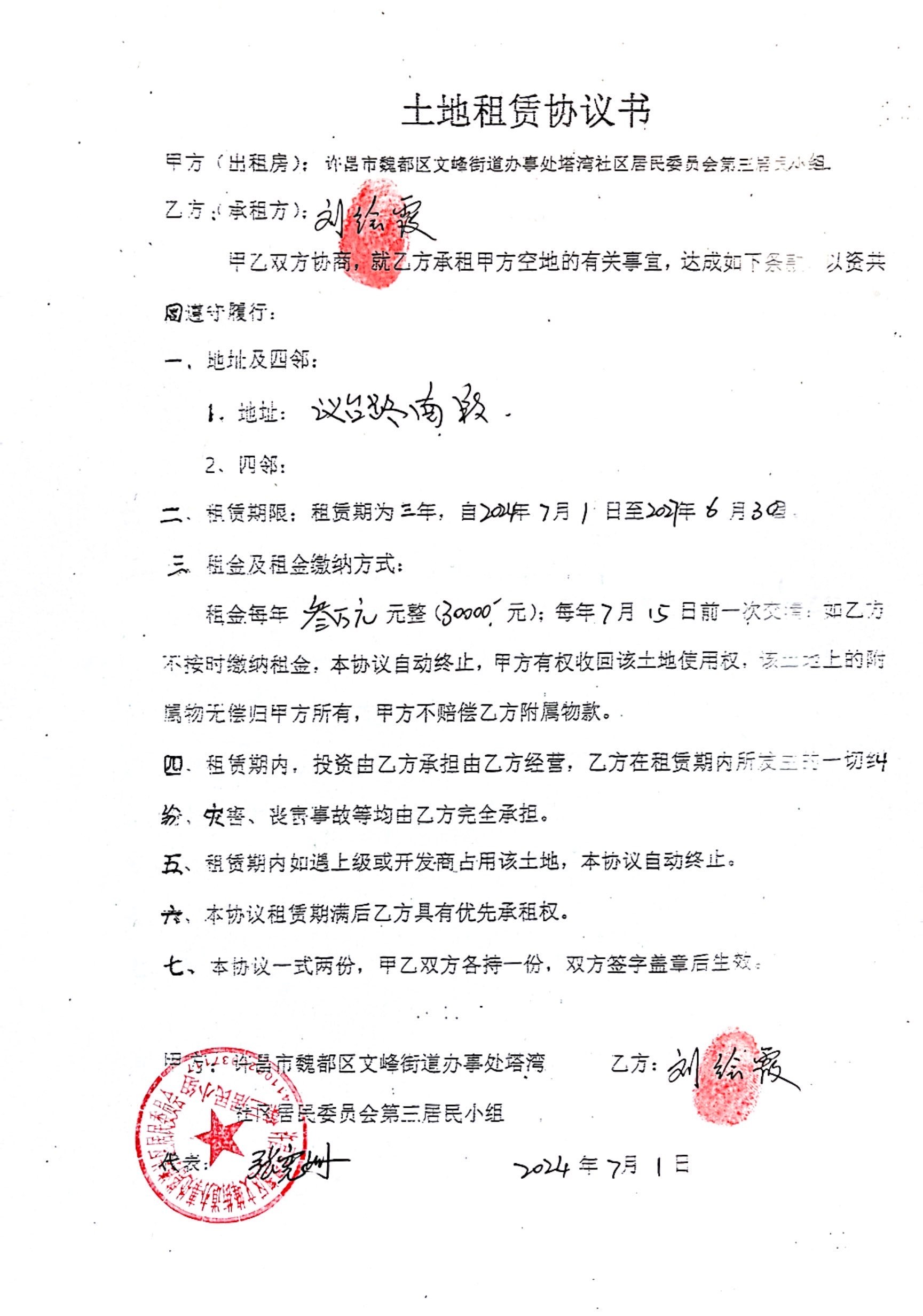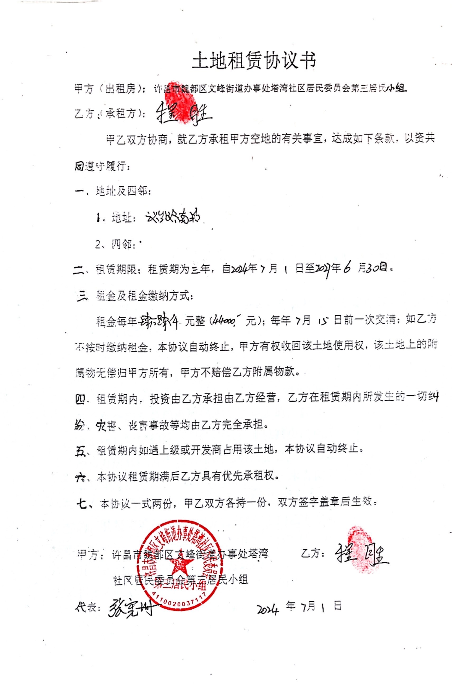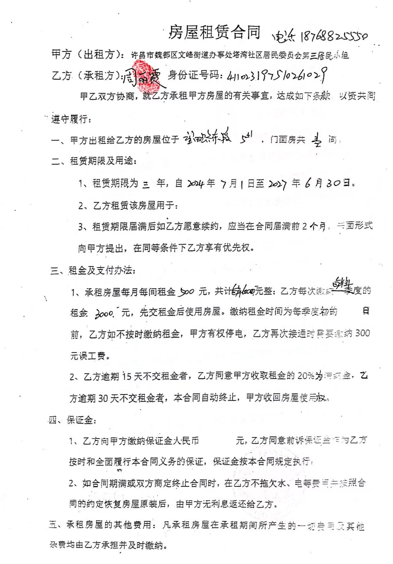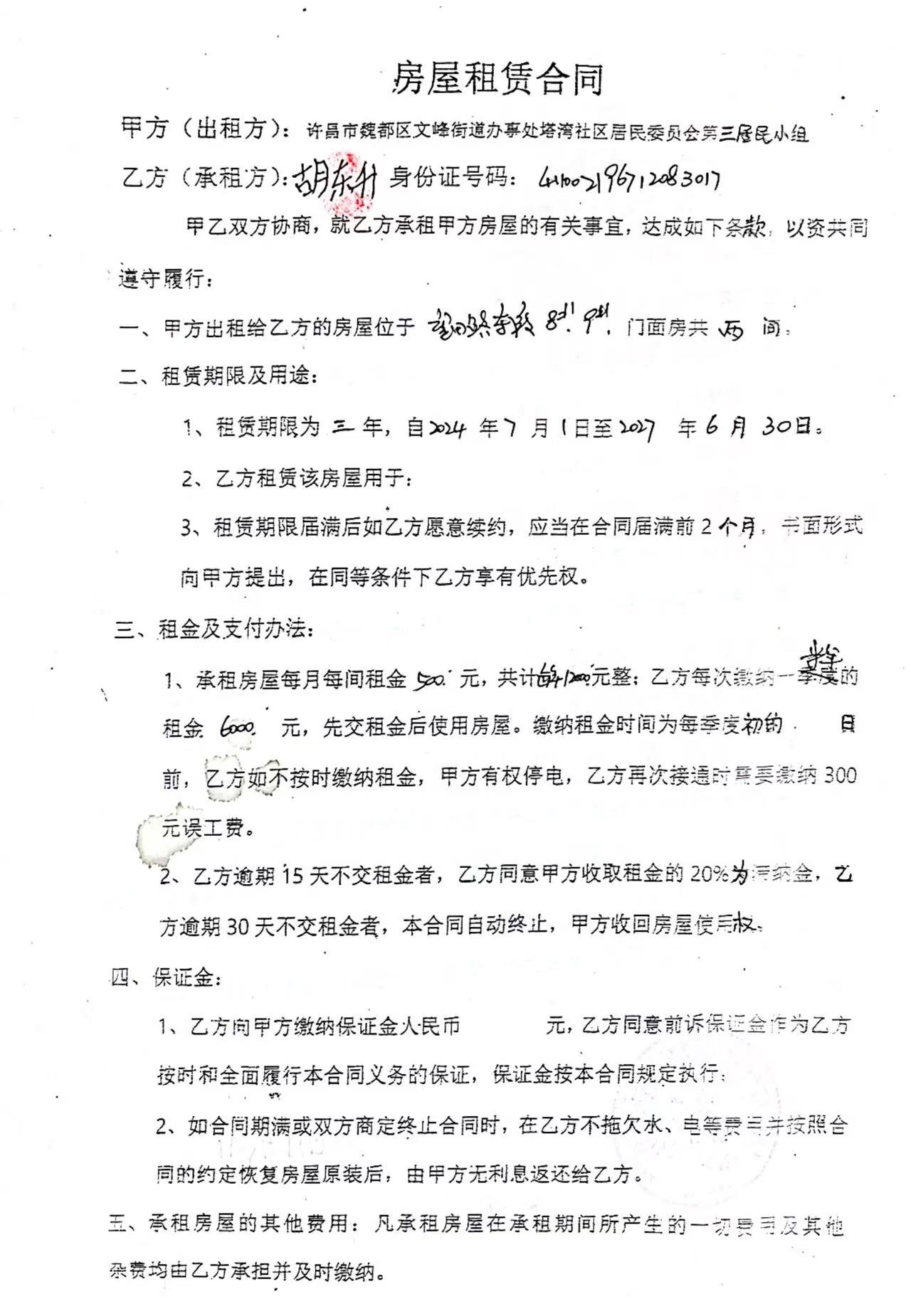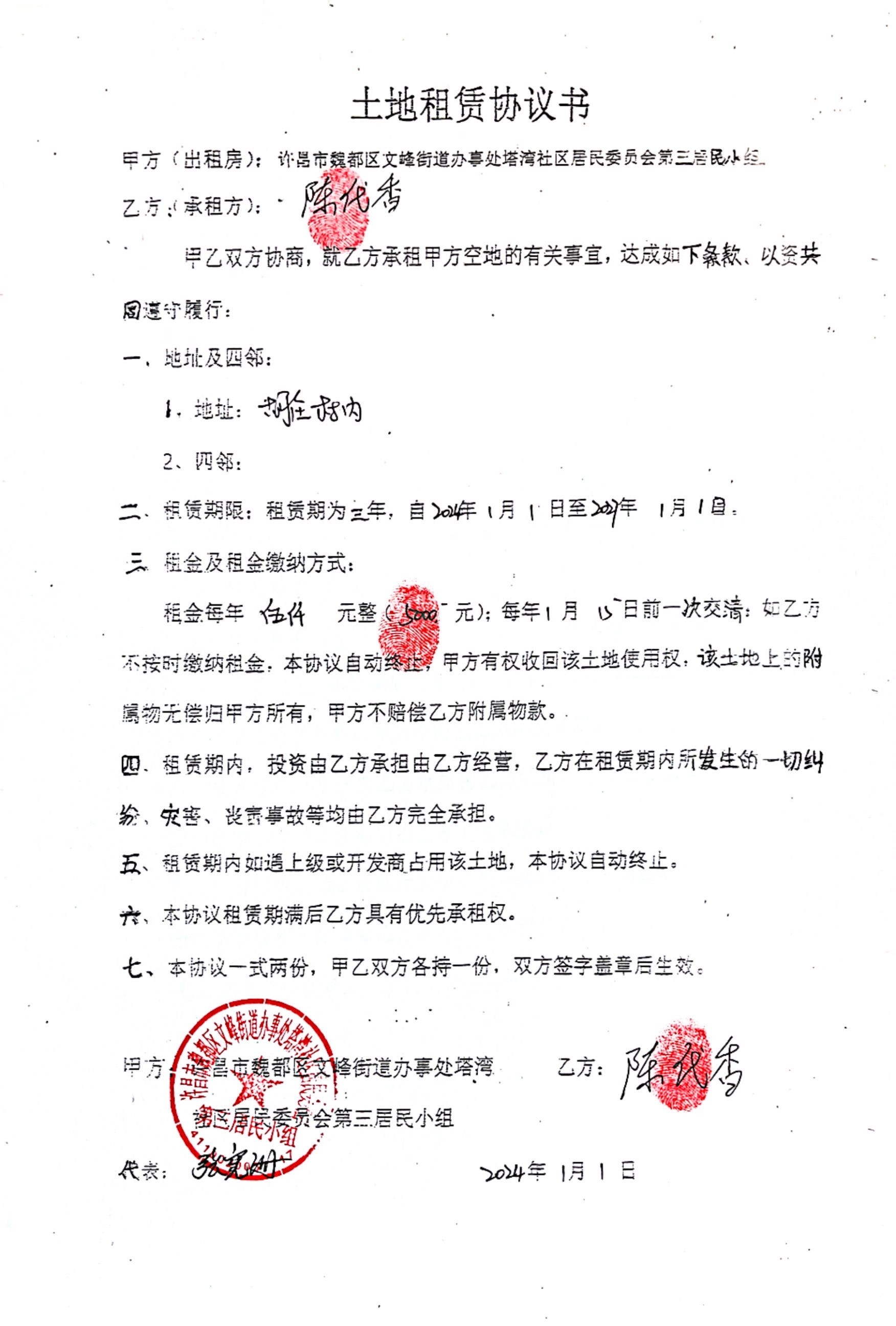 文峰办事处塔湾社区第四居民小组门面房及场院租赁协议