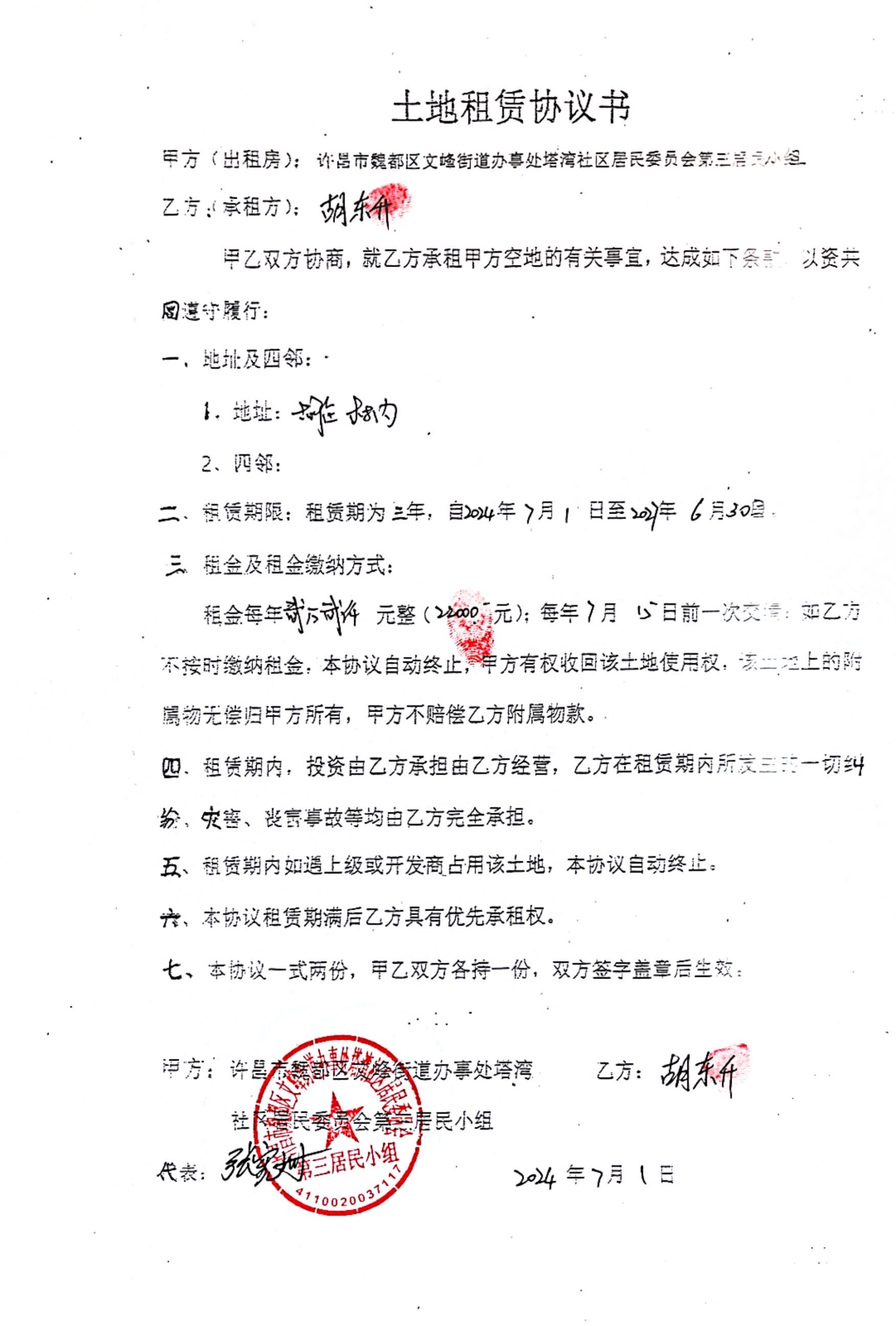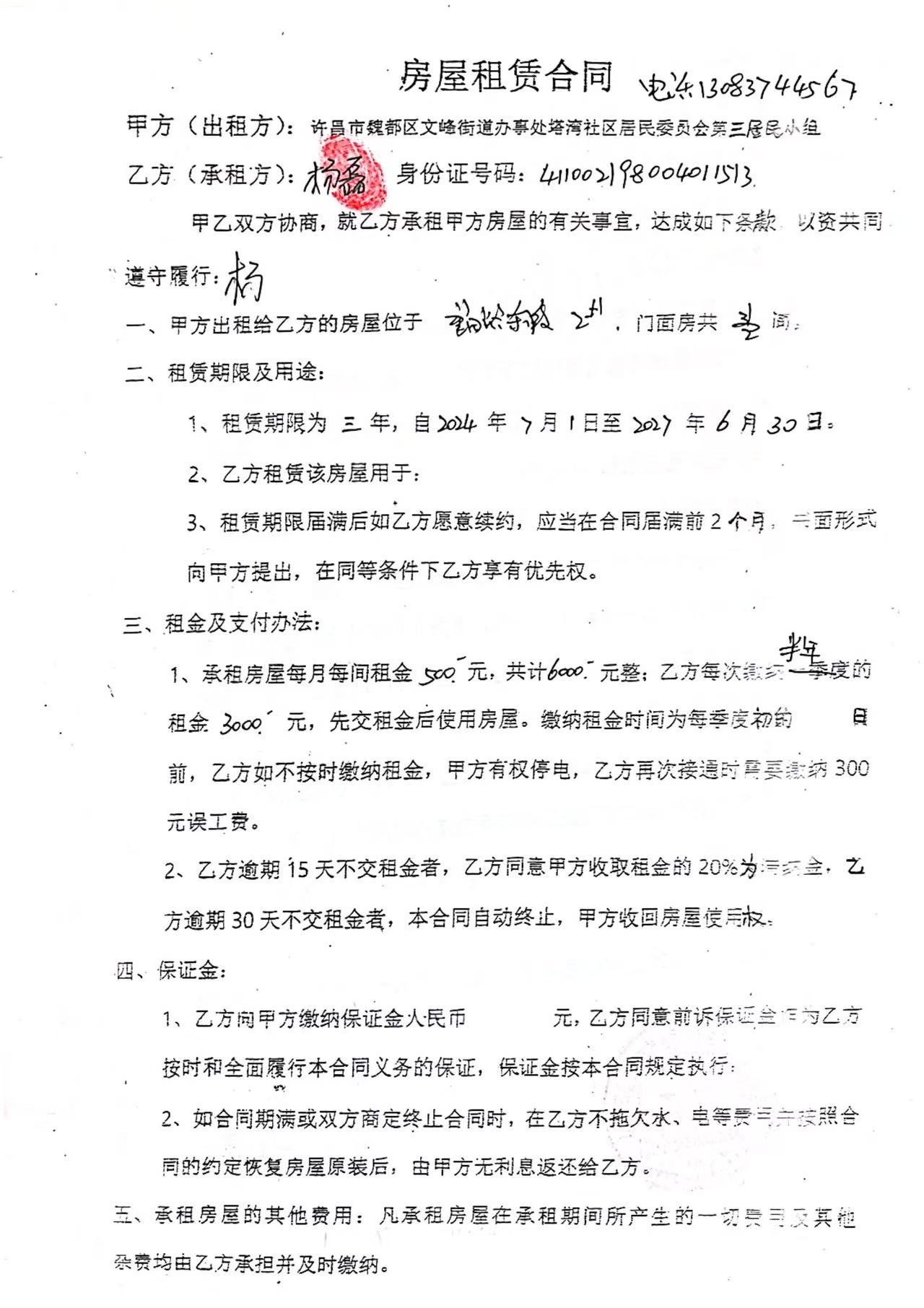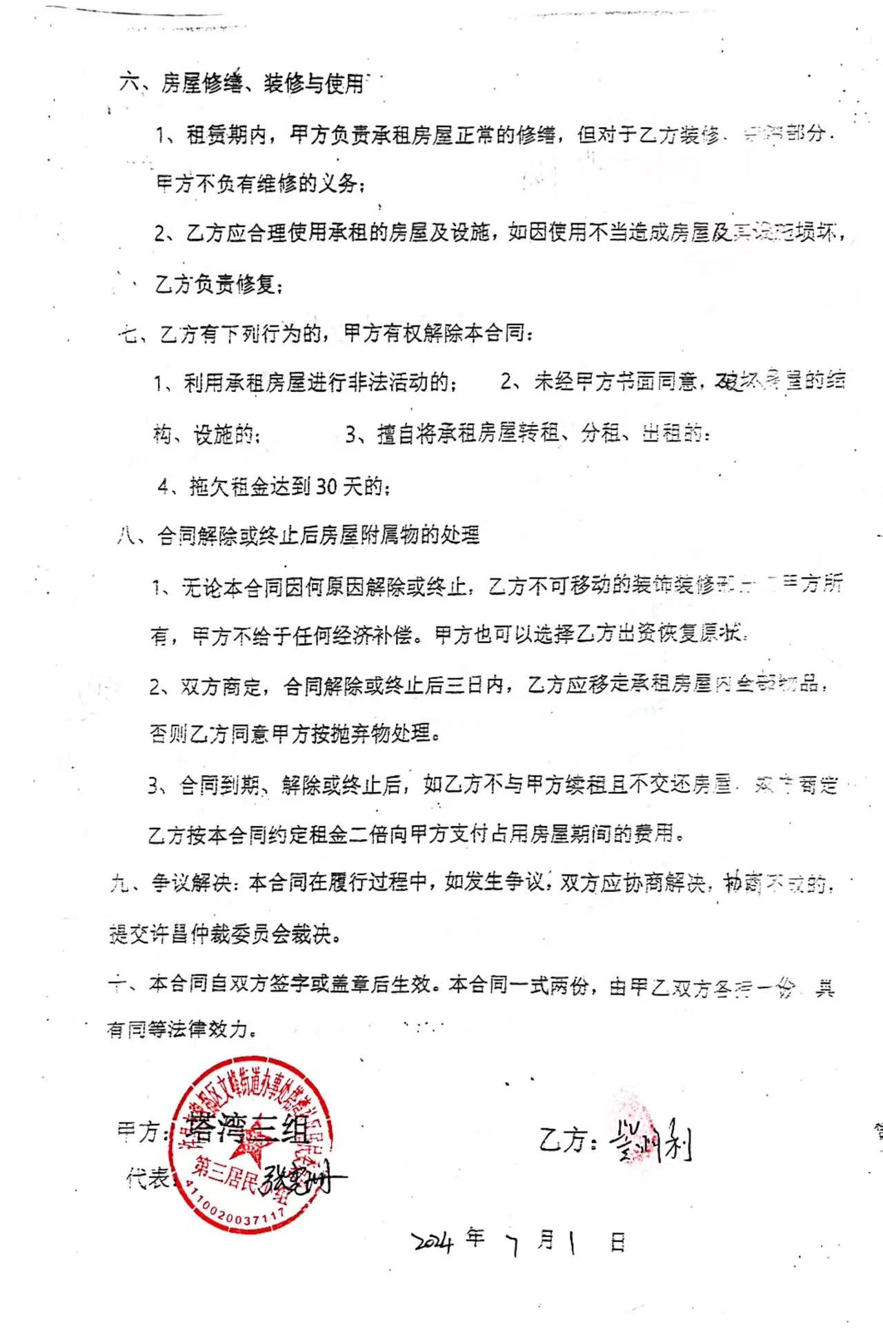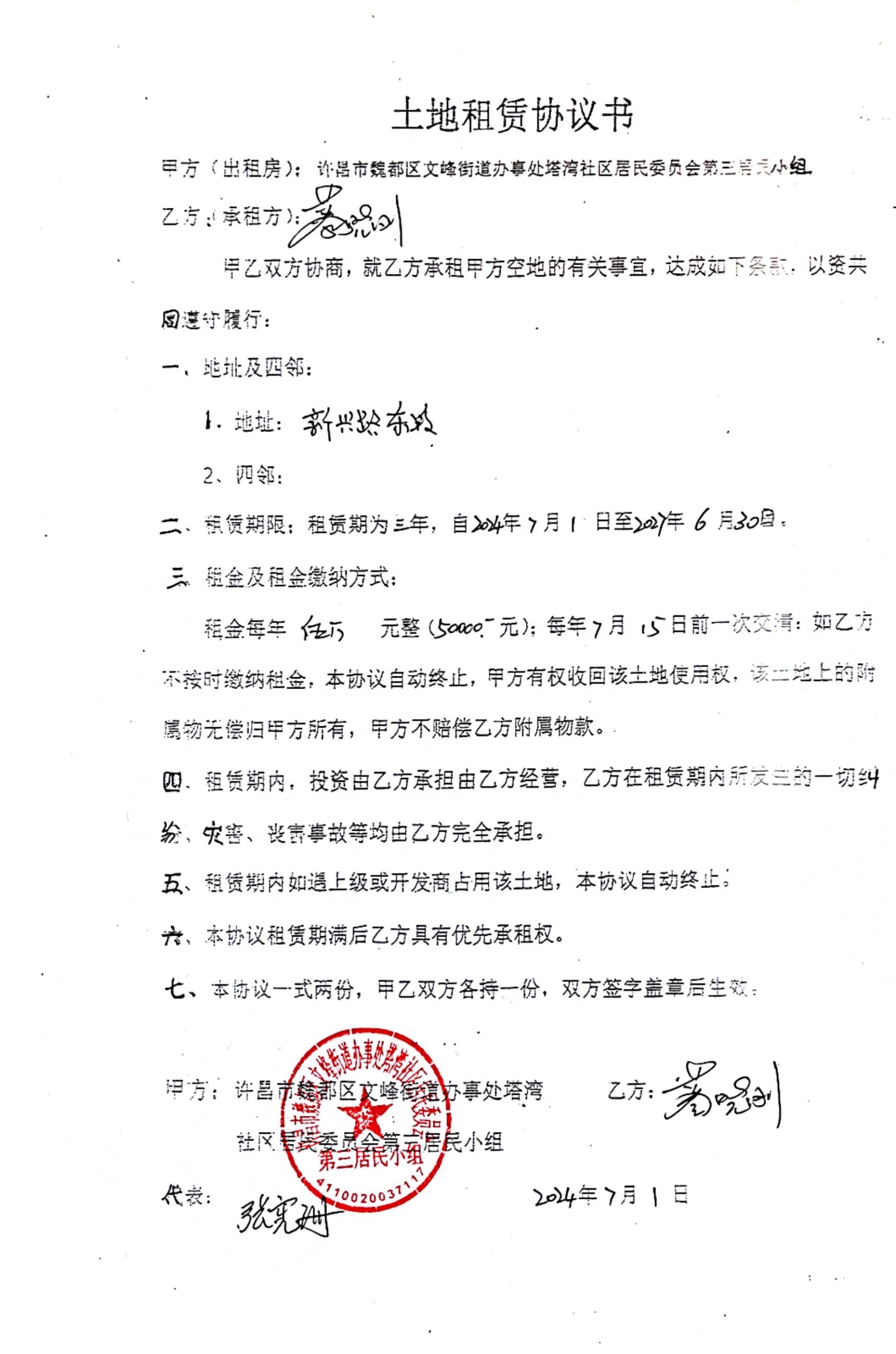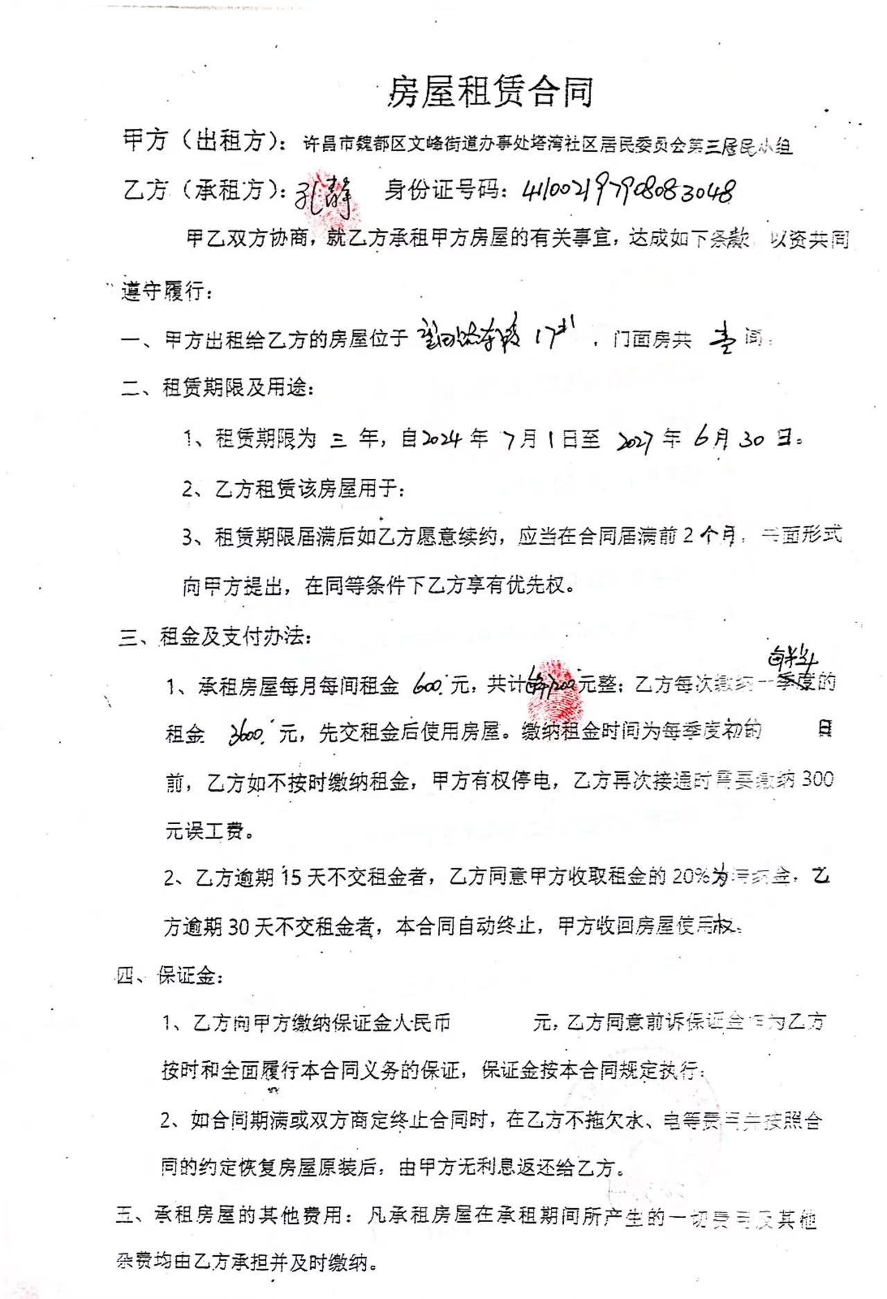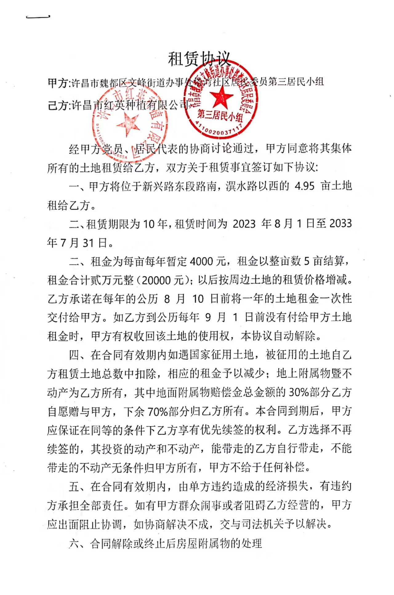 文峰办事处塔湾社区第四居民小组门面房及场院租赁协议