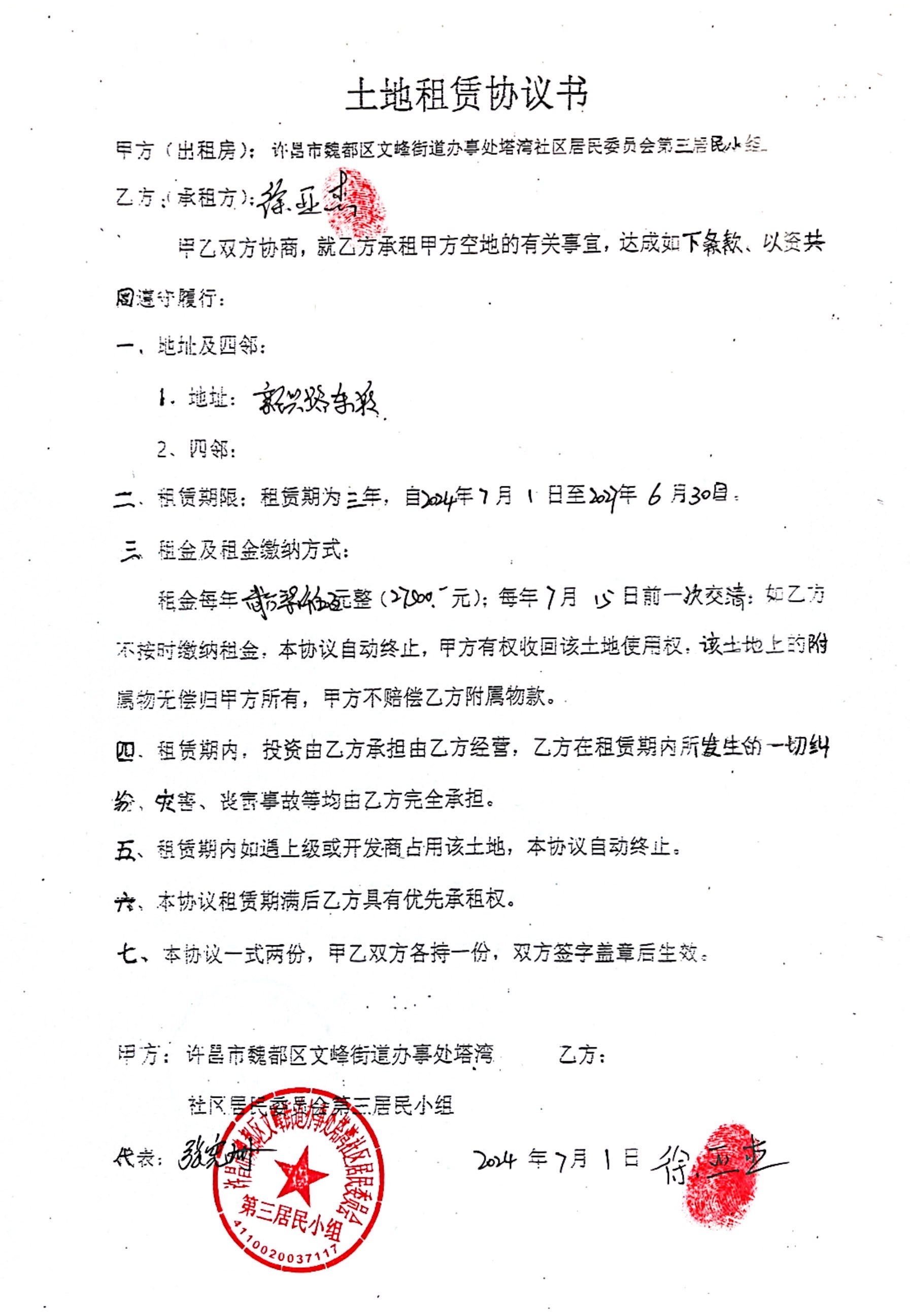 文峰办事处塔湾社区第三居民小组门面房及场院租赁协议