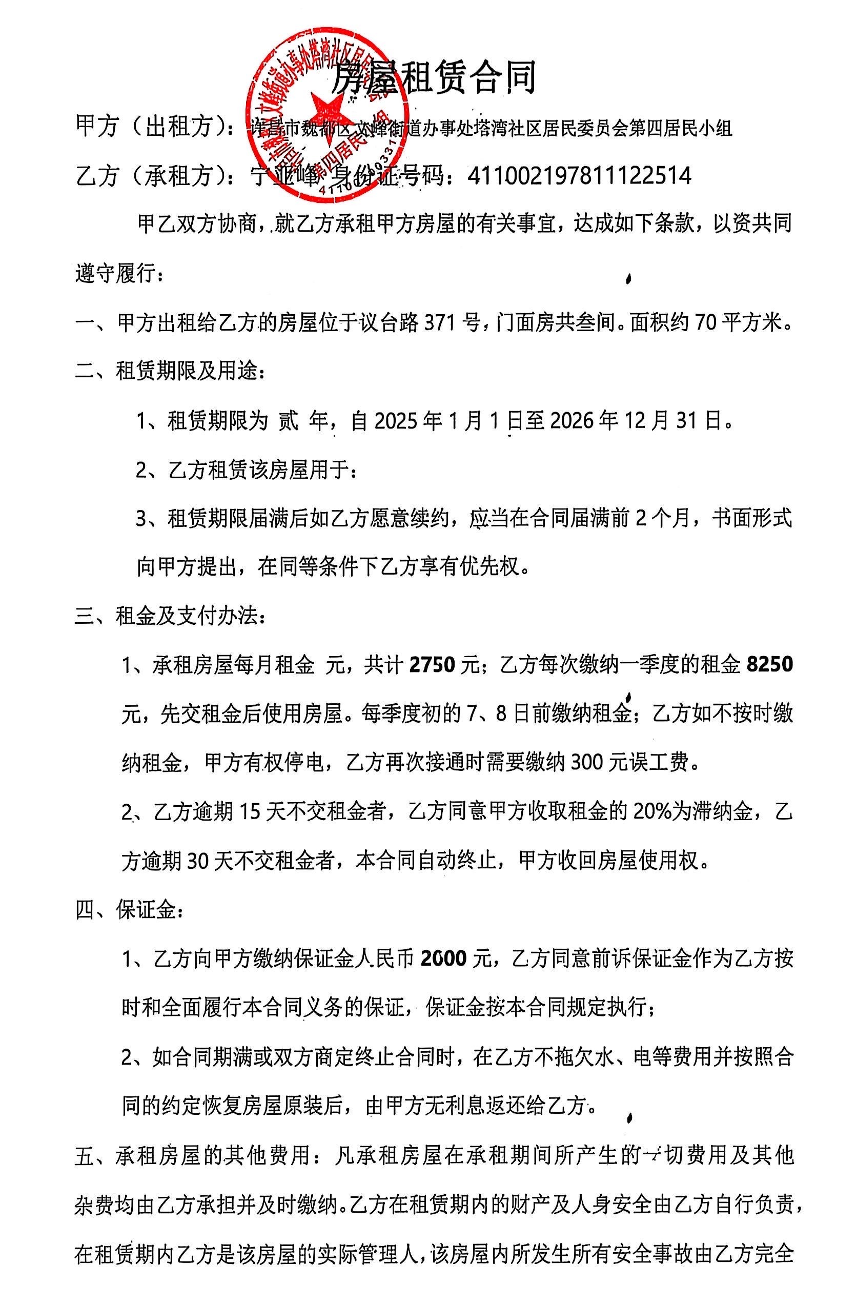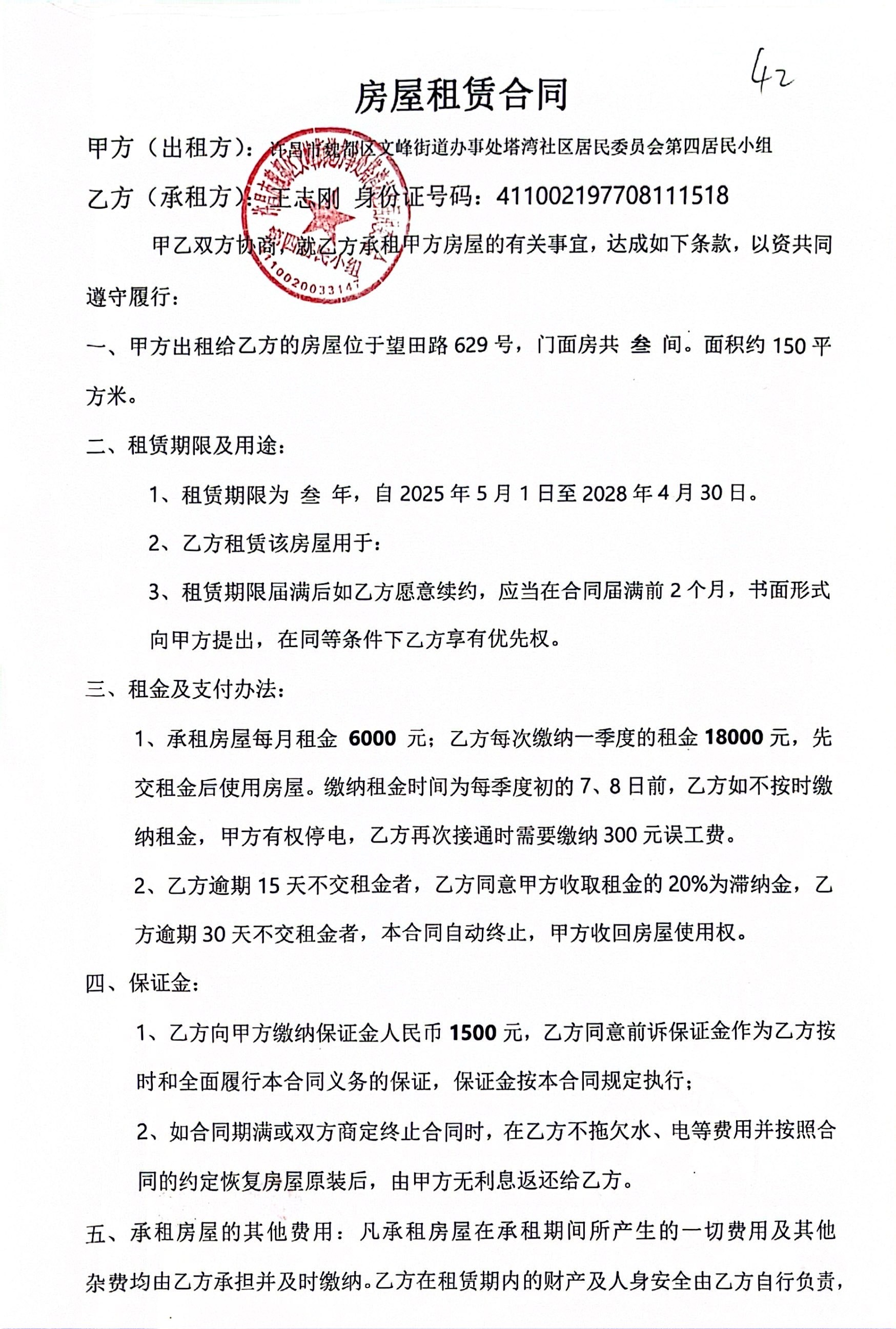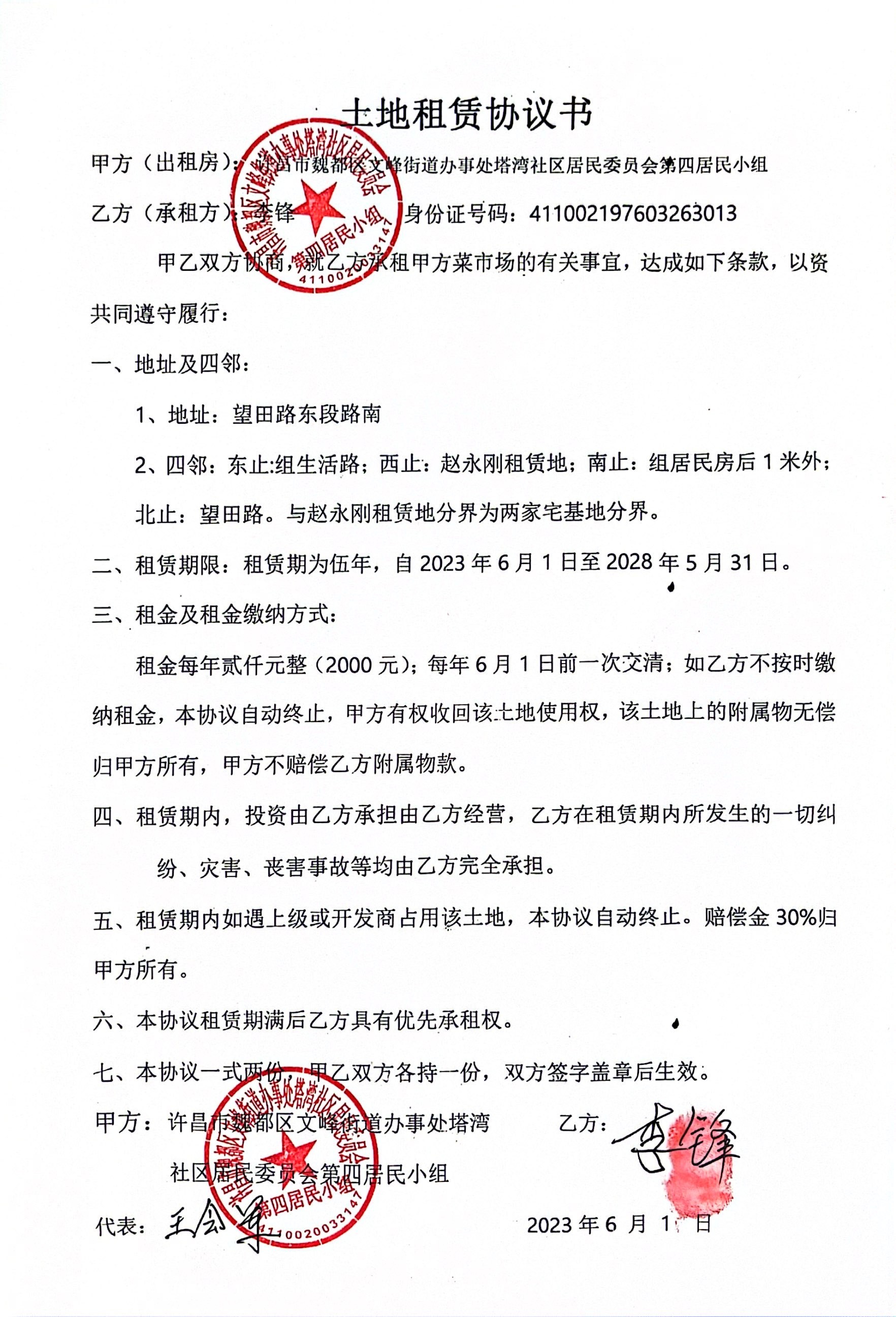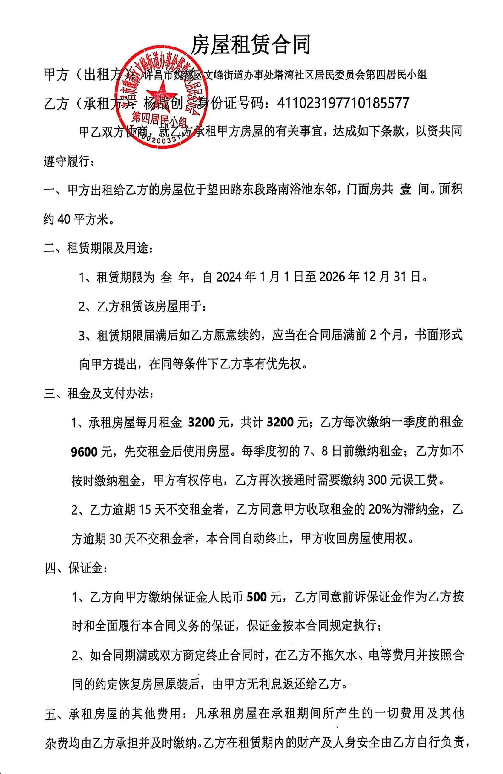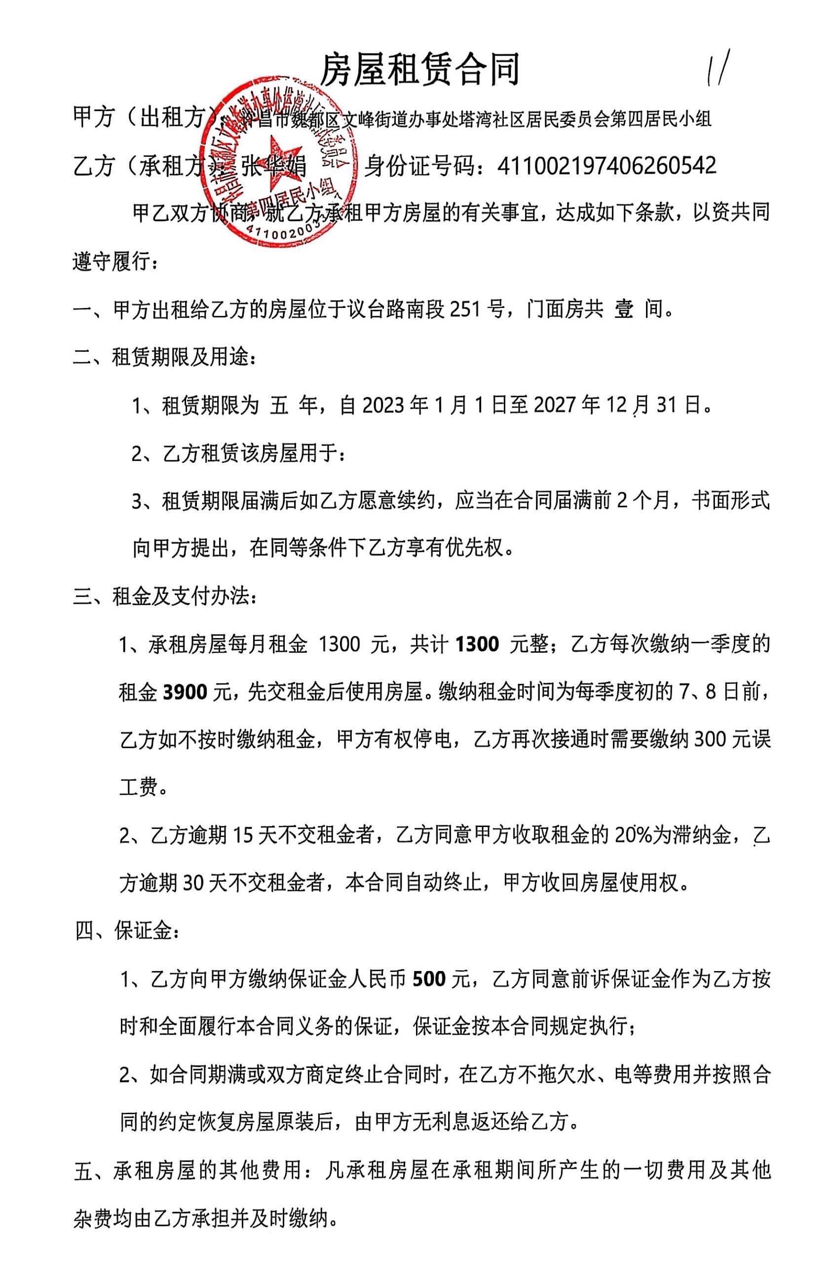文峰办事处塔湾社区第五居民小组门面房及场院租赁协议